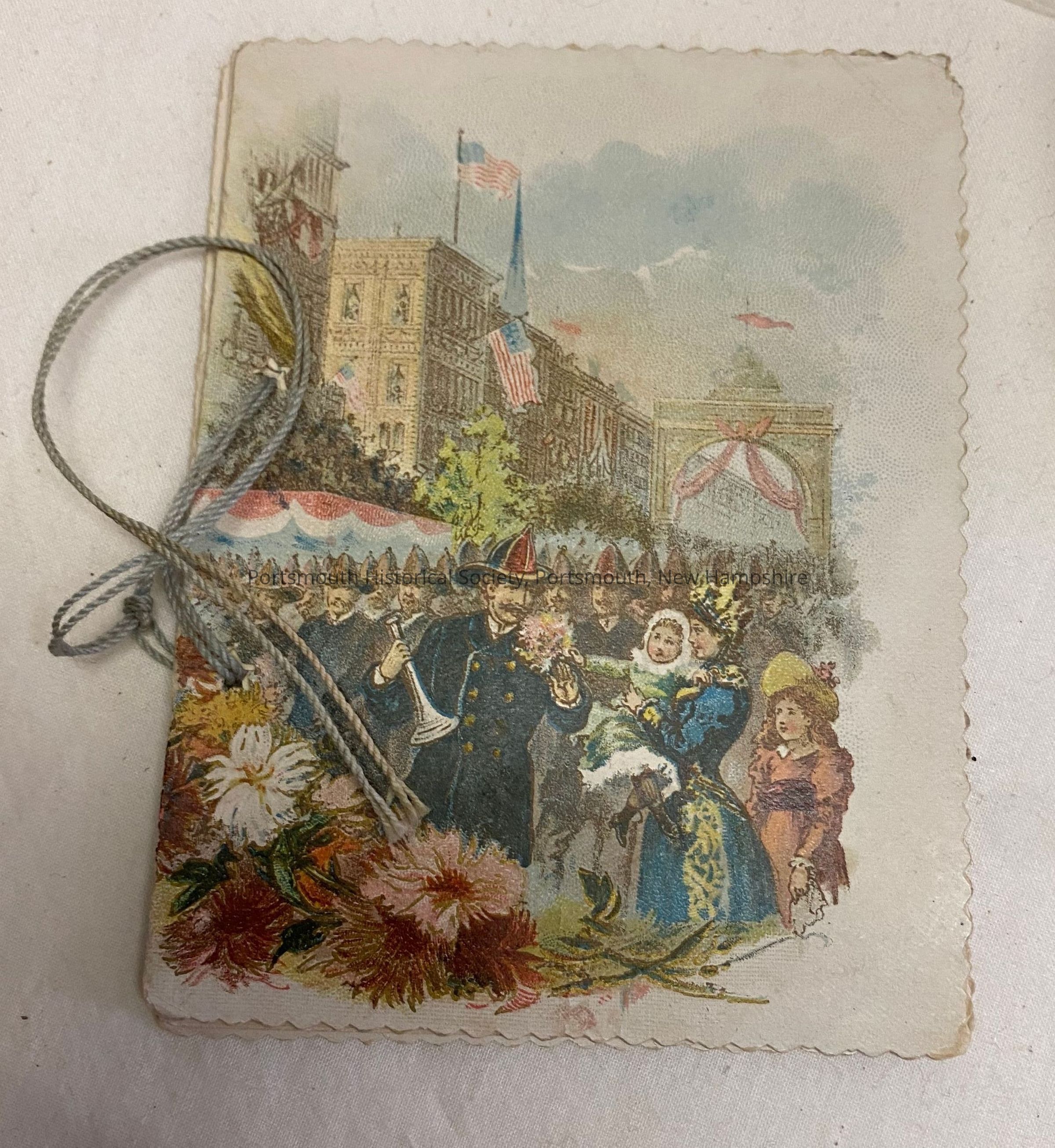 Four of eight dance cards for the Kearsarge Fireman's Ball. This is from the eighteenth annual ball held on December 29, 1893. The front has an image of a parade of firemen with one highlighted in the foreground with a woman holding an infant and a young girl. The pencil is missing but string is still attached.Acquisition