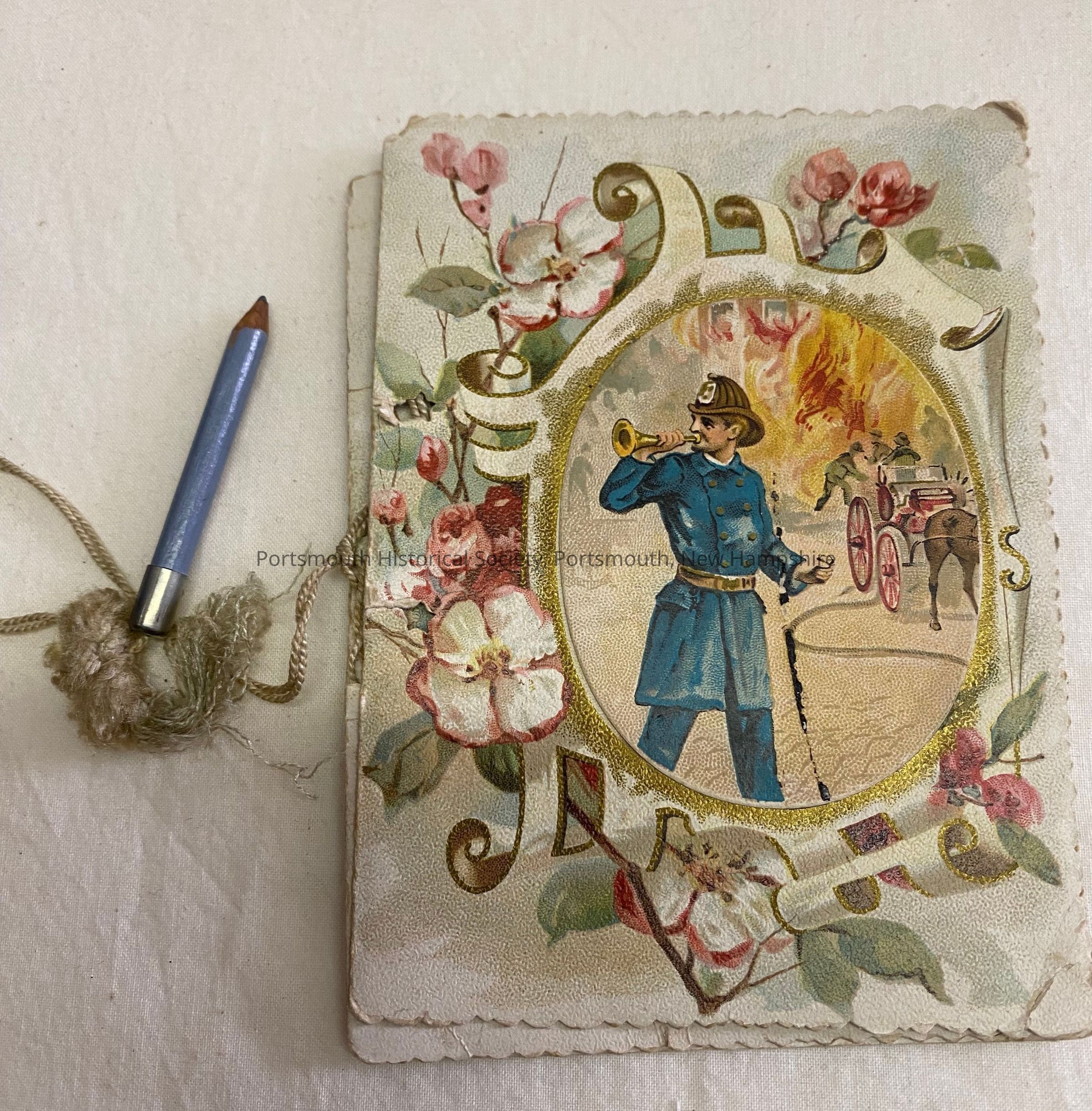 Dance card for the Fifth Annual Charity Ball of Storer Post held on November 29, 1893. The front has an image of a fireman blowing a trumpet with another is the background fighting a fire. A blue pencil is attached with string.Acquisition