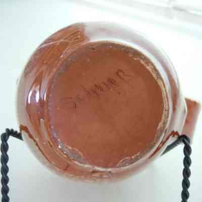 Scheier pottery, small pitcher or creamer with scrolled handle and circular foot., with swelled body rising to flared spout; yellow and brown mottled glaze incised with decoration on lower half.