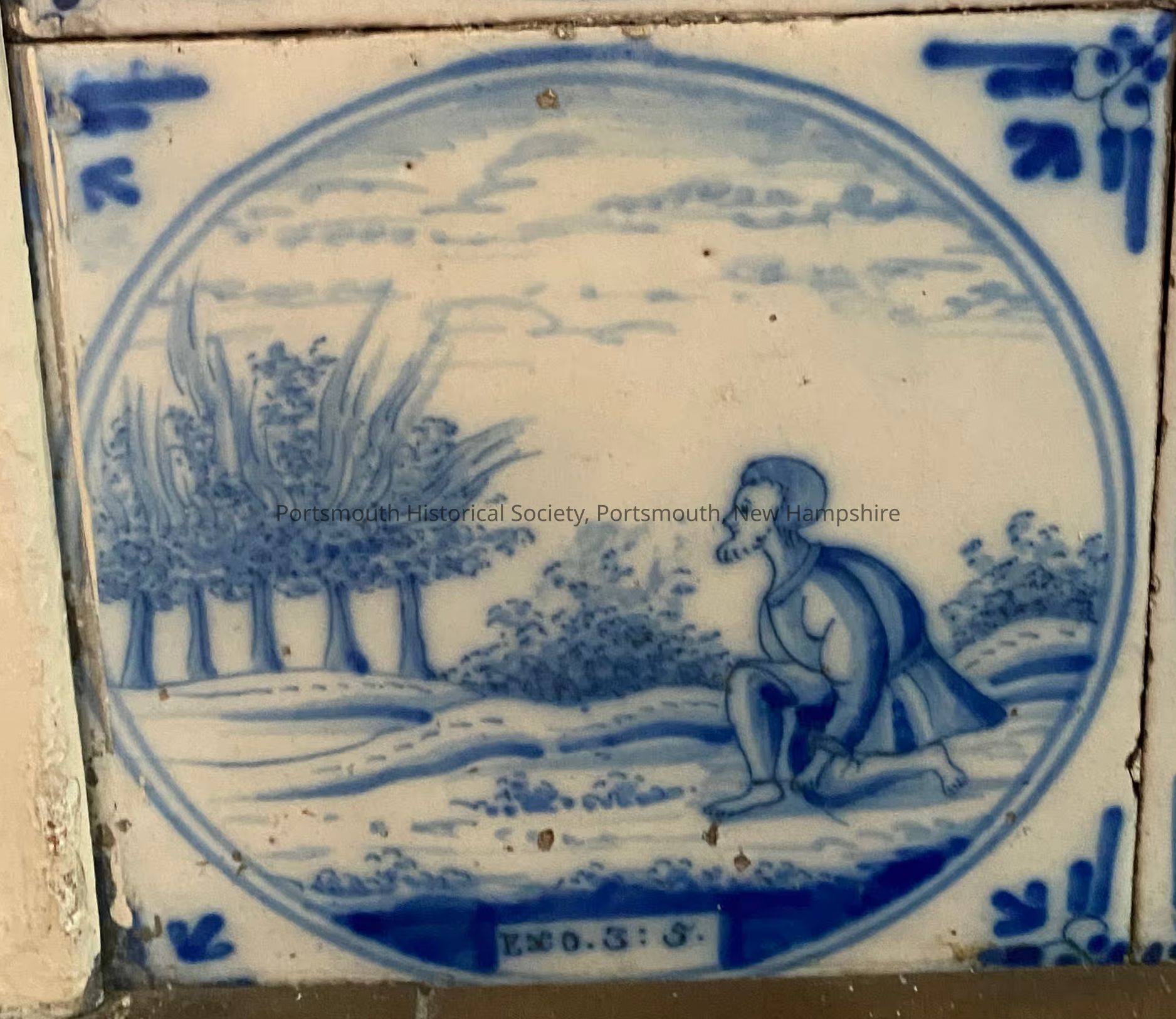 Blue and white Delft ceramic tile with ox-head borders. Image is of a man on bending knee in front of a forest. Underneath is "EXO. 5:5" referencing Exodus chapter 3 verse 5.Collection