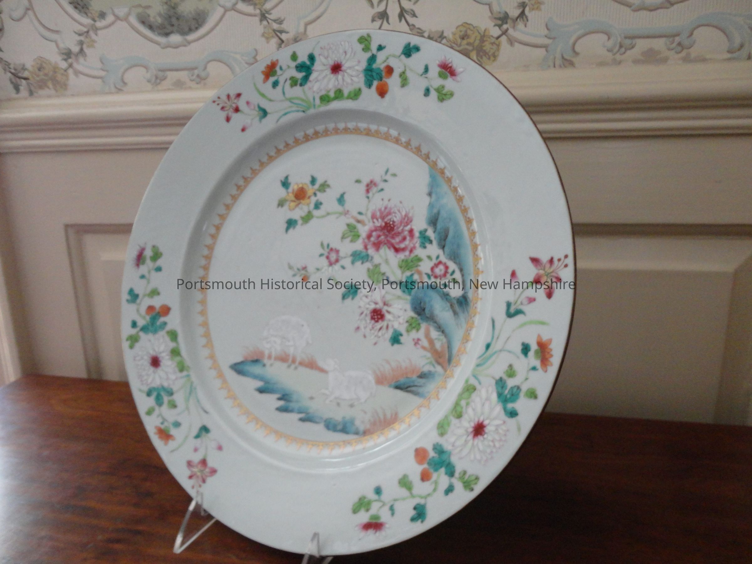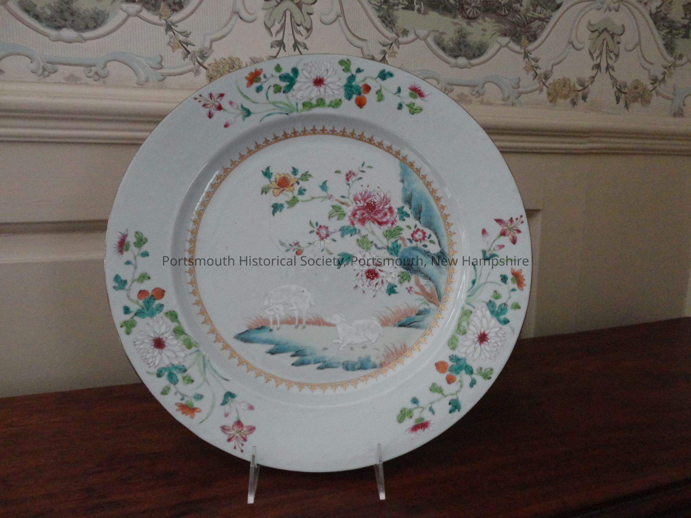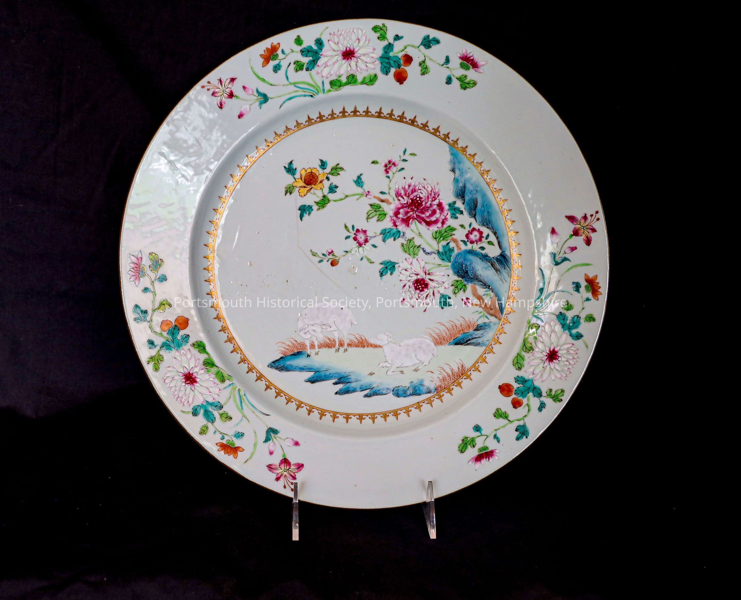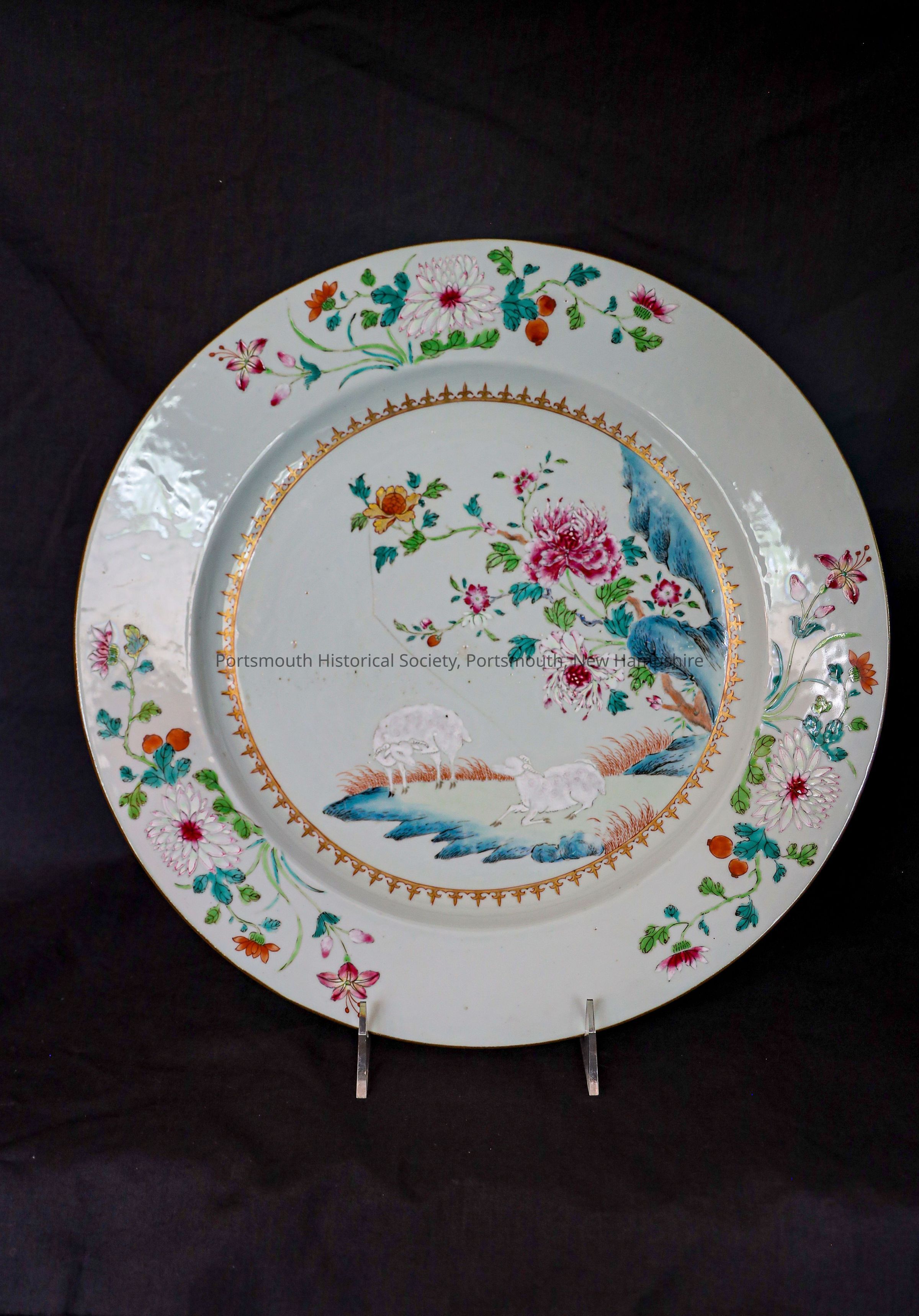 This rare, large, eighteenth-century Chinese export dish is decorated with two so-called "woolly sheep" beneath a large spray of flowers. Dishes of this service are thought to have been owned by the family of Gov. John Wentworth (1737-1820) of New Hampshire. Other examples are in the collections of the New Hampshire Historical Society, Historic New England, and Strawbery Banke Museum, as well as in private collections.Acquisition