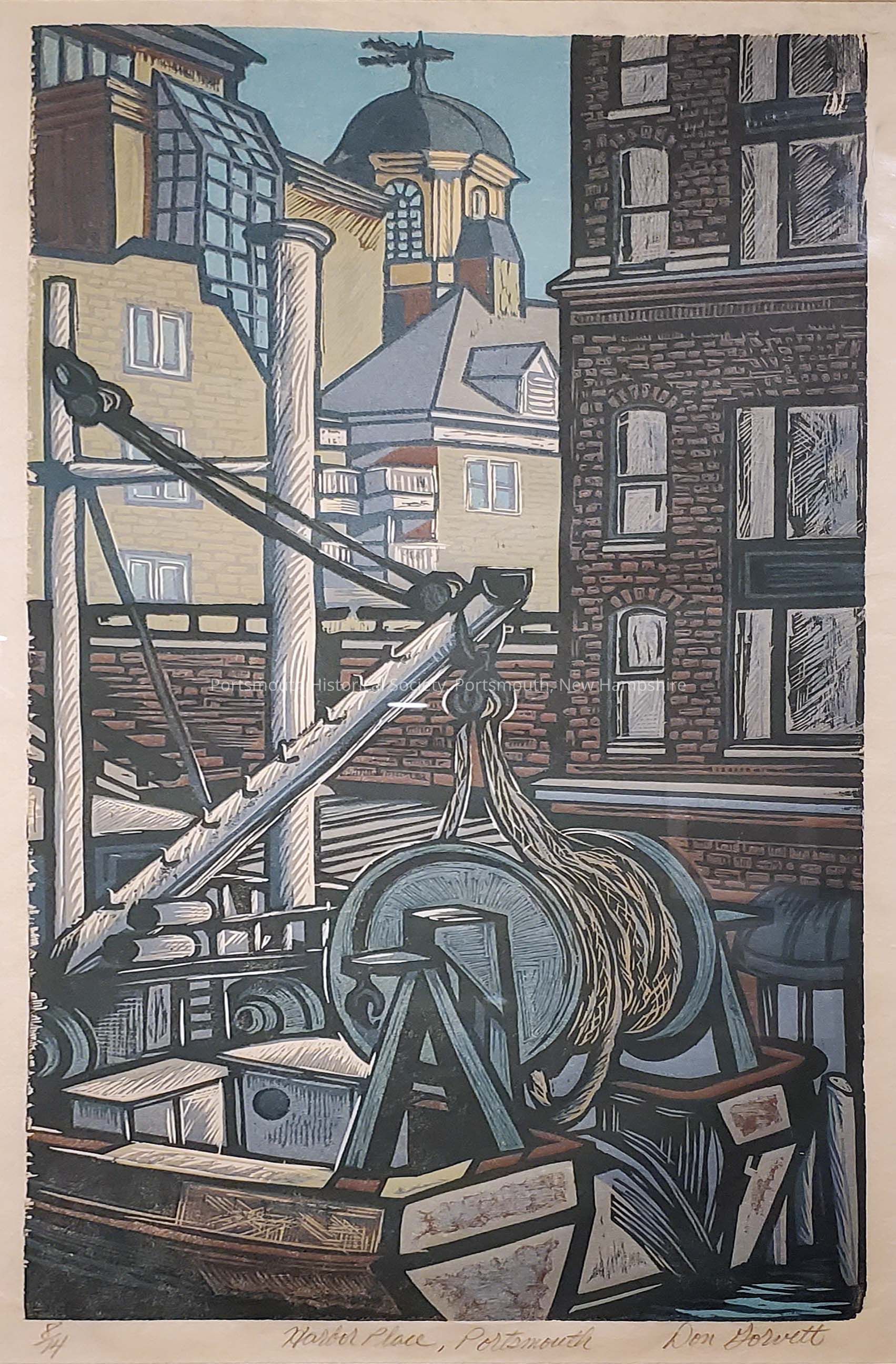Color reduction woodcut of Harbor Place in Portsmouth, New Hampshire.Acquisition