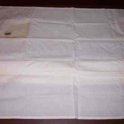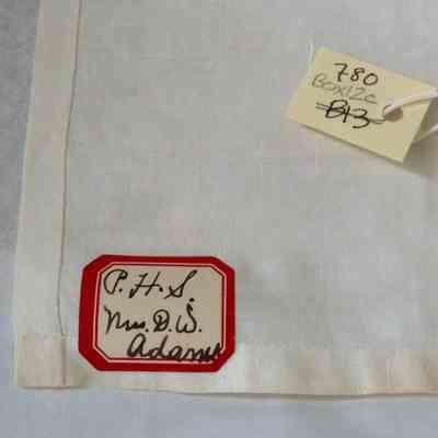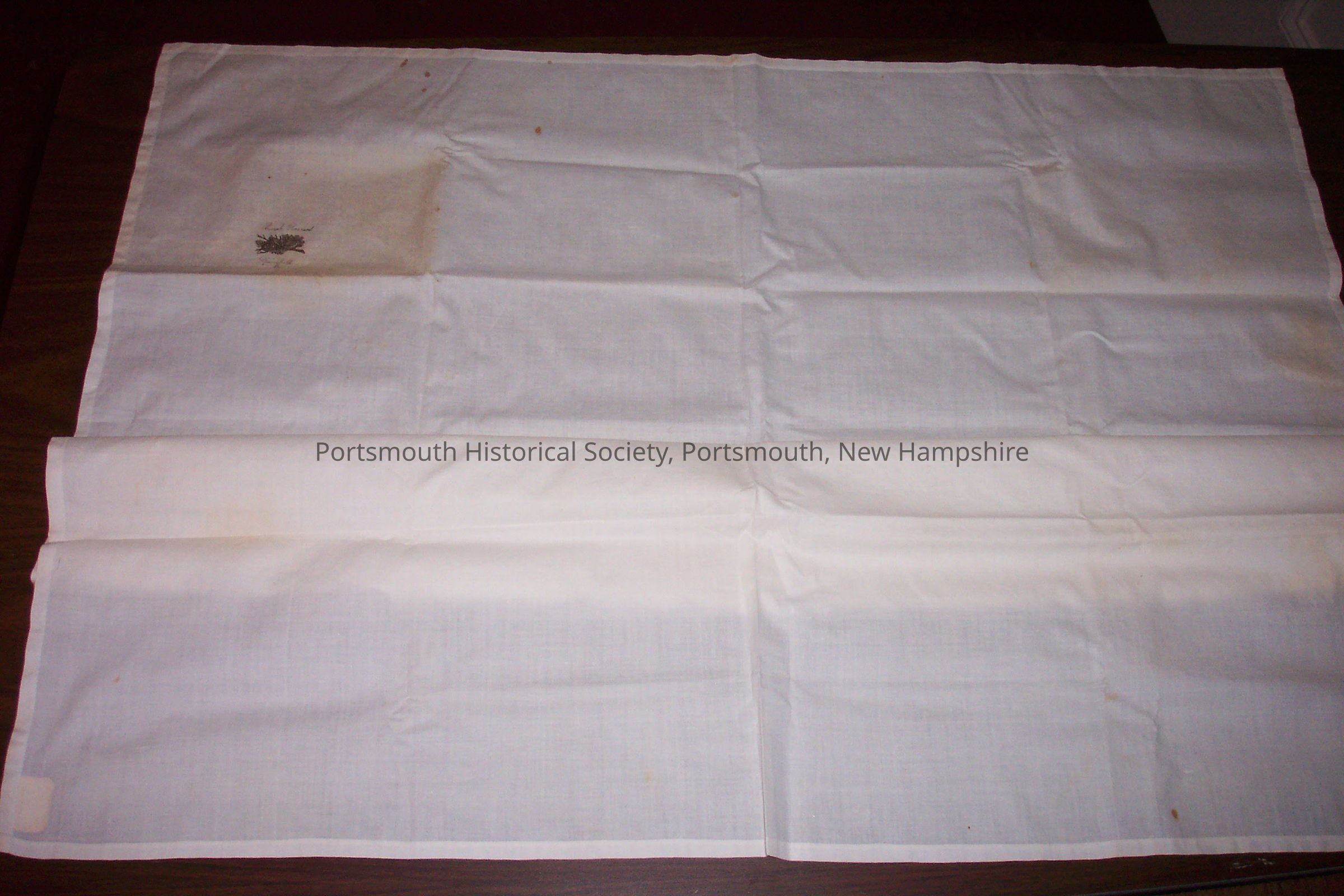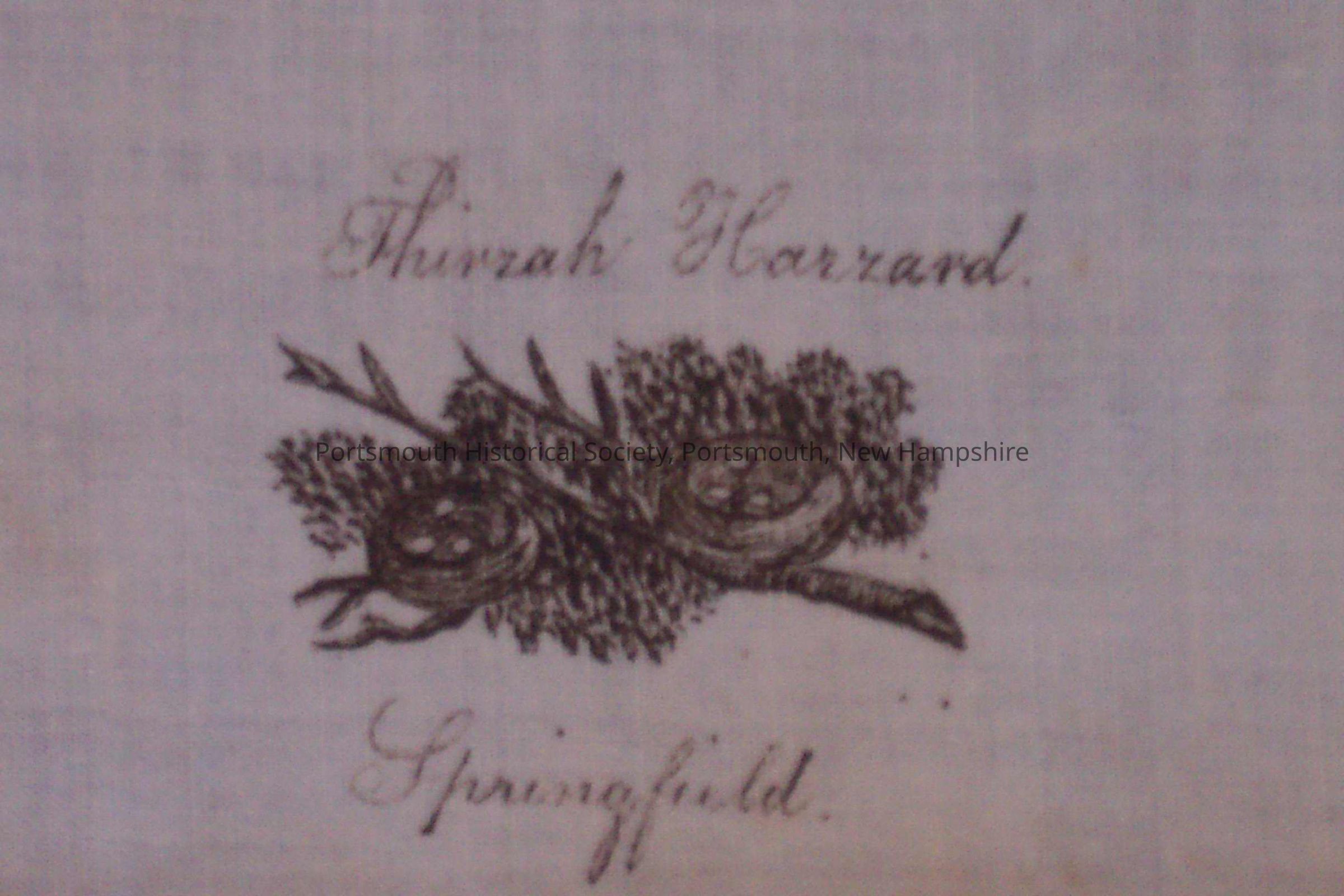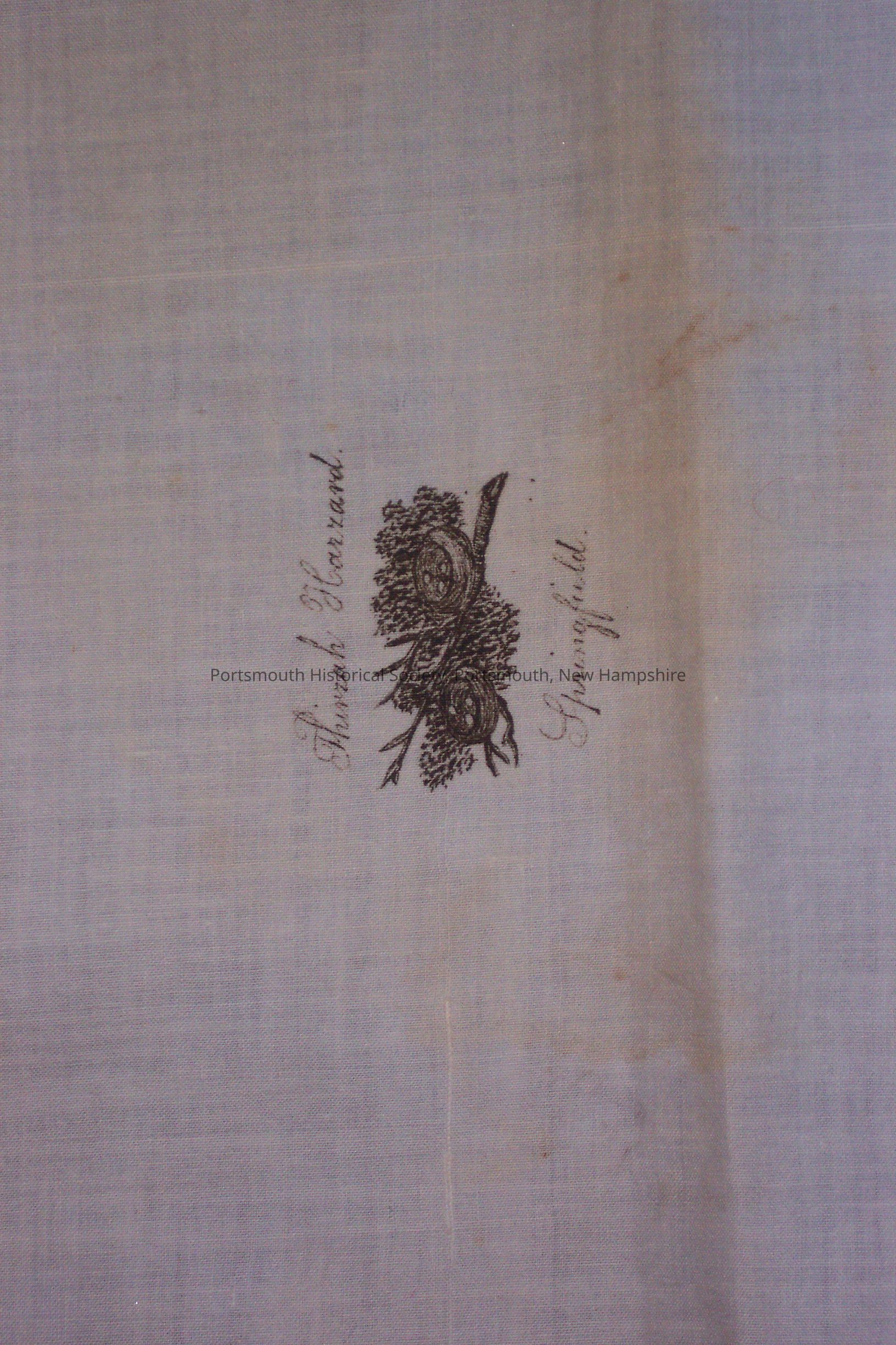 White cotton cloth with inkwork drawing of two bird nests and a stick. Above drawing in ink: "Thirzah Hazzard." Below drawing in ink: "Springfield." Like samplers, ink work on cloth was a part of a young women's education during the early nineteenth century. This a particularly rare and good example of the work. There is an adhesive label with red border in ink: "P.H.S. Mrs. D. W. Adams."