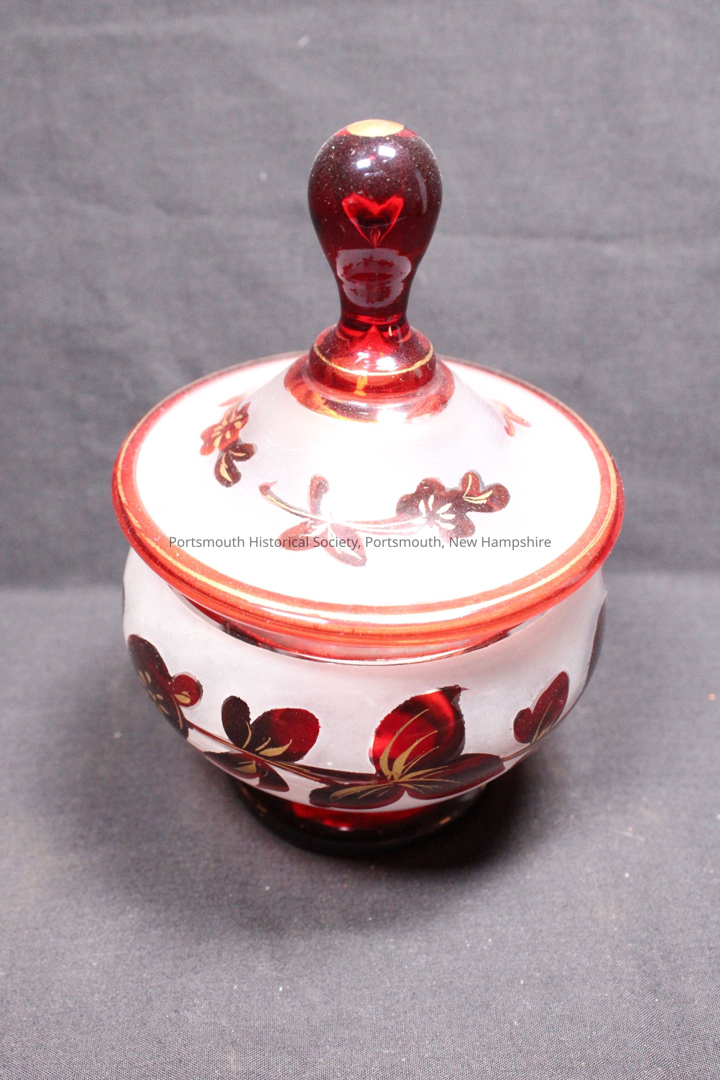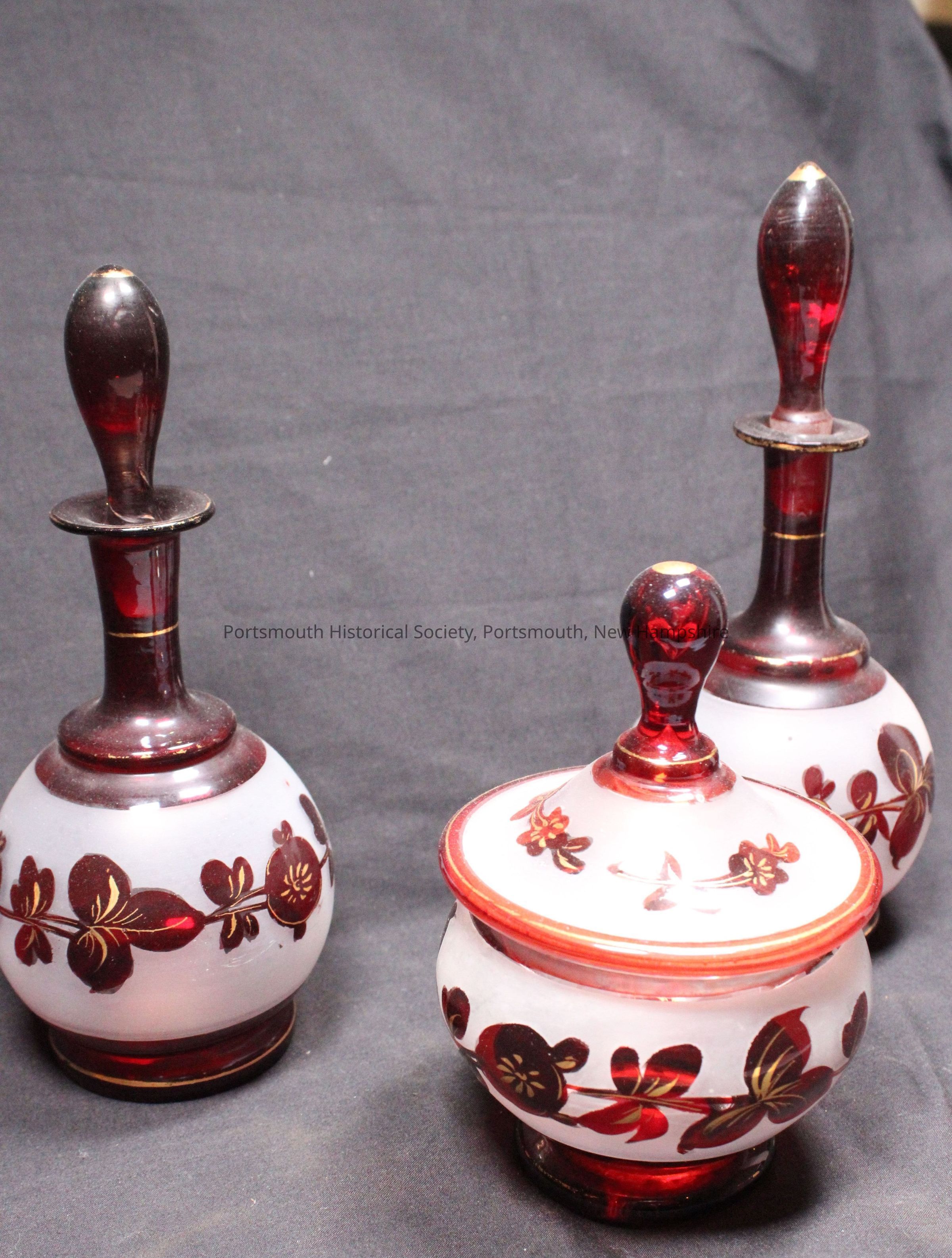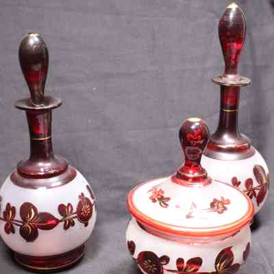 One of a three-piece dresser set of ruby-red Bohemian glass, frosted with gold trim.