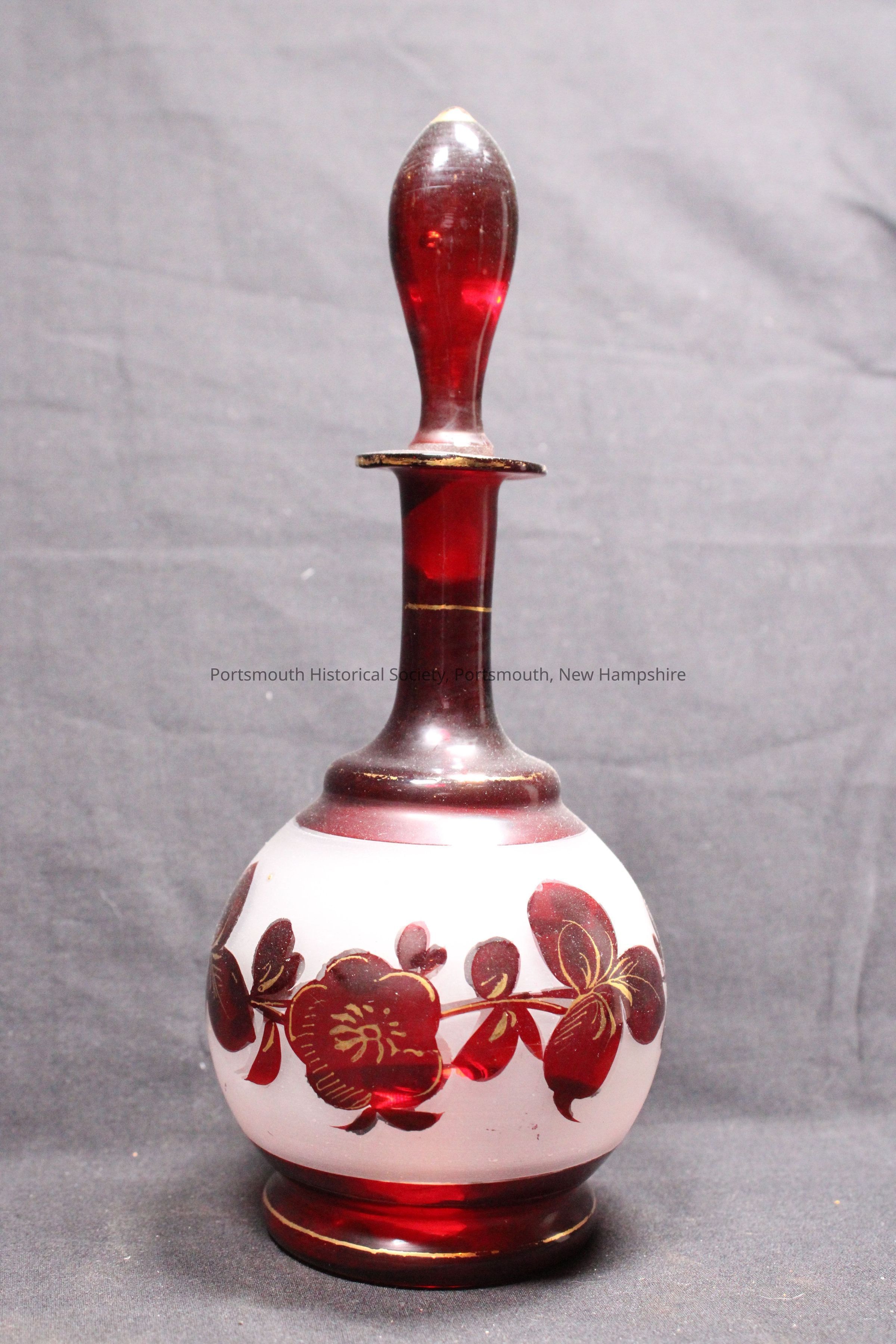 Three of a three-piece dresser set of ruby-red Bohemian glass, frosted with gold trim.