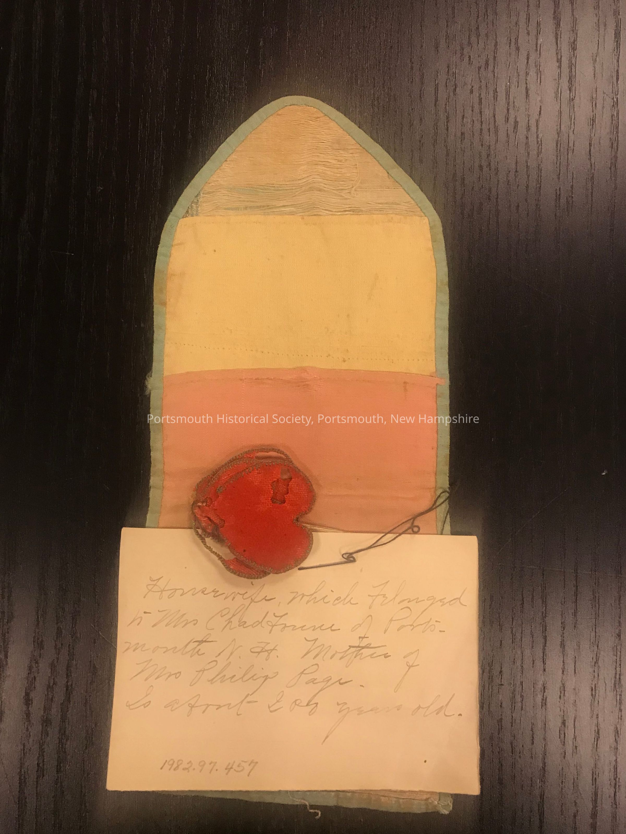 Sewing case rectangular in form with one end terminating in a point; houses several compartments for small sewing materials, and fashioned from several different fabrics; red hearts attached; accompanied by an old pencil note,