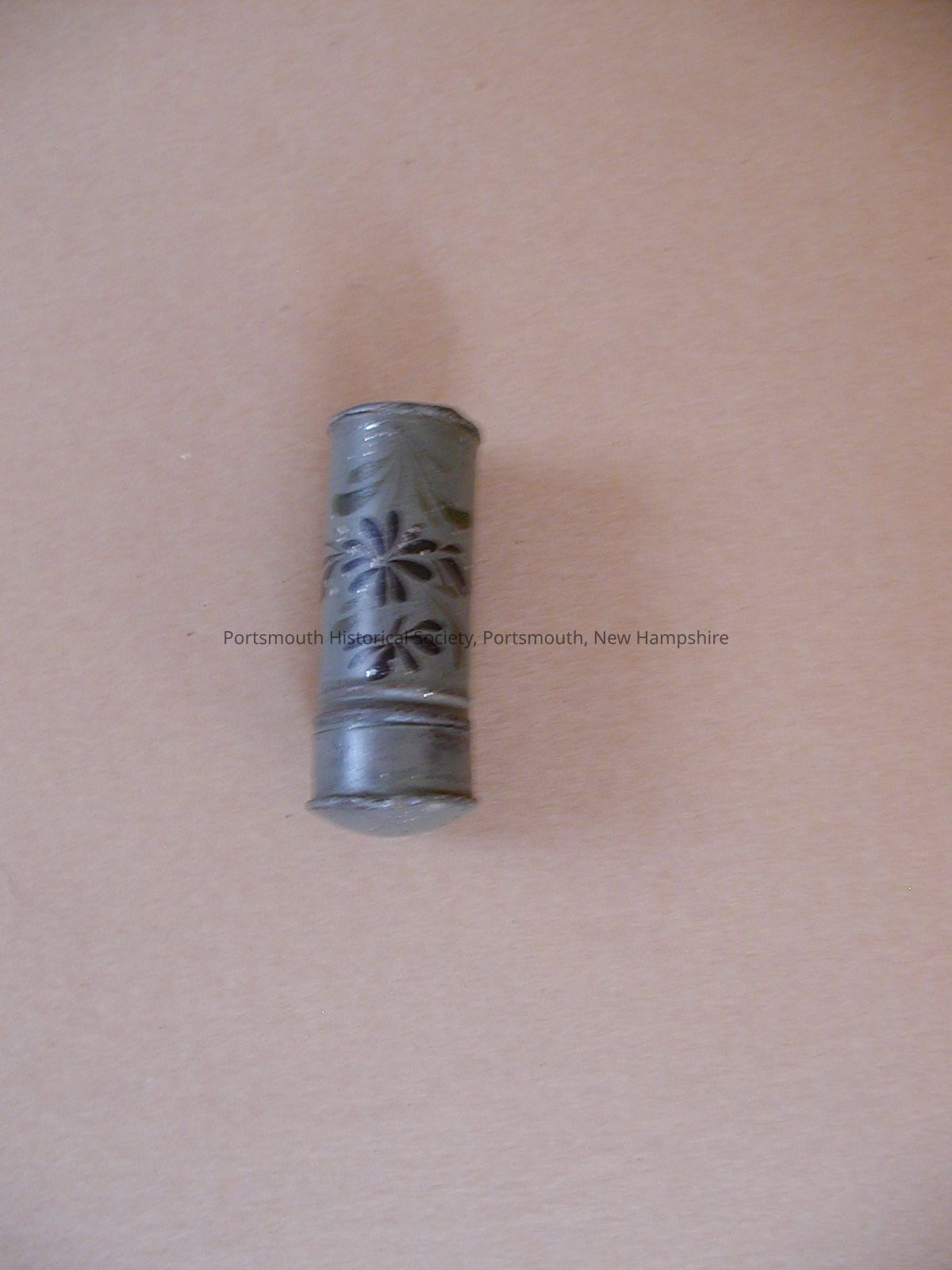 Nutmeg grater, portable, made of tin, cylindrical, floral pattern painted on outside.Collection