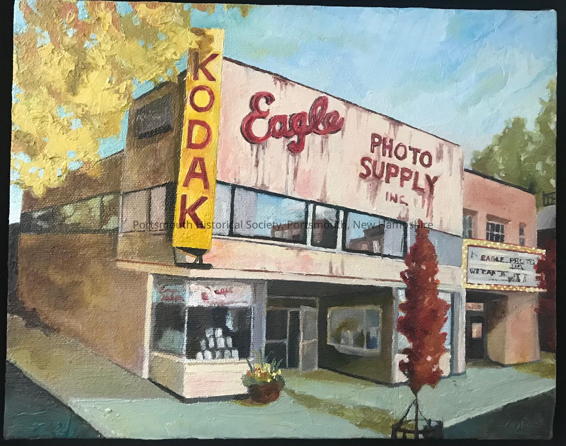 Small painting by Daisy Adams depicting Eagle Photo on Congress Street. Eagle Photo had been in business since 1915 and closed in 2008 due to the sharp decline in photo printing.Type of Painting