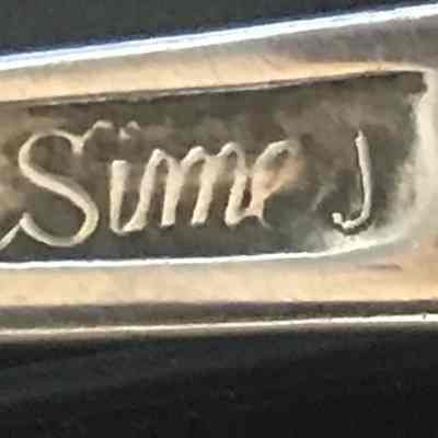 Ladle with coffin end, and with tapering and slightly angled shaft leading to a small bowl; engraved in script "Q" on top of handle; marked "W [pellet] Simes" in script on rectangle on backCollection