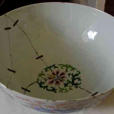 Polychrome Chinese export bowl with peony decoration. Many old breaks repaired with rivets.