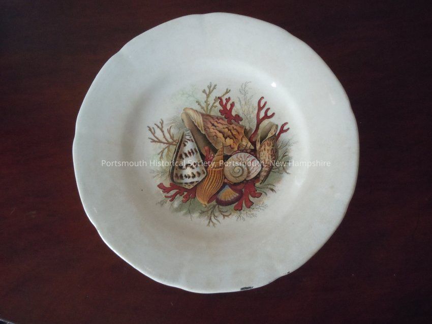 Heavy white plate with colored seashells in the center. Possibly Prattware, 1860s.Collection