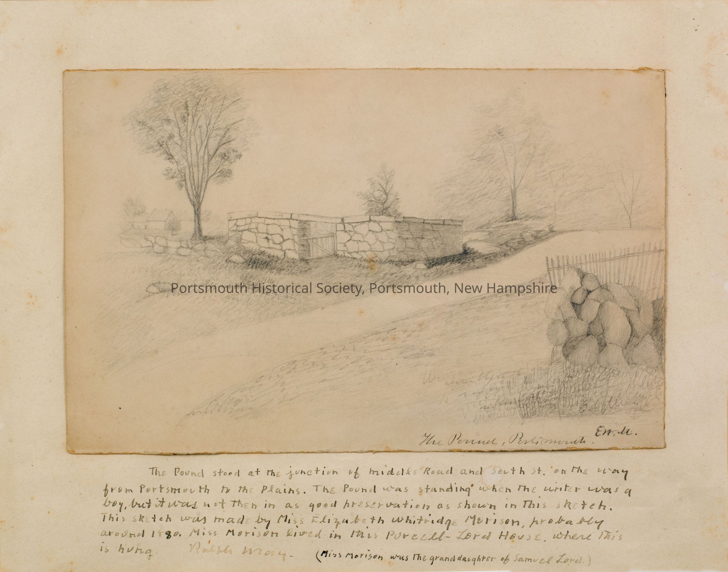The Pound stood at the junction of Middle Road and South St. on the way / from Portsmouth to the Plains. The Pound was standing when the writer was a / boy, but it was not then in as good preservation as shown in this sketch. / This sketch was made by Miss Elizabeth Whitridge Morison, probably / around 1880. Miss Morison lived in the Purcell-Lord House, where this / is hung. Ralph May. (Miss Morison was the granddaughter of Samuel Lord.)Provenance