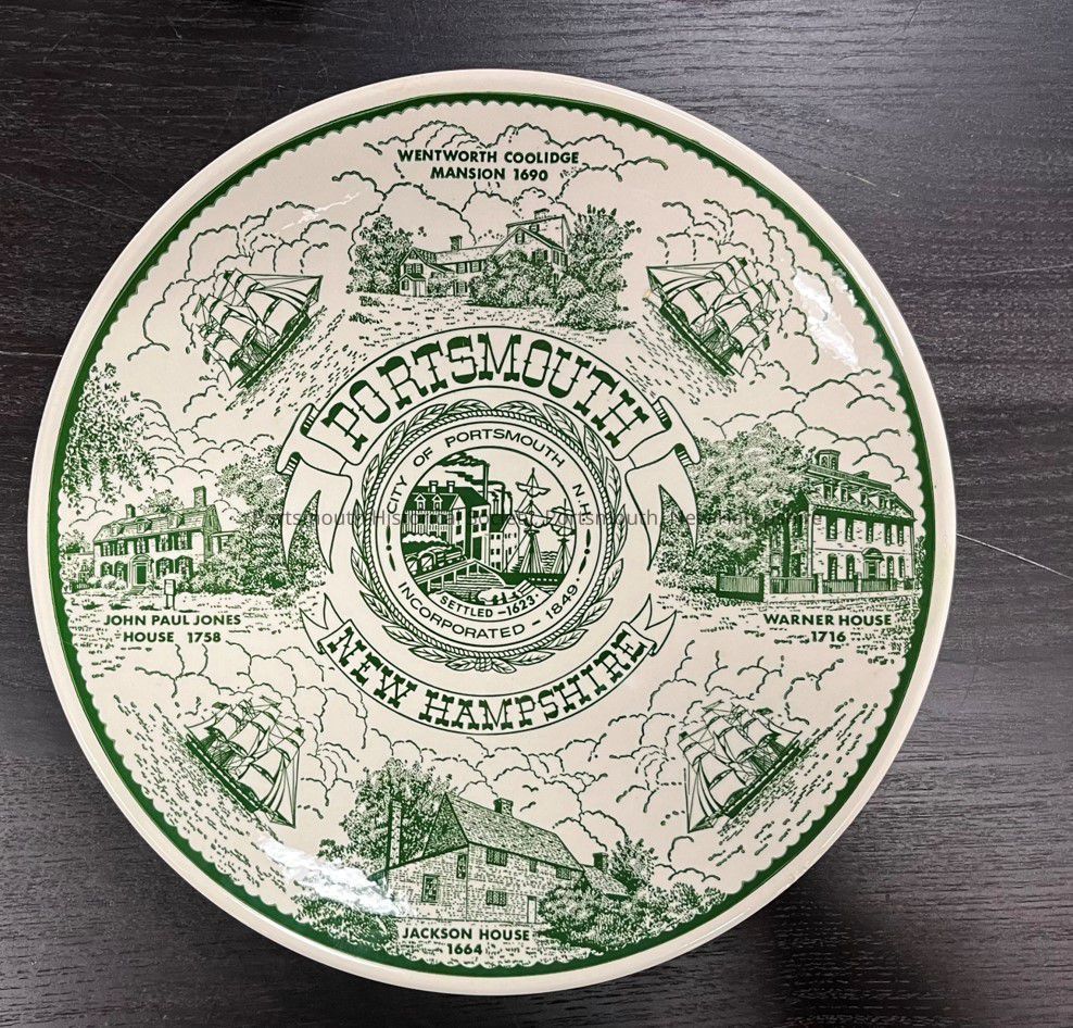 “PORTSMOUTH / NEW HAMPSHIRE” in banners surrounding a central circle with the city seal and text reading “CITY OF PORTSMOUTH N.H. / INCORPORATED 1849” and “SETTLED 1623.” Images of local sites, separated by ships, include at top “WENTWORTH COOLIDGE / MANSION 1690,” and clockwise, “WARNER HOUSE / 1716,” “JACKSON HOUSE / 1664,” and “JOHN PAUL JONES / HOUSE 1758.” Type