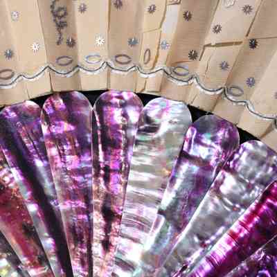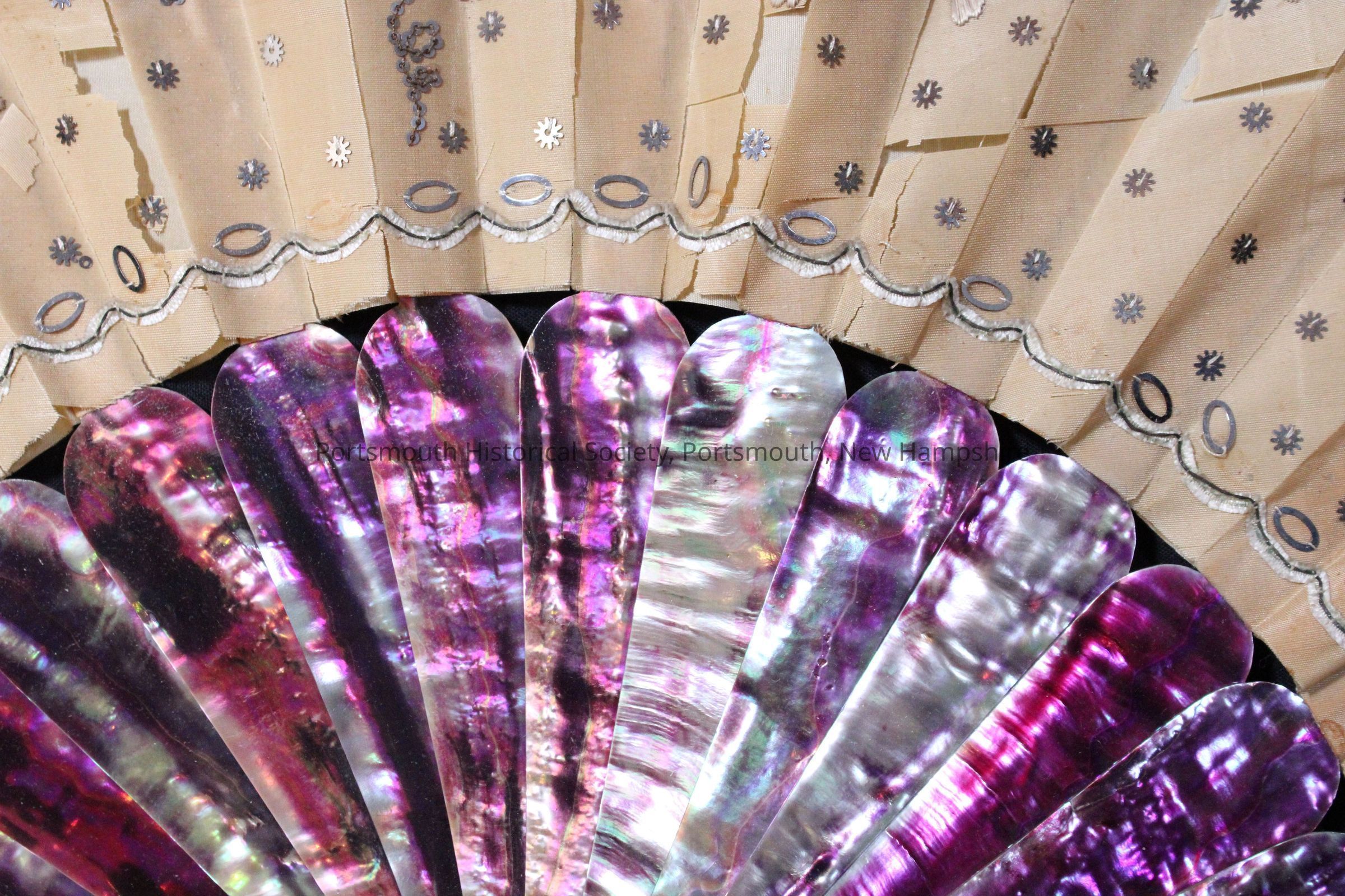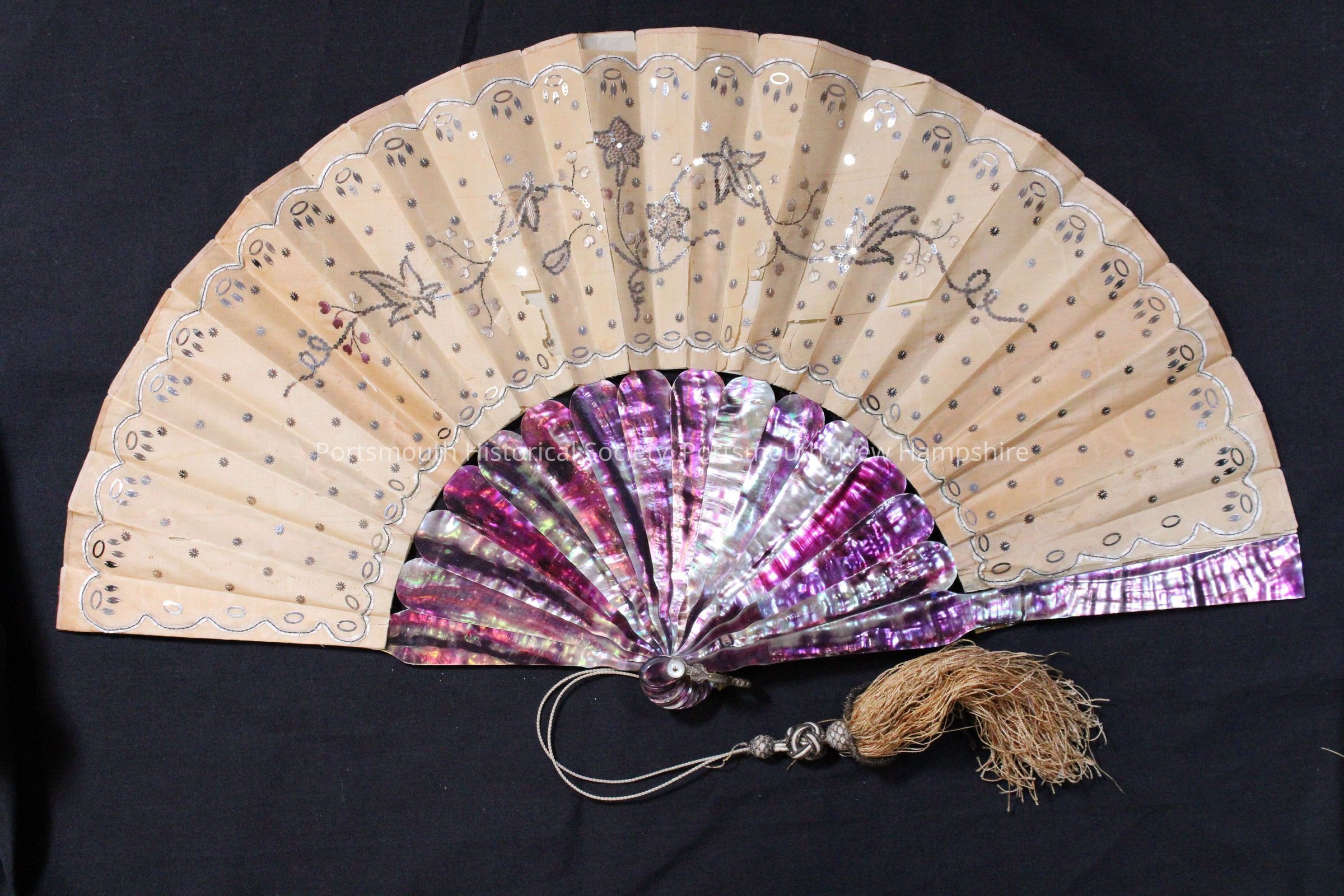 Beige silk fan with metallic silver sequin decoration forming a vine pattern. Supports are purple iridescent shell, possibly abalone. Fan has a decorative silk tassel cord. Adhesive tag on rear: "Ports Hist Soc Mrs. Ferree." Old label reads: "Gift of / Mrs. Annie Appleton Ferree / Rosemont, Pennsylvania"Acquisition