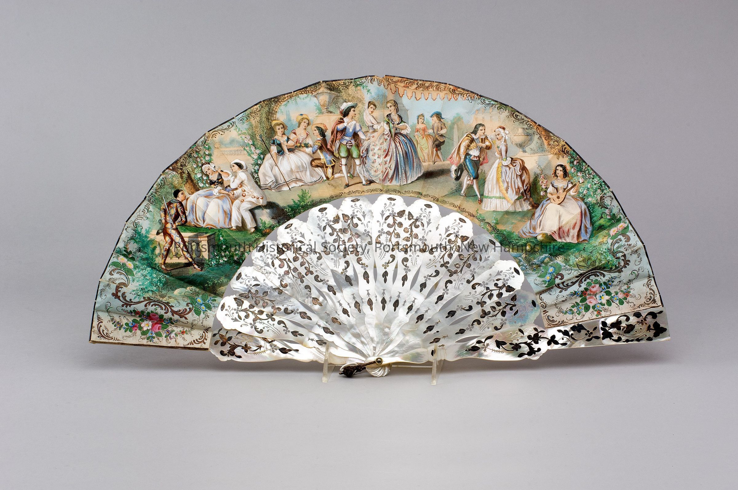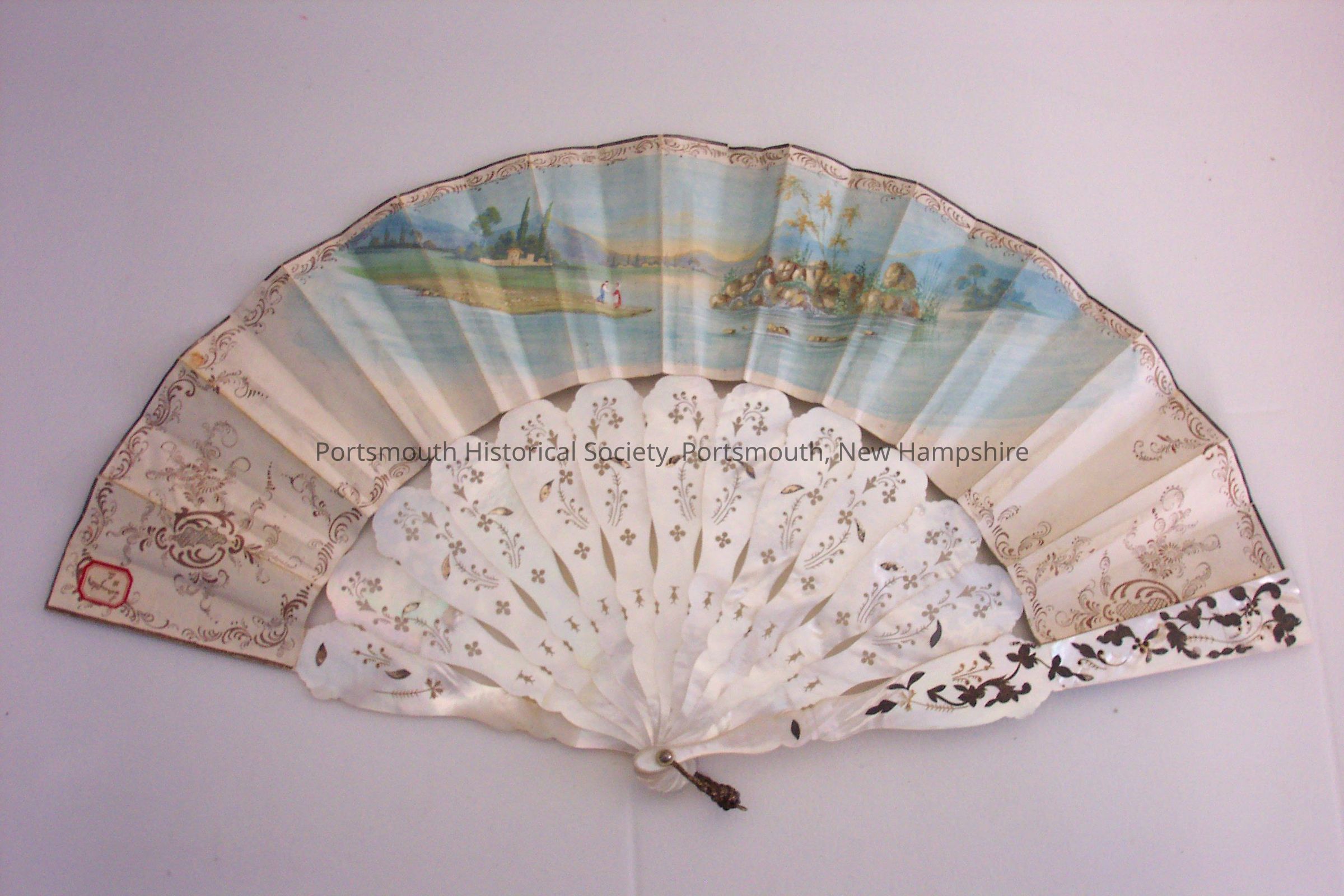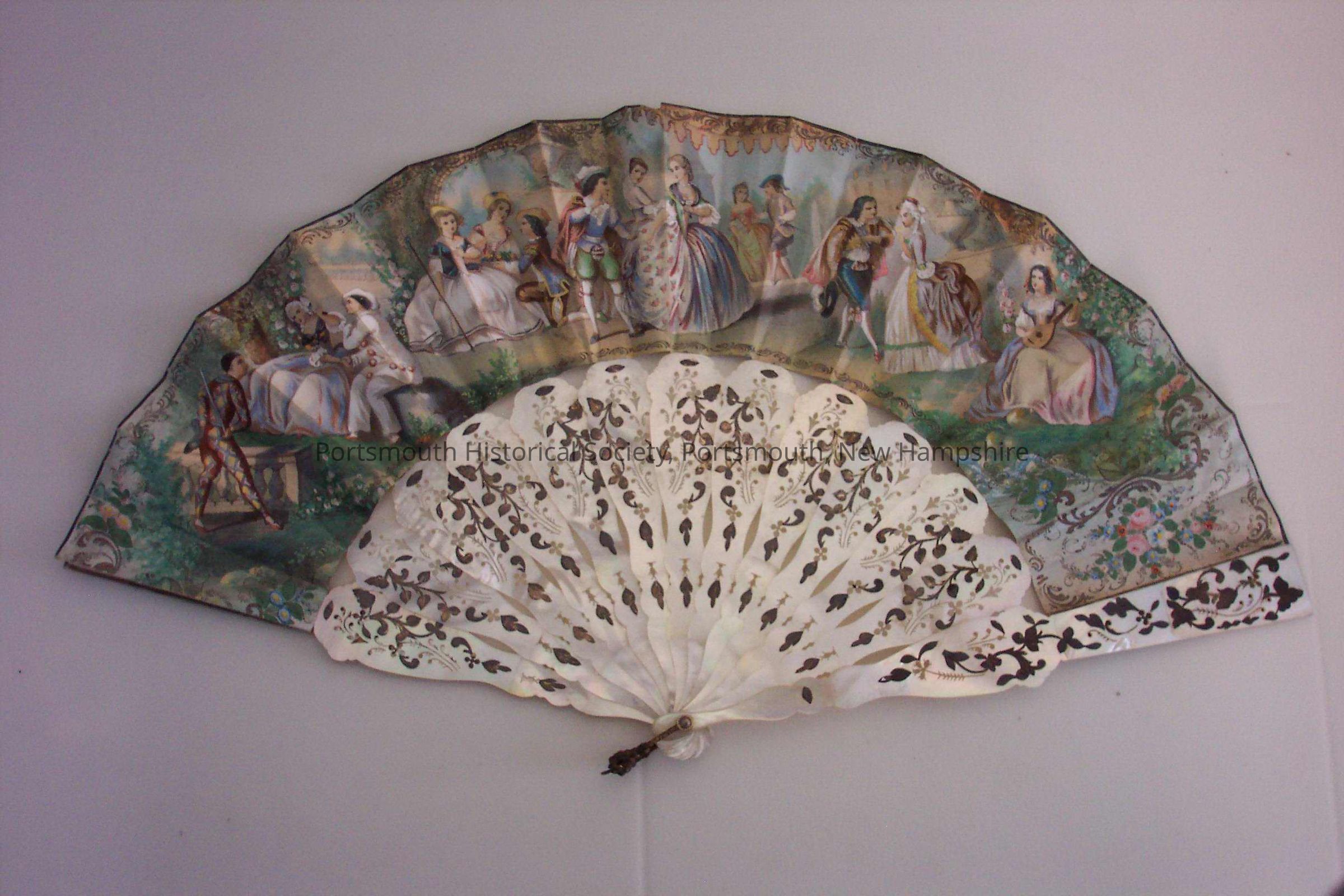 Paper fan with painted scene of young ladies and gentlemen in a garden on one side and men and an island with trees on the other side. Supports are mother of pearl cutwork in a carved design with silver inlay, painted with gilt. Supports are held together with a gold loop. Red bordered tag attached to fan and says, "Langdon #2."Acquisition