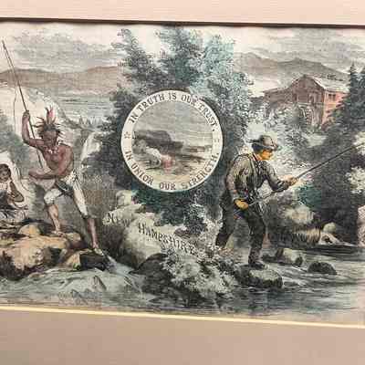 Scene of a Native American man spearing a fish with a woman seated beneath him on the left, and a white settler in backwoods clothing fishing with a fishing pole on the right with a wooden mill building behind him. In the center is a medallion with a landscape scene with a group in the foreground around a campfire. The medallion is surrounded with the motto: "In Truth is Our Trust/In Union Our Strength" and "NEW HAMPSHIRE" is below.