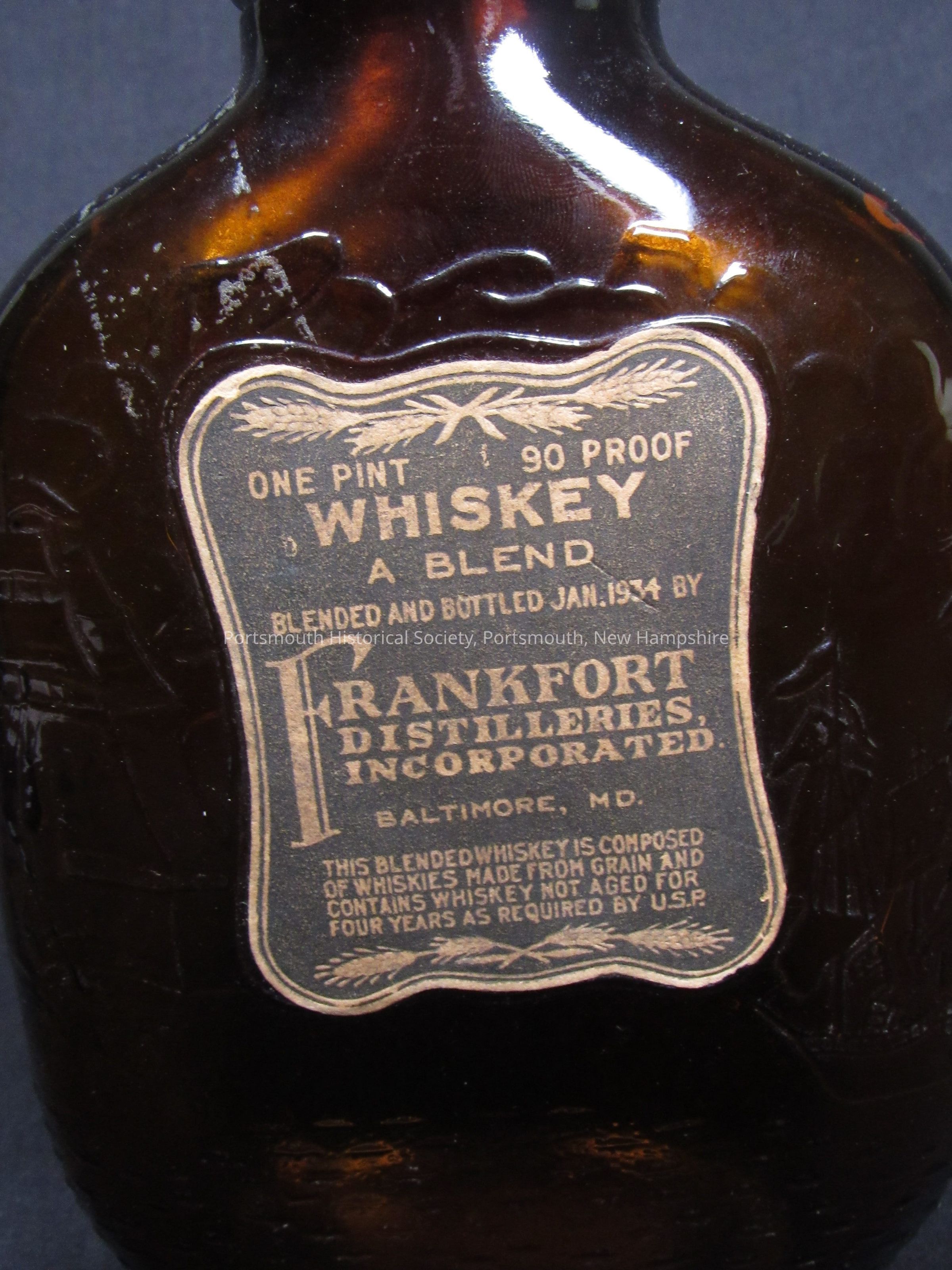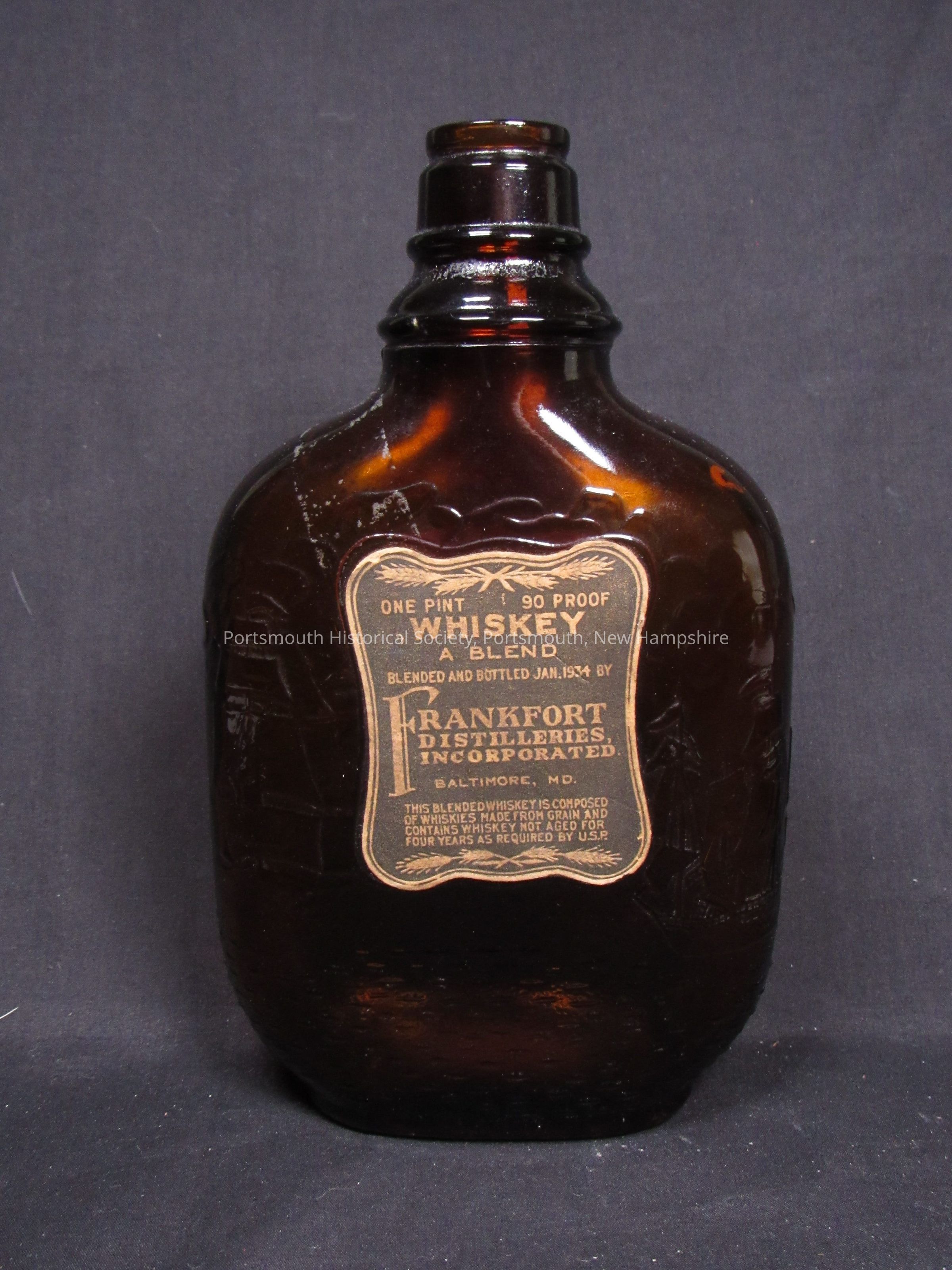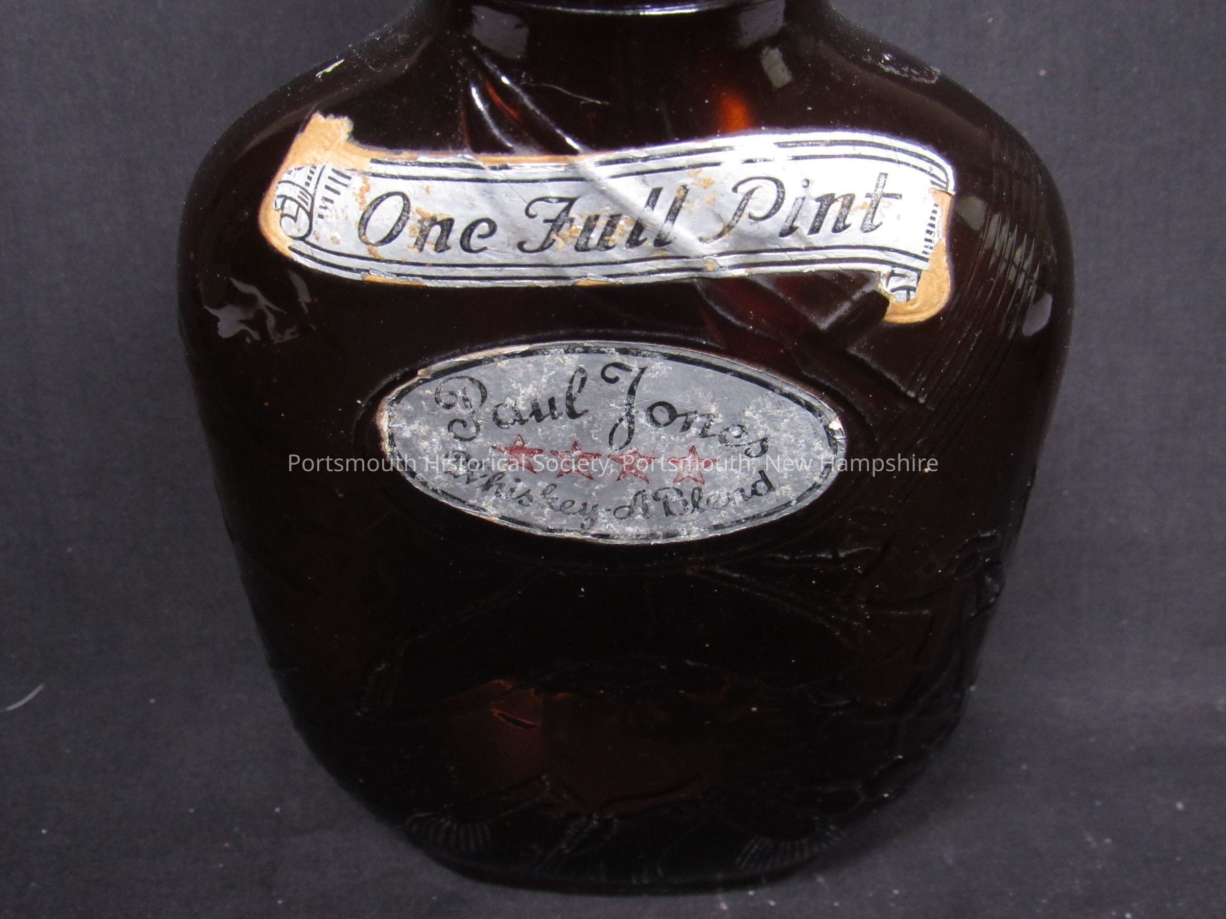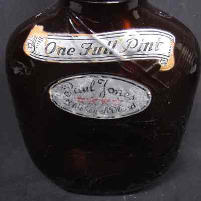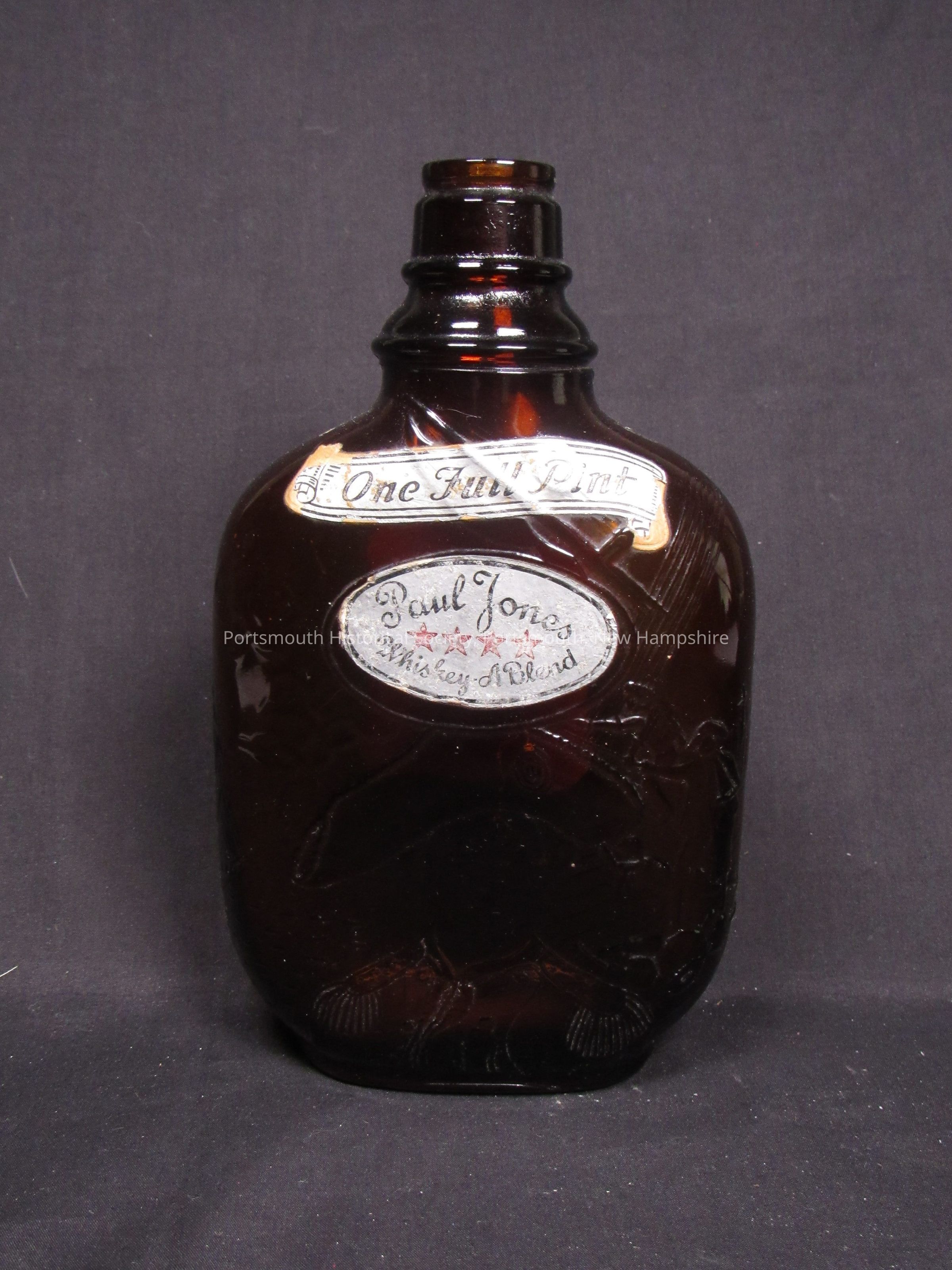 One-pint flask, Paul Jones Whiskey A. Blend, Frankfort Distillers, Inc., Baltimore, Maryland, featuring JPJ and battle scene in molded glass. Brown glass; mark on bottom.Acquisition