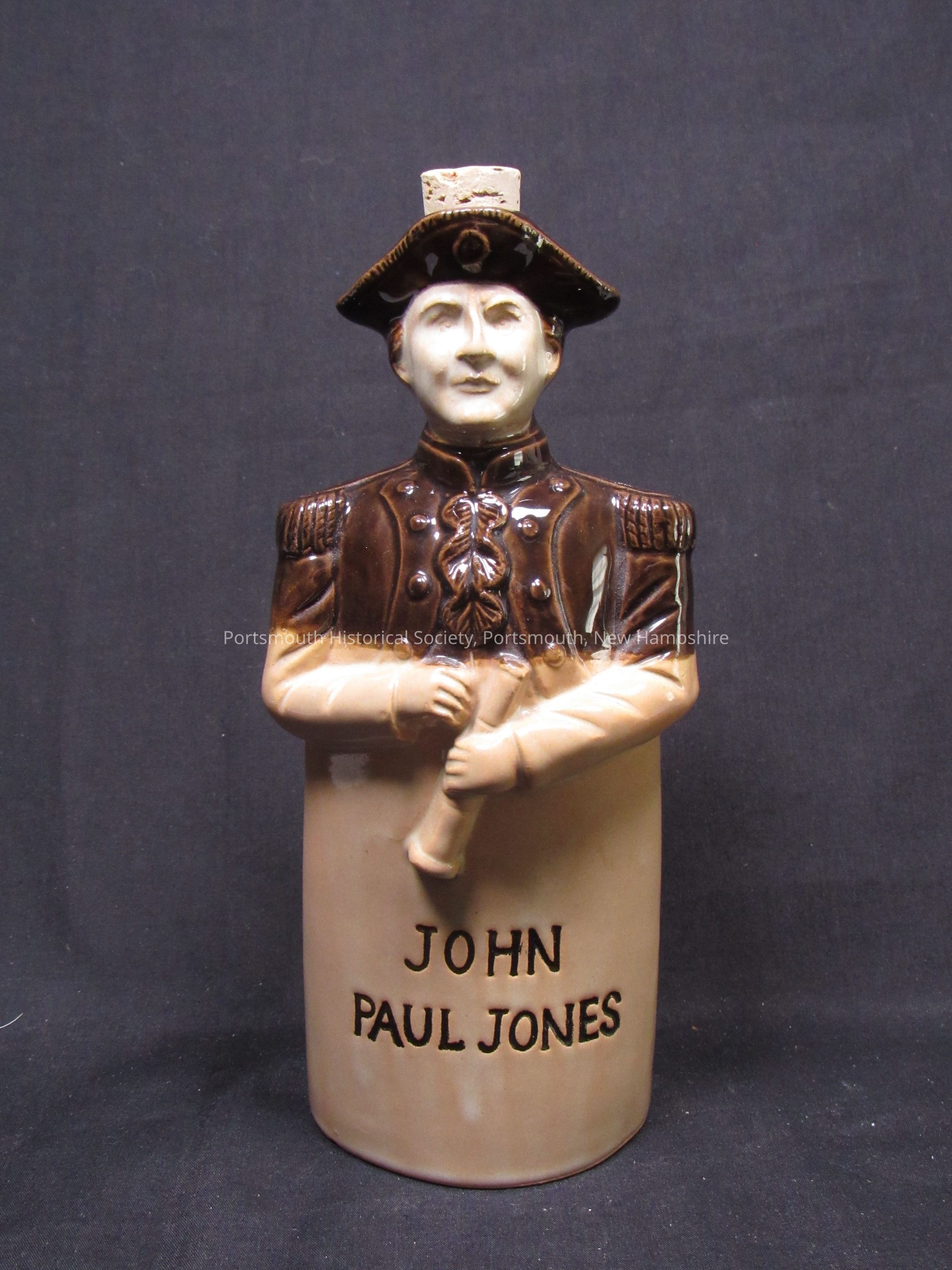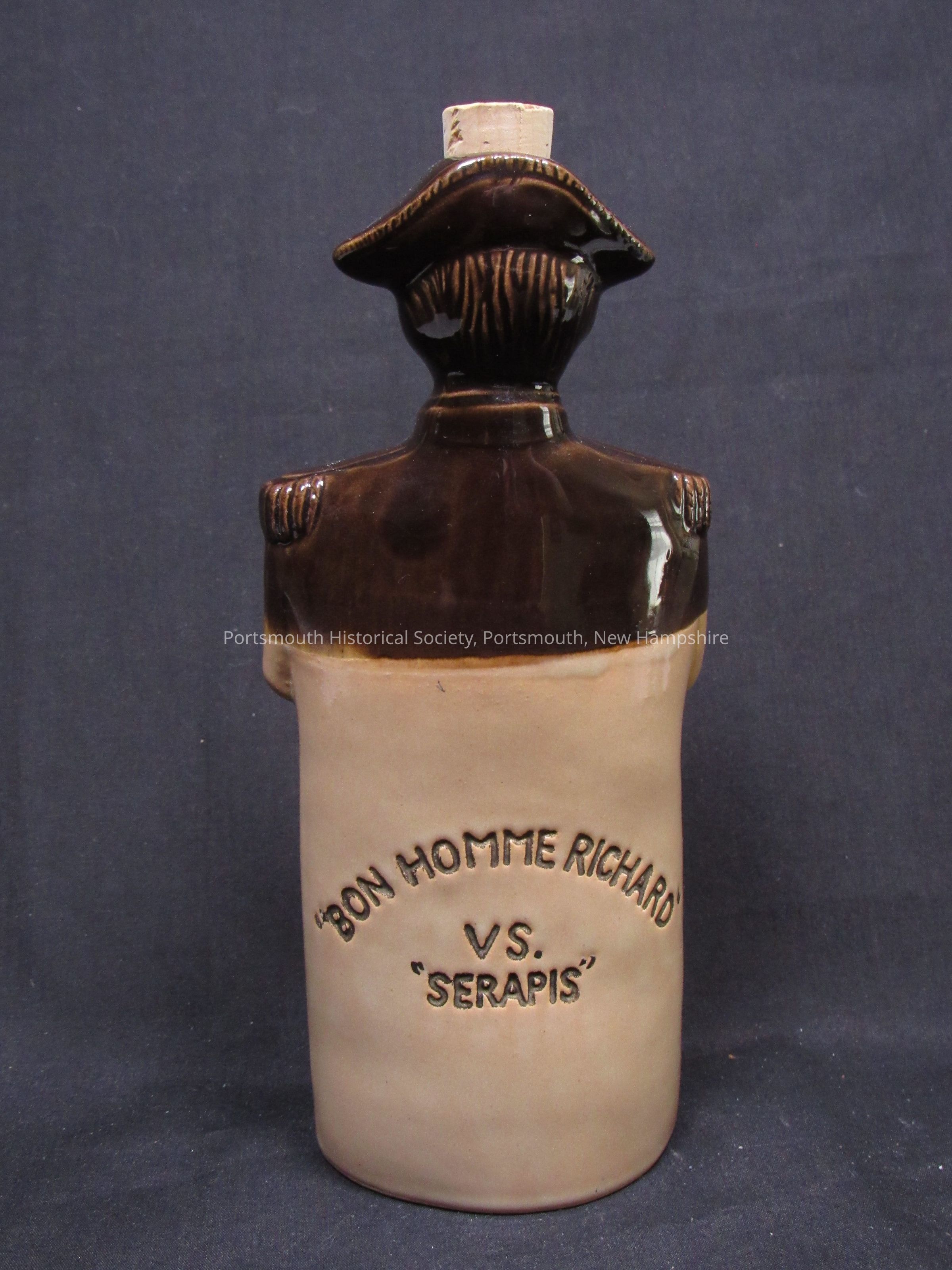 Figural flask, "JOHN PAUL JONES" on one side,: " ' BON HOMME RICHARD' / VS. 'SERAPIS' " on the other. Ceramic, brown and white, with cork stopper. Apparently unmarked.Acquisition