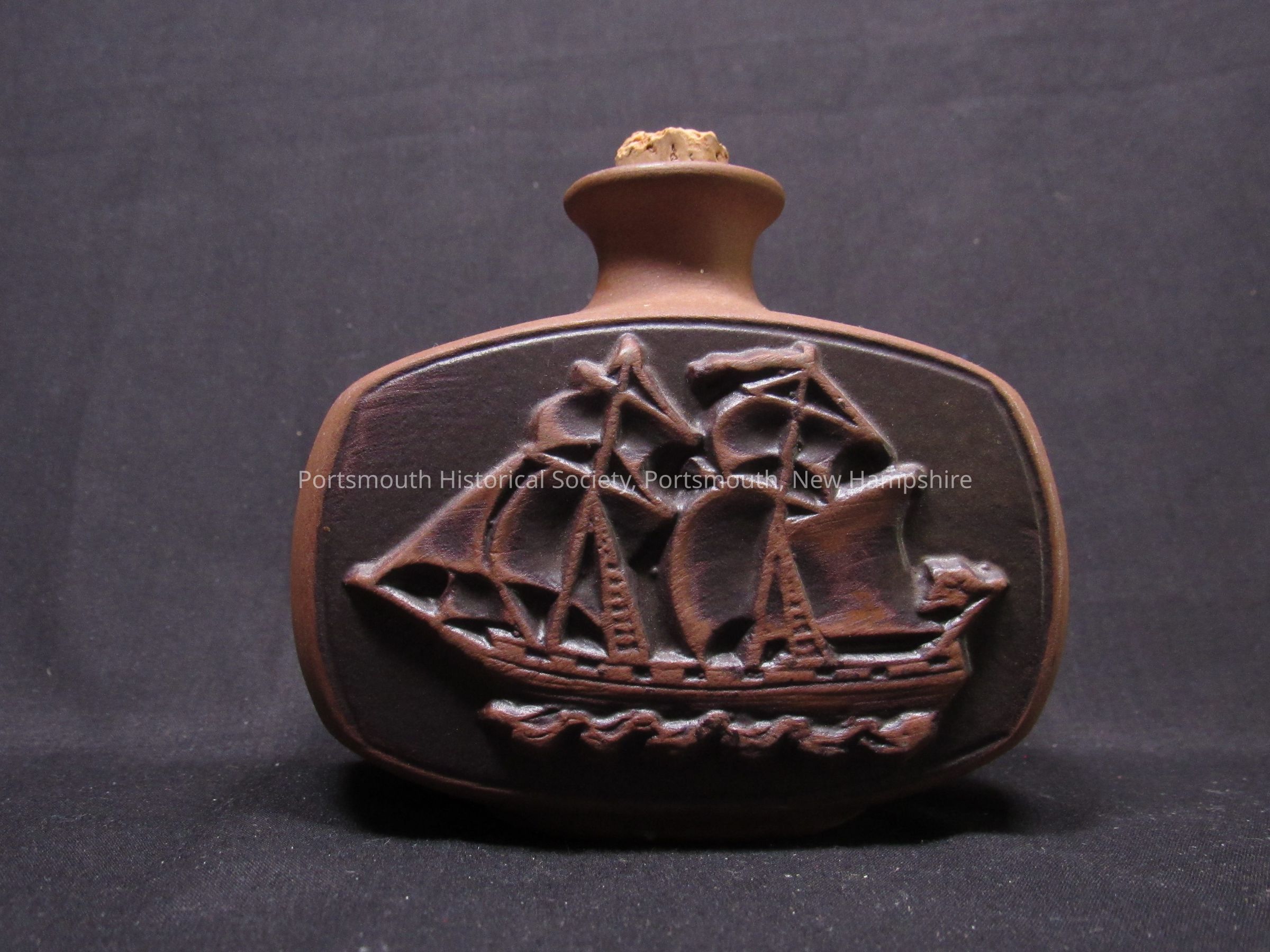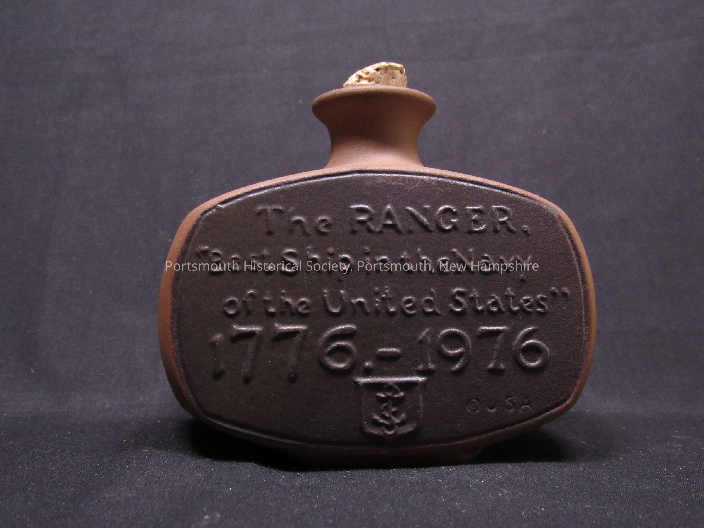 Small flask featuring image of ship on one side, with “The Ranger / ‘Best Ship in the Navy of the United States / 1776-1976” on reverse, with stamped "[copyright symbol] USA" and anchor in a shield; ca. 1976.