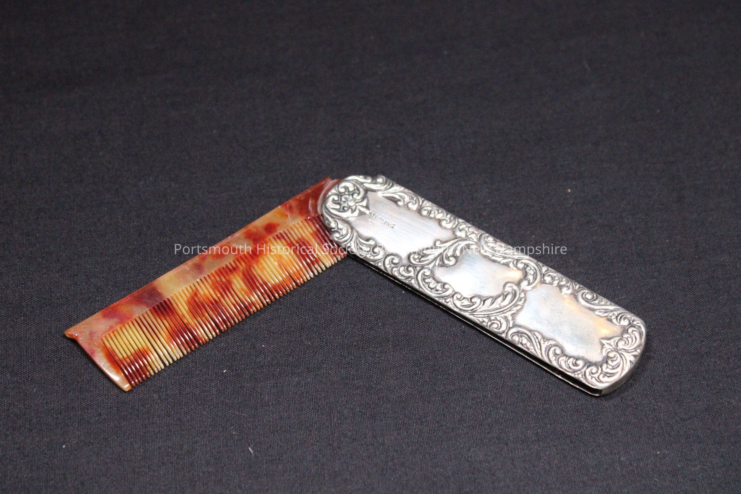 Ladies folding tortoise shell comb in a sterling silver case. Comb is straight and case has a stylized floral pattern. Found in collection. Late 19th C.Acquisition
