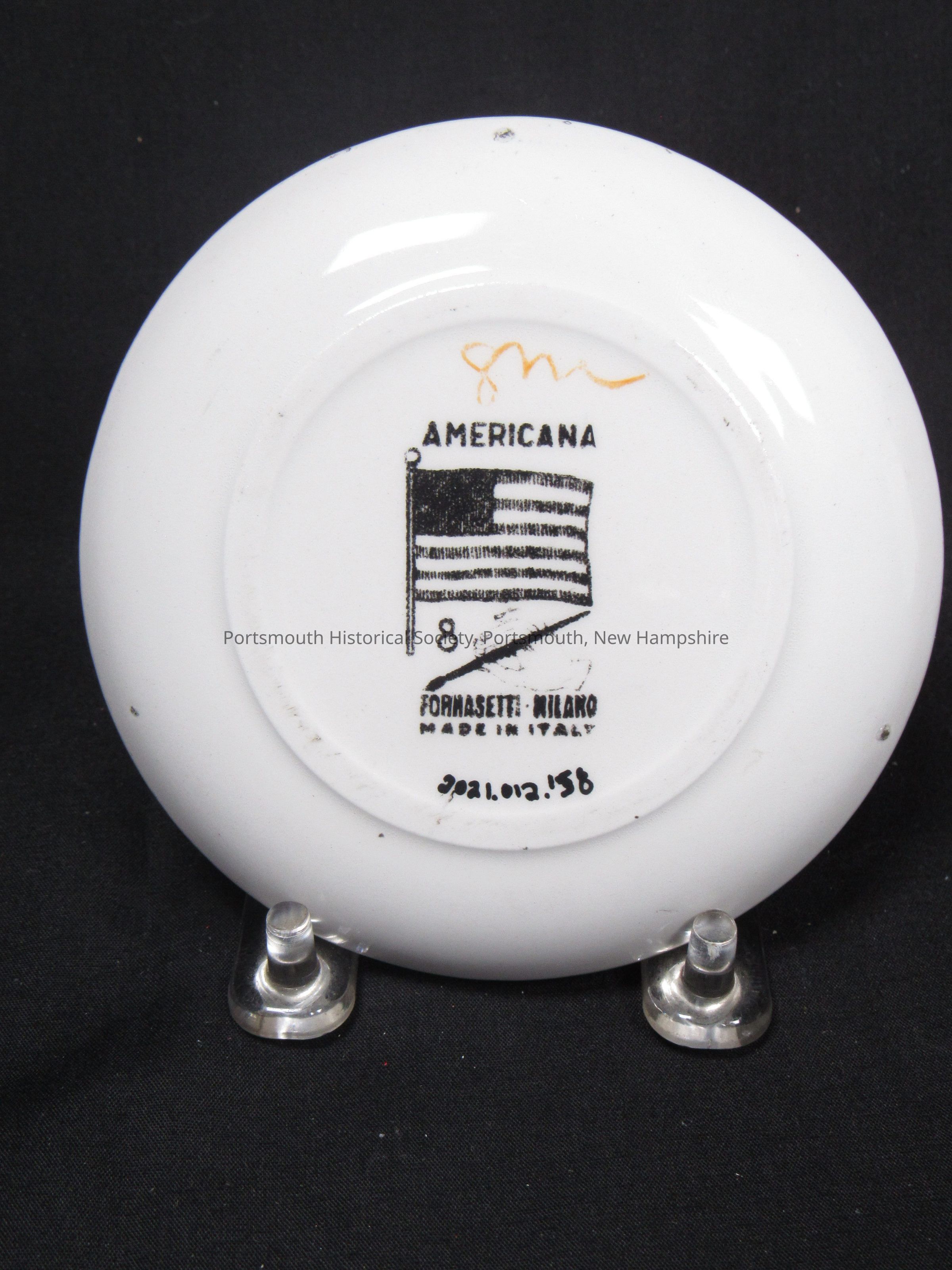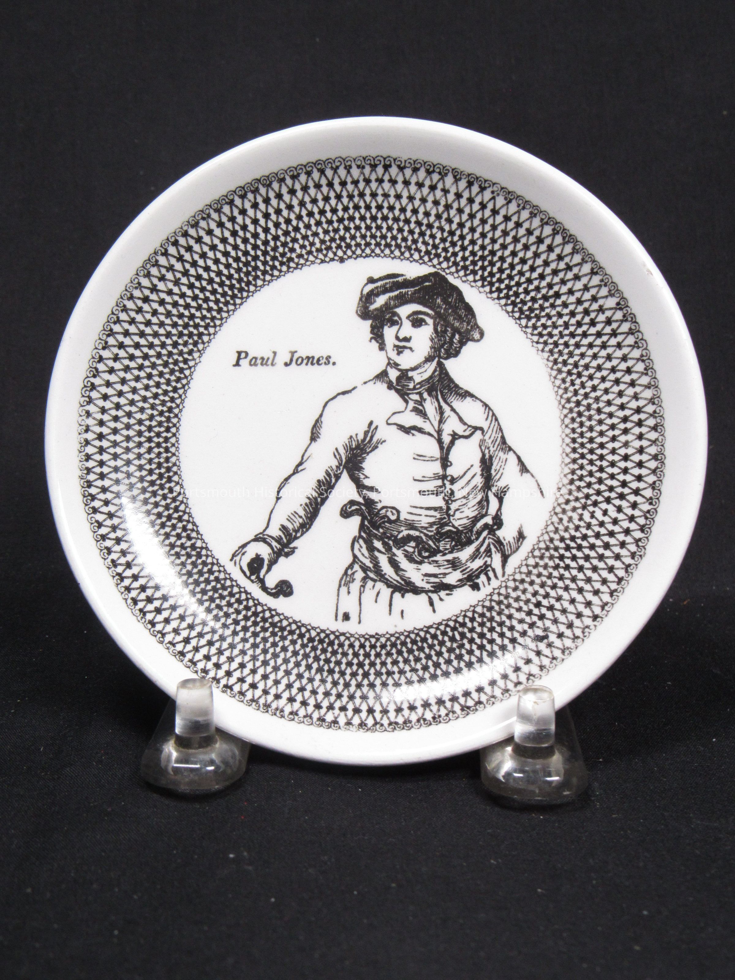 Small plate featuring “Paul Jones,” Fornasetti, Milan, Italy, twentieth century. White ceramic; Diam. 4 in. Marked on bottom: ‘AMERICANA [US flag] 8 / FORNASETTI MILANO / MADE IN ITALY.”Acquisition