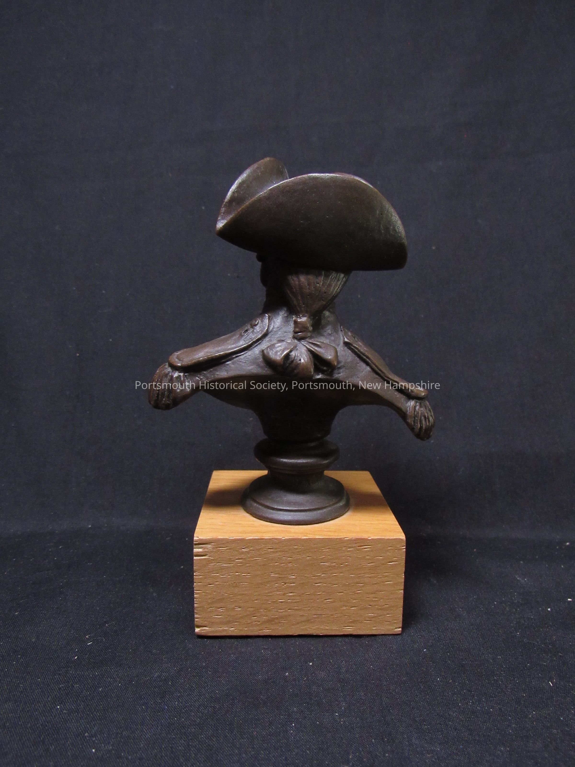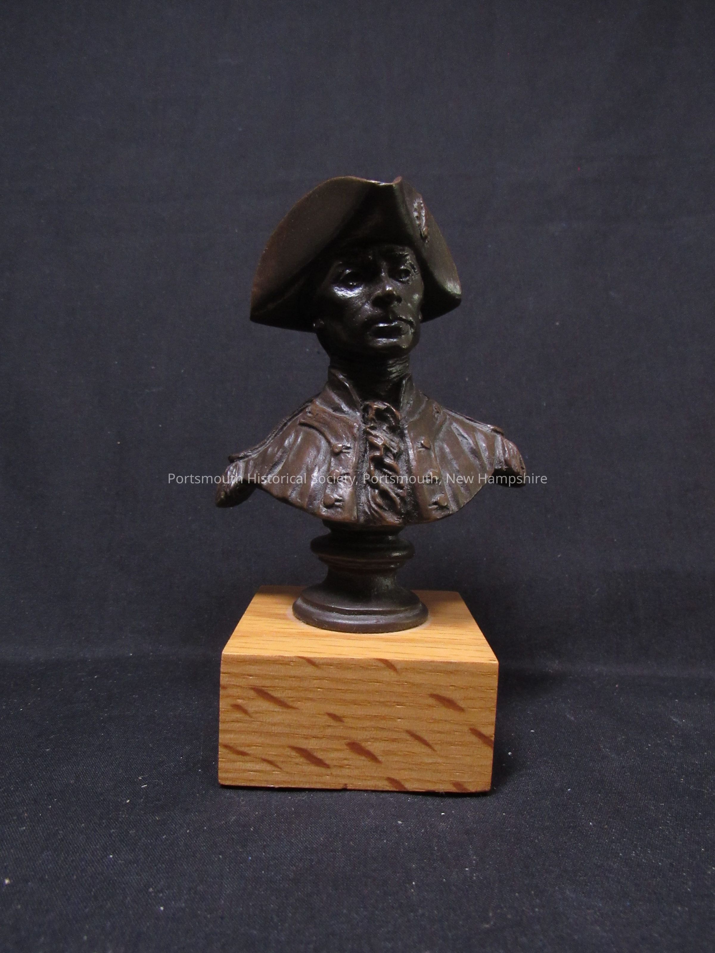 Bust of John Paul Jones with hat, on wooden base. Sculpture marked on back: [copyright FRED PRESS." Base with sticker: "MADE IN U.S.A. / EXCLUSIVELY FOR / U.S. NAVY MEMORIAL / FOUNDATION / BY AQUARIUS ARTS / FAIRVIEW, NJ"Acquisition
