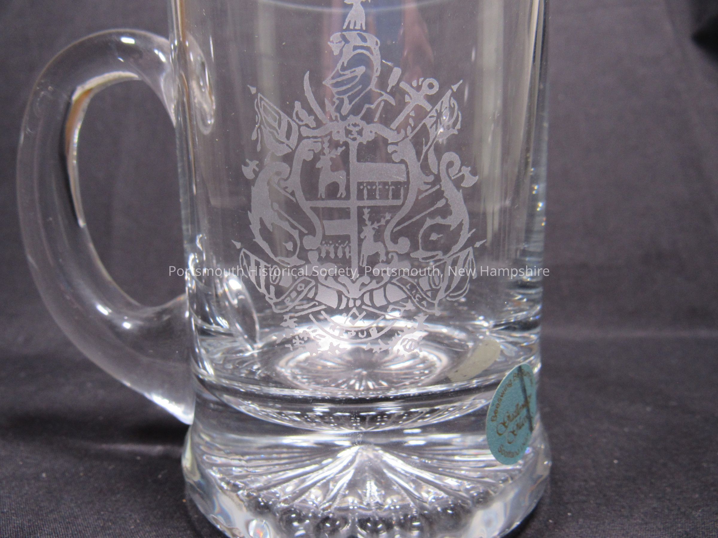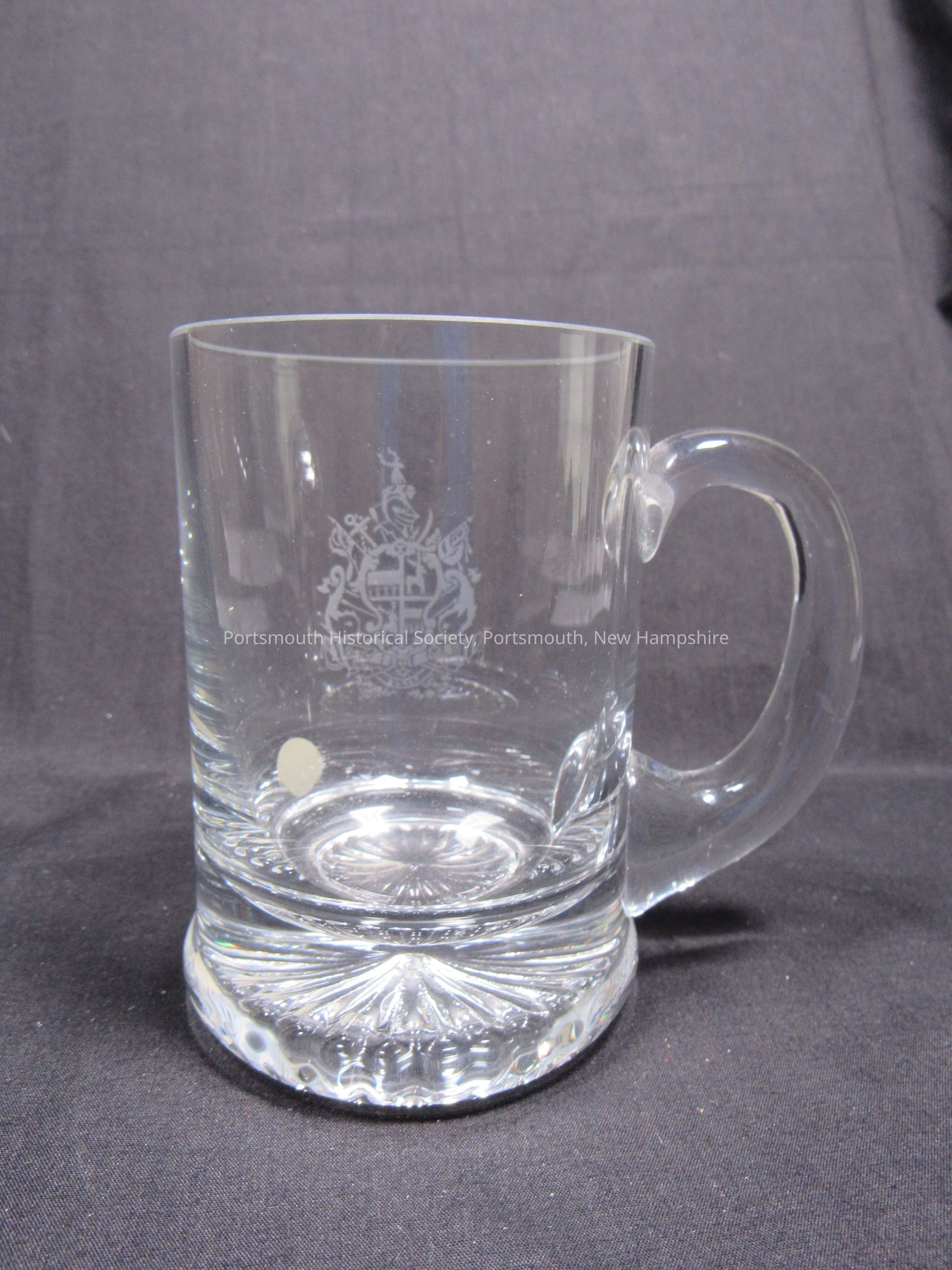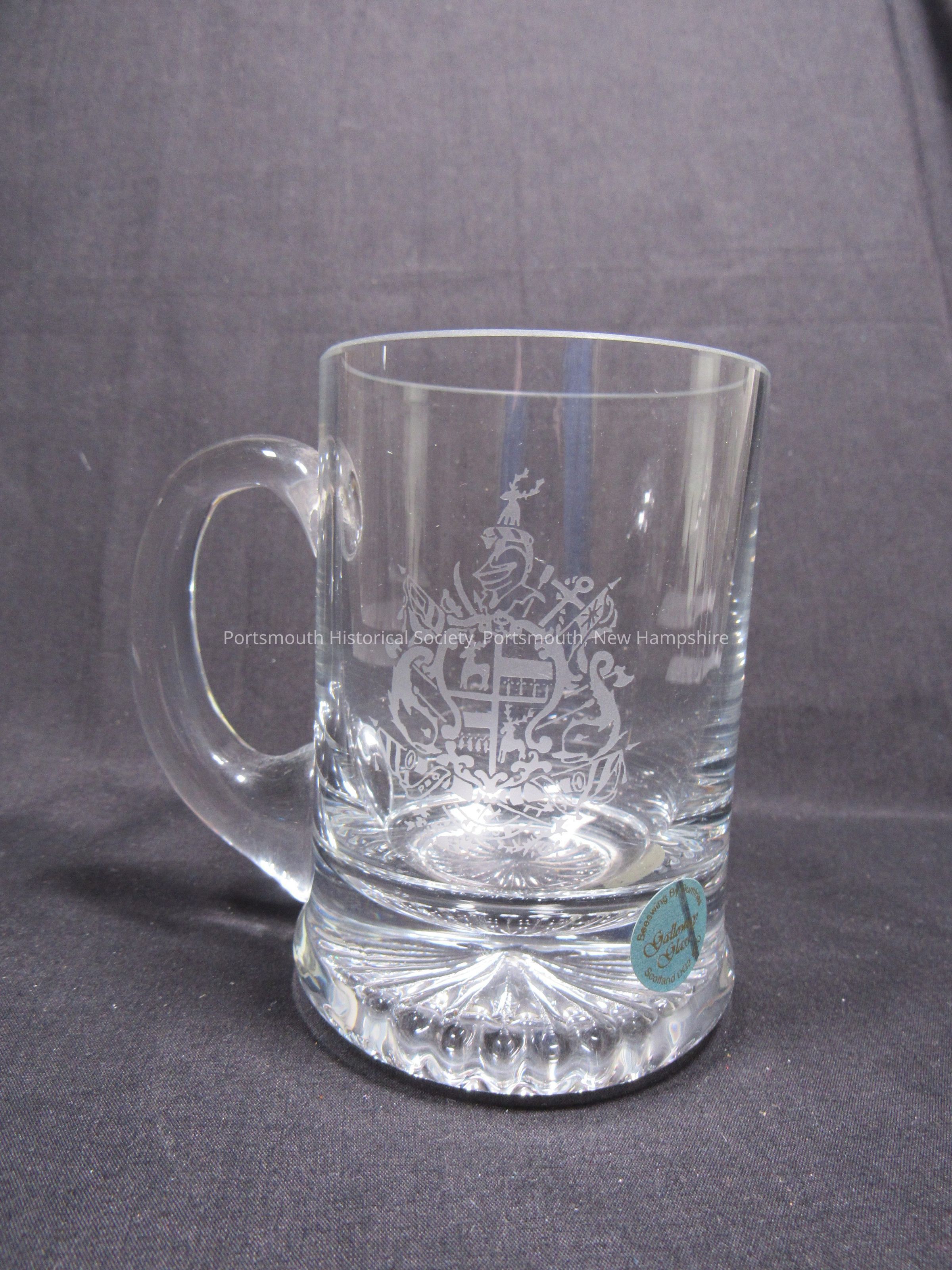 Clear glass mug, with etched John Paul Jones coat of arms, twentieth century. Paper sticker reads: “Beeswing By Dumfries / Galloway Glass / Scotland DG2 8 ED’”; “GG” scratched on bottom.Acquisition