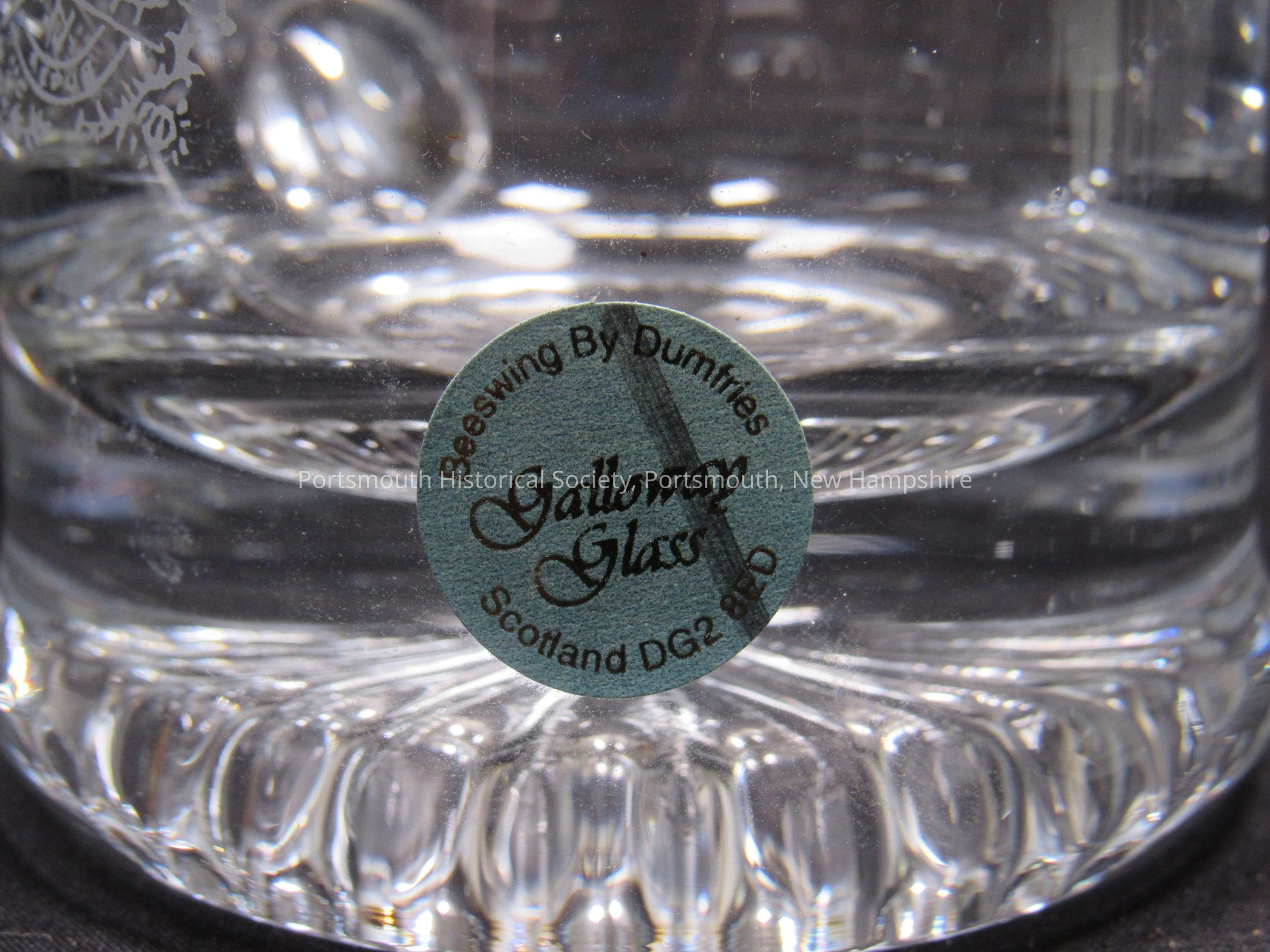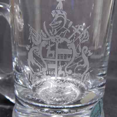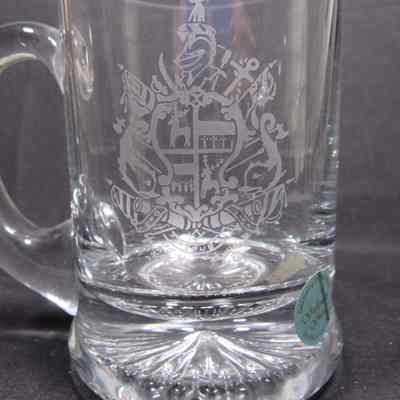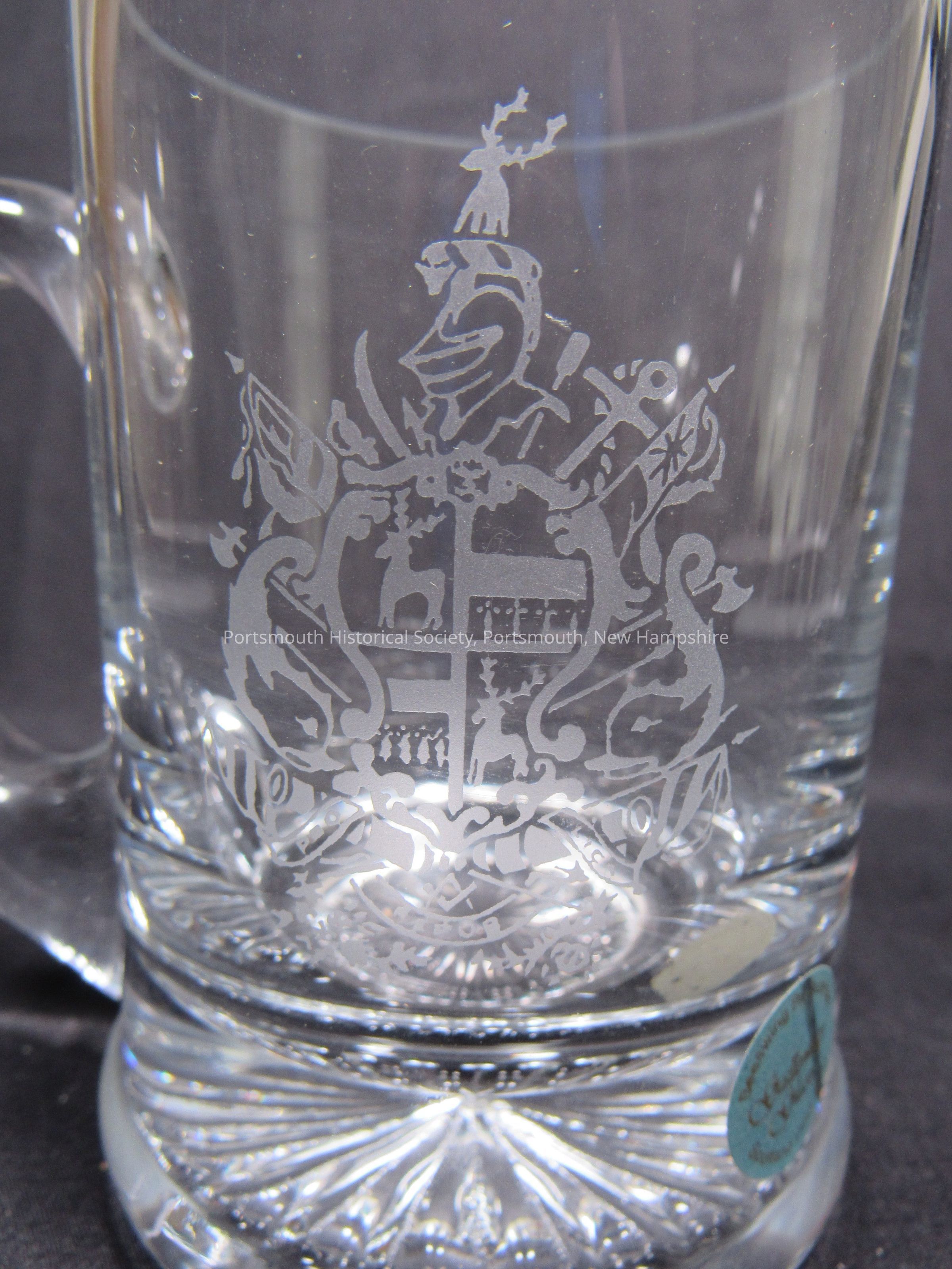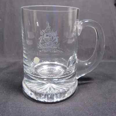 Clear glass mug, with etched John Paul Jones coat of arms, twentieth century. Paper sticker reads: “Beeswing By Dumfries / Galloway Glass / Scotland DG2 8 ED’”; “GG” scratched on bottom.Acquisition