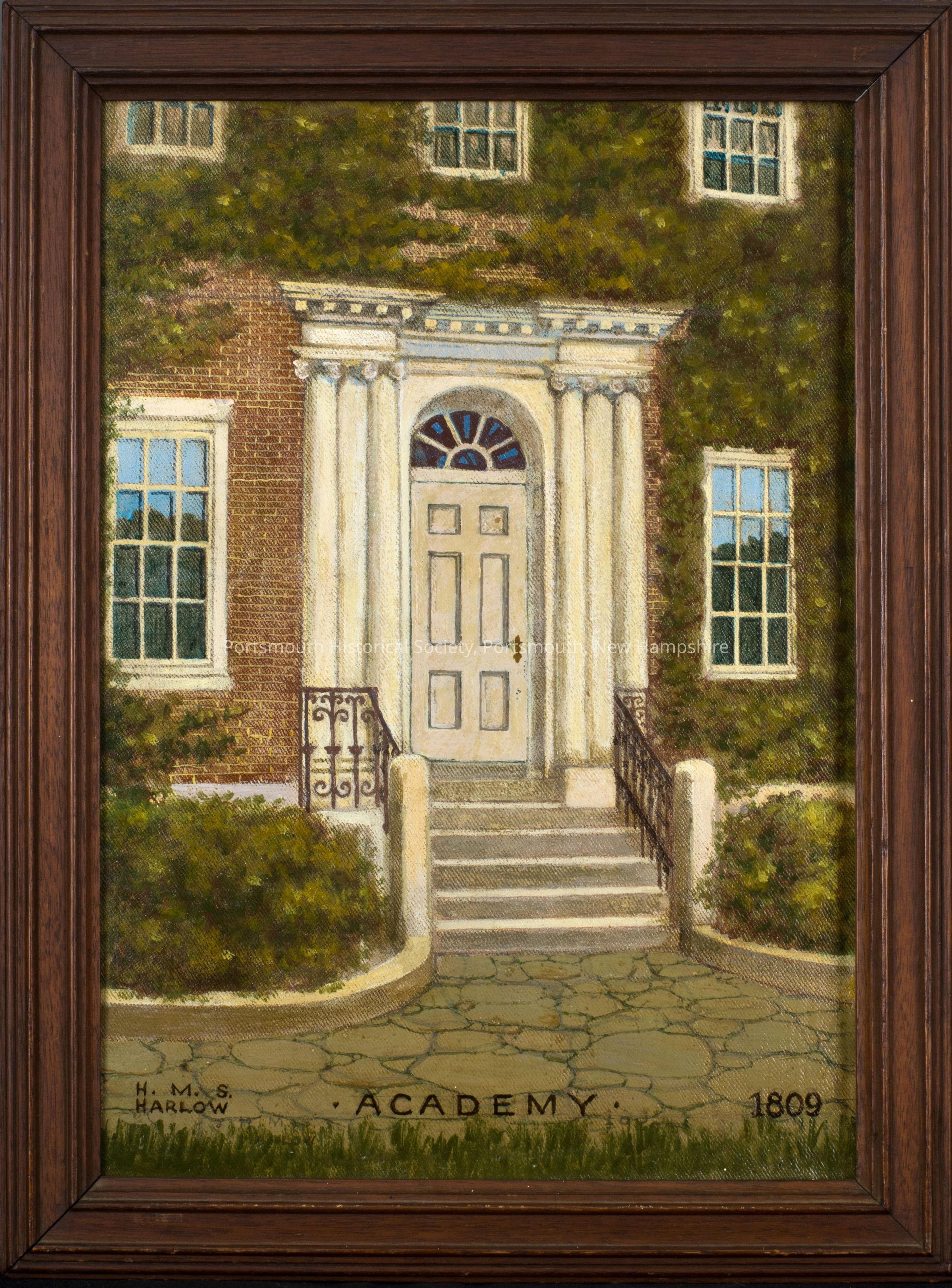 Painting of the Academy Building - Islington St. Probably part of Portsmouth Doorways series. Possibly part of Sawtelle donation. See also 2009.083a26. Inscribed on back: "LIBRARY / DOORWAY" in molded mahogany frame that differs from the other "Doorways" style frame.Acquisition