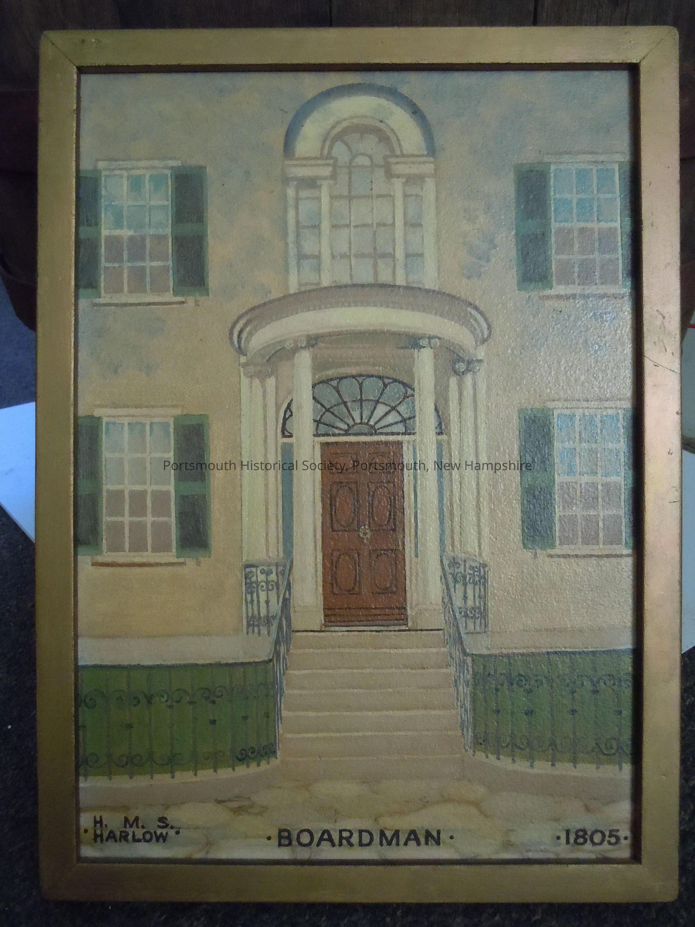 Small painting, part of Harlow's "Portsmouth Doorway" series, depicting front door or the home of Langley Boardman on Middle Street, depicting brown paneled front door with columnar portico, arched window above, flanked by six-over-six windows with green shutters; iron railing at side of steps and in front of house.