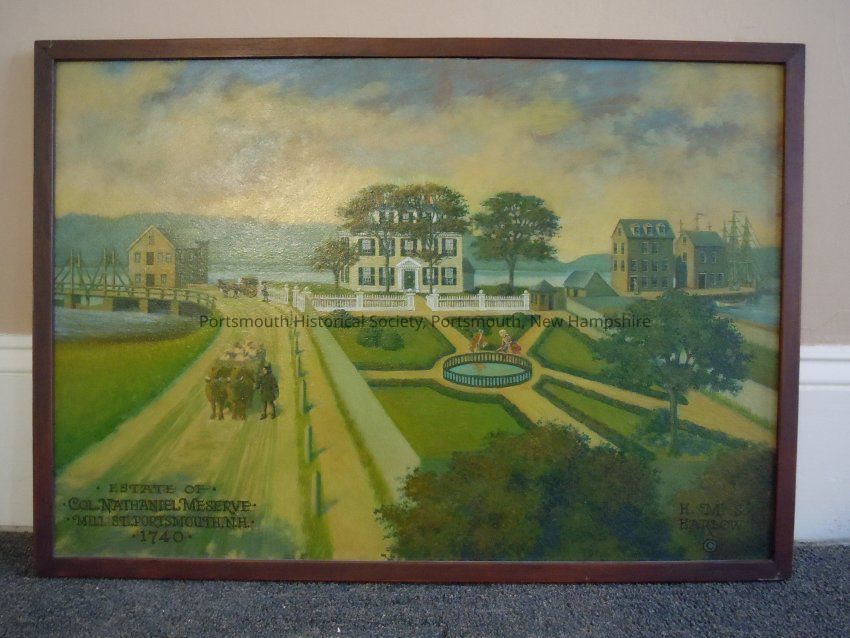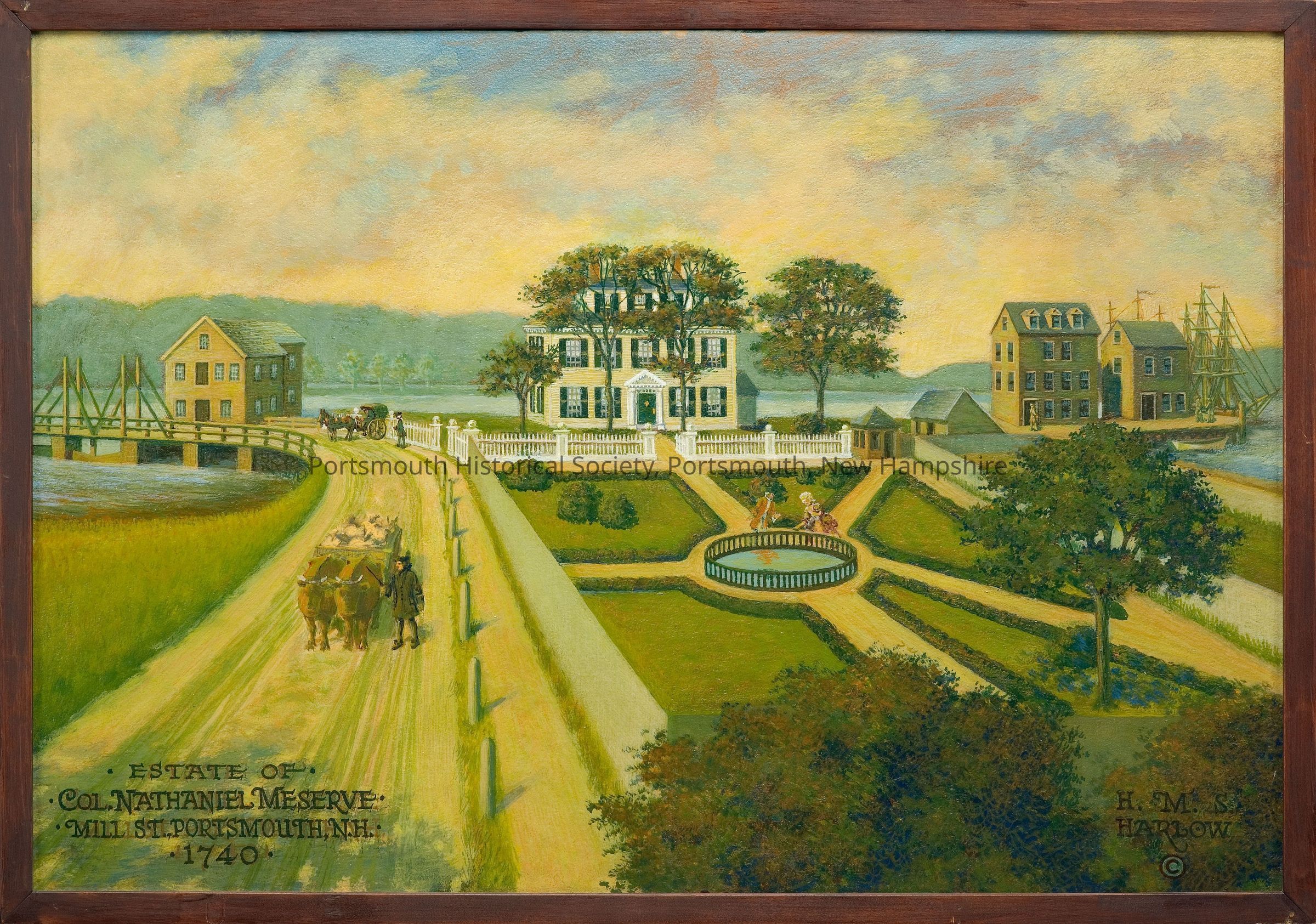 Harlow's view of the "Estate of Col. Nathaniel Meserve, Mill St., Portsmouth, 1740" depicts the elaborate house and garden built by Meserve, a shipbuilder. It was later owned by Peter Livius and his wife in 1764, and then by Col. George Boyd, a British officer. Both Livius and Boyd were Loyalists in the Revolution. The house survived until the twentieth century but no longer stands.Type of Painting