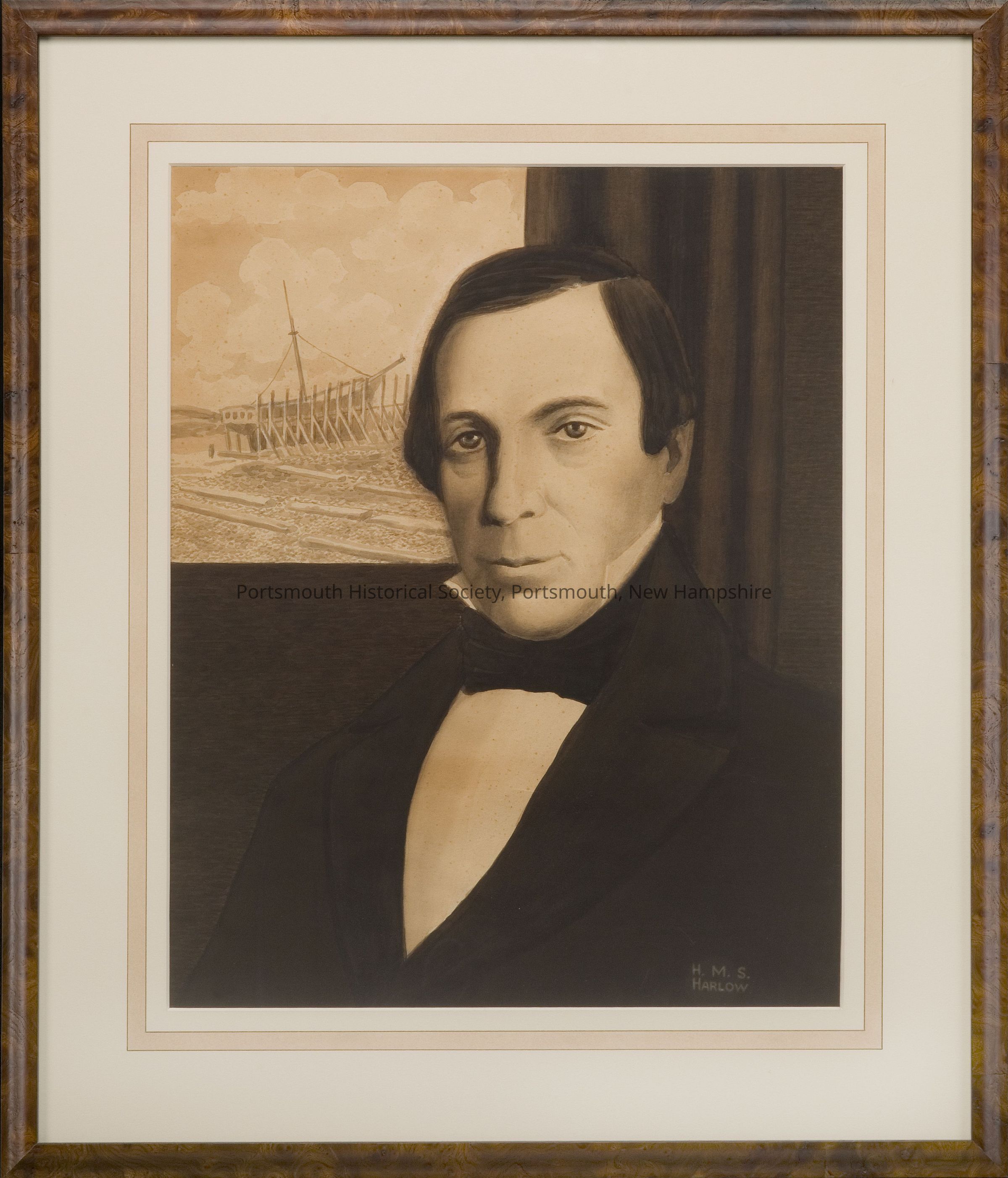 Sepia gouache by HMS Harlow on academy board, sepia gouche, 20"by 24" modern mahogony frame, (B15) portrait of George Rayne, shipbuilder (with ship frame in background), signedArtwork Details