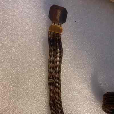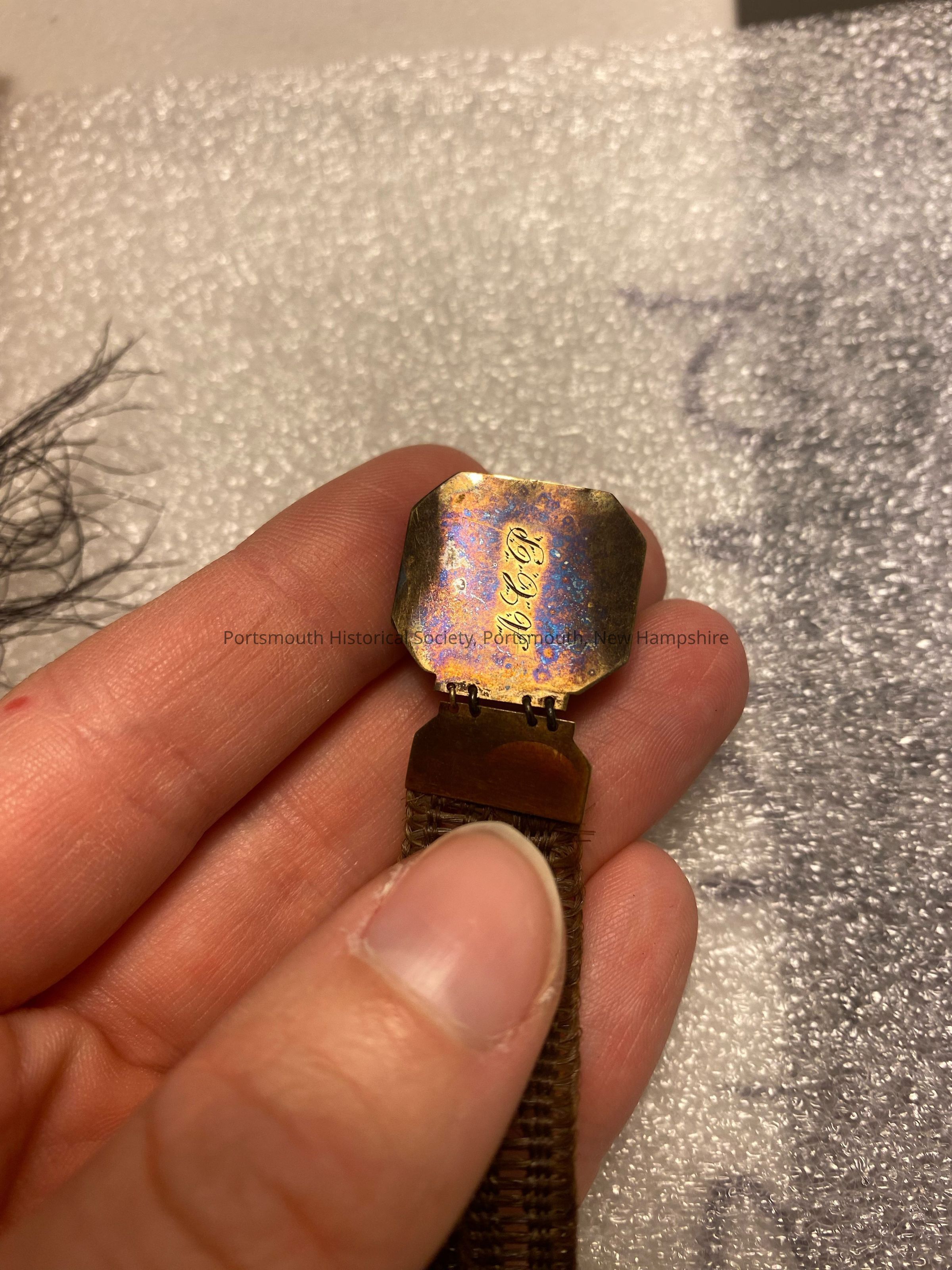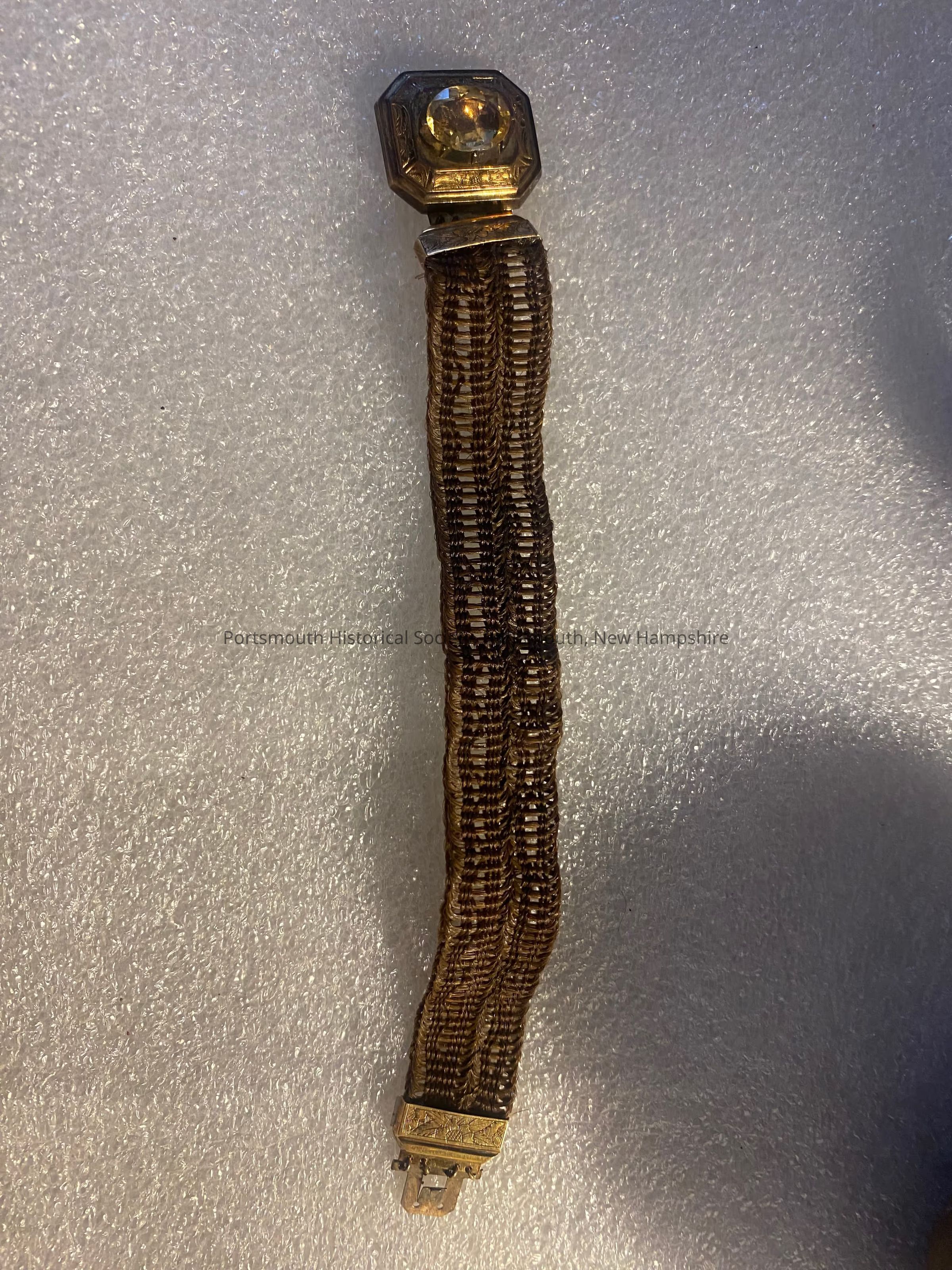 Woven hair bracelet that is brown in color with a semi-precious stone on gold mounts.Acquisition