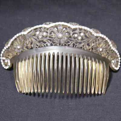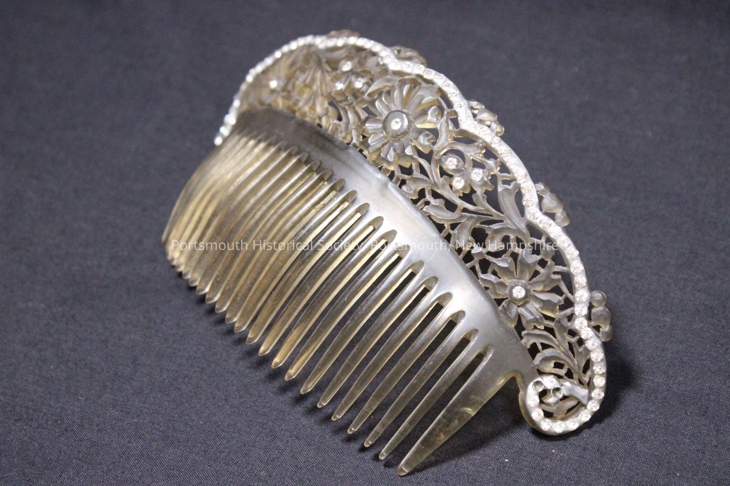 Ladies celluloid hair comb. Comb is light in color and partially translucent. Comb has a band of carved floral pattern with inset diamond-like stones. Comb has twenty-three straight prongs. Found in collection.Acquisition