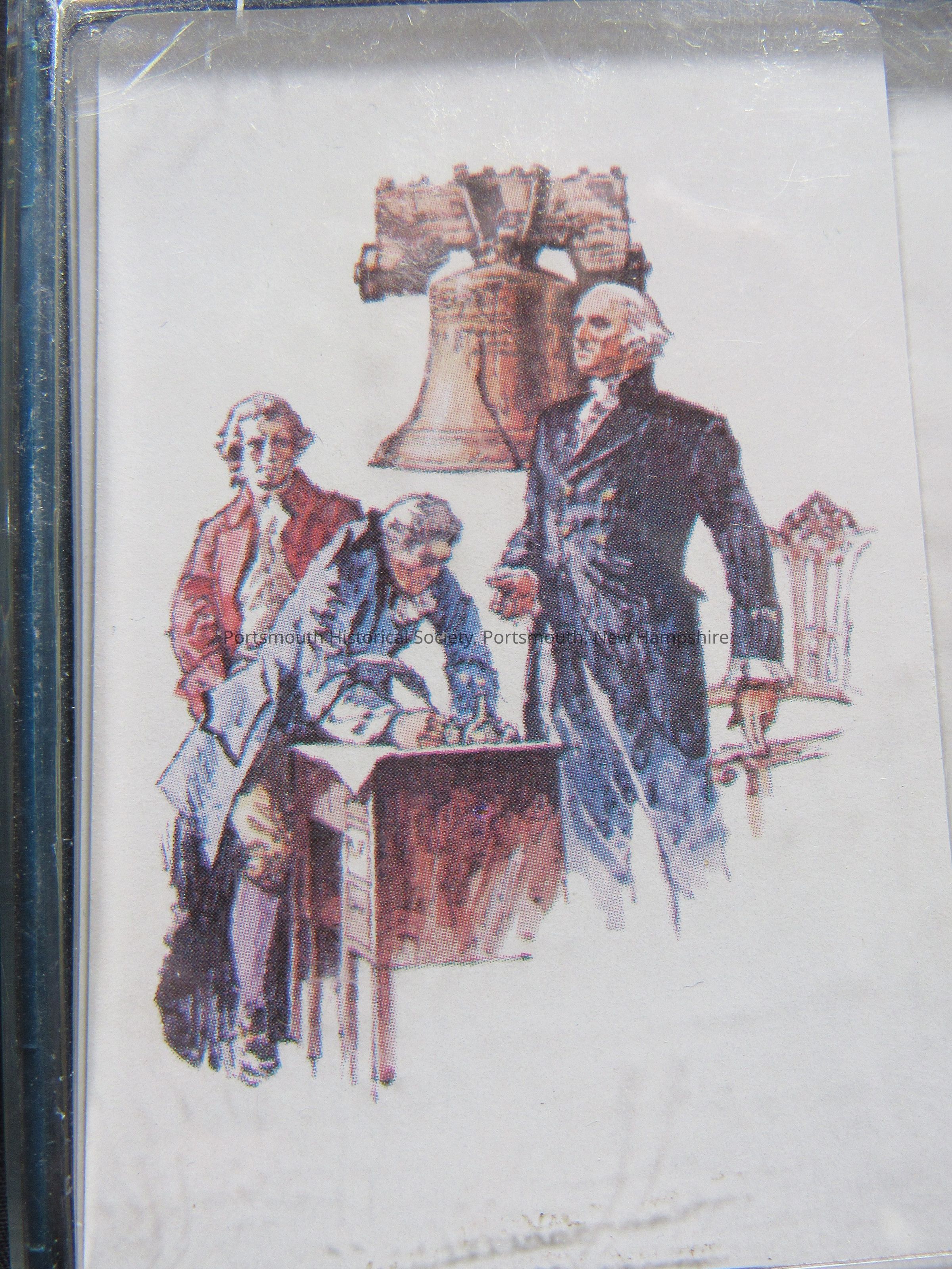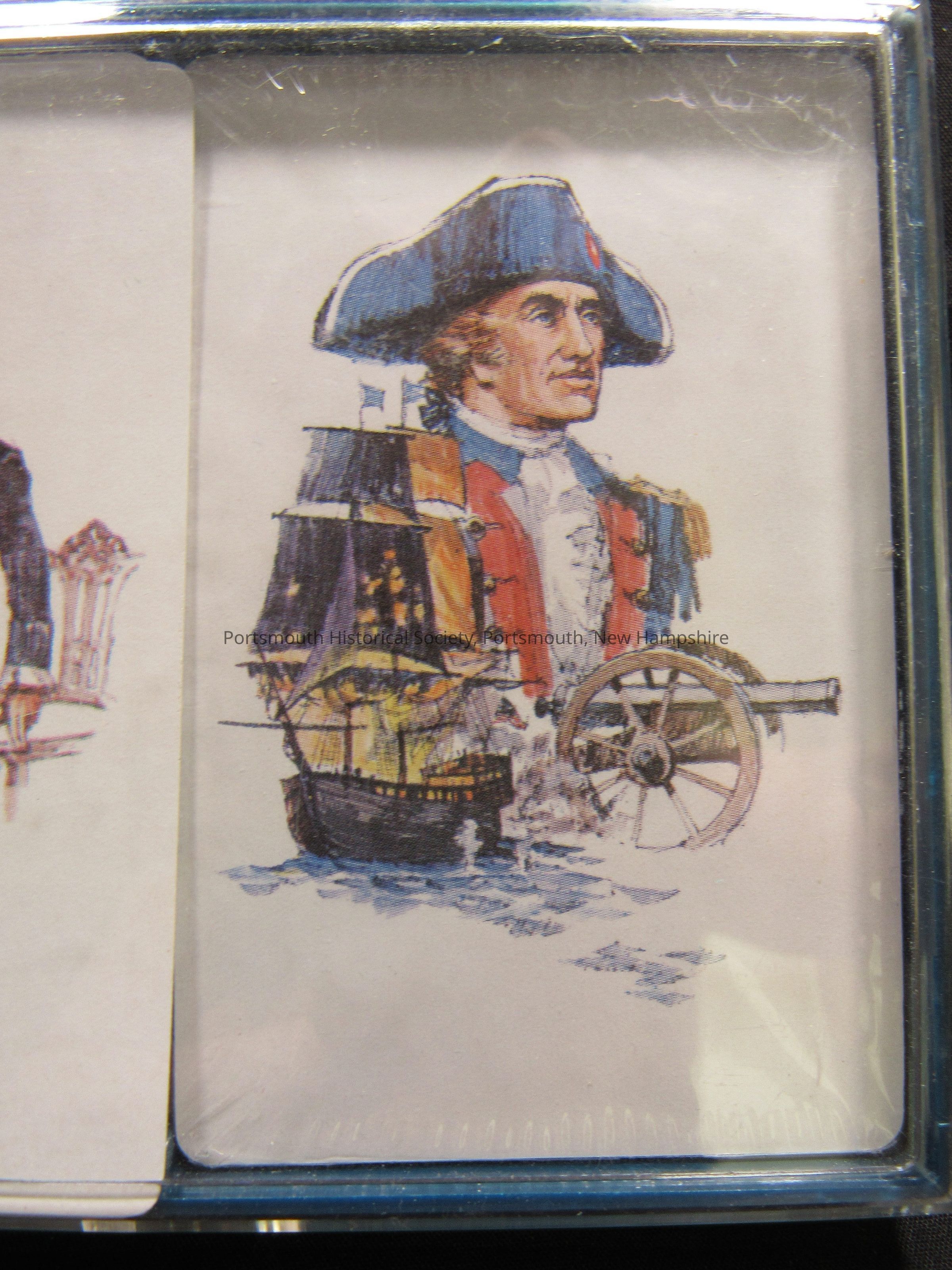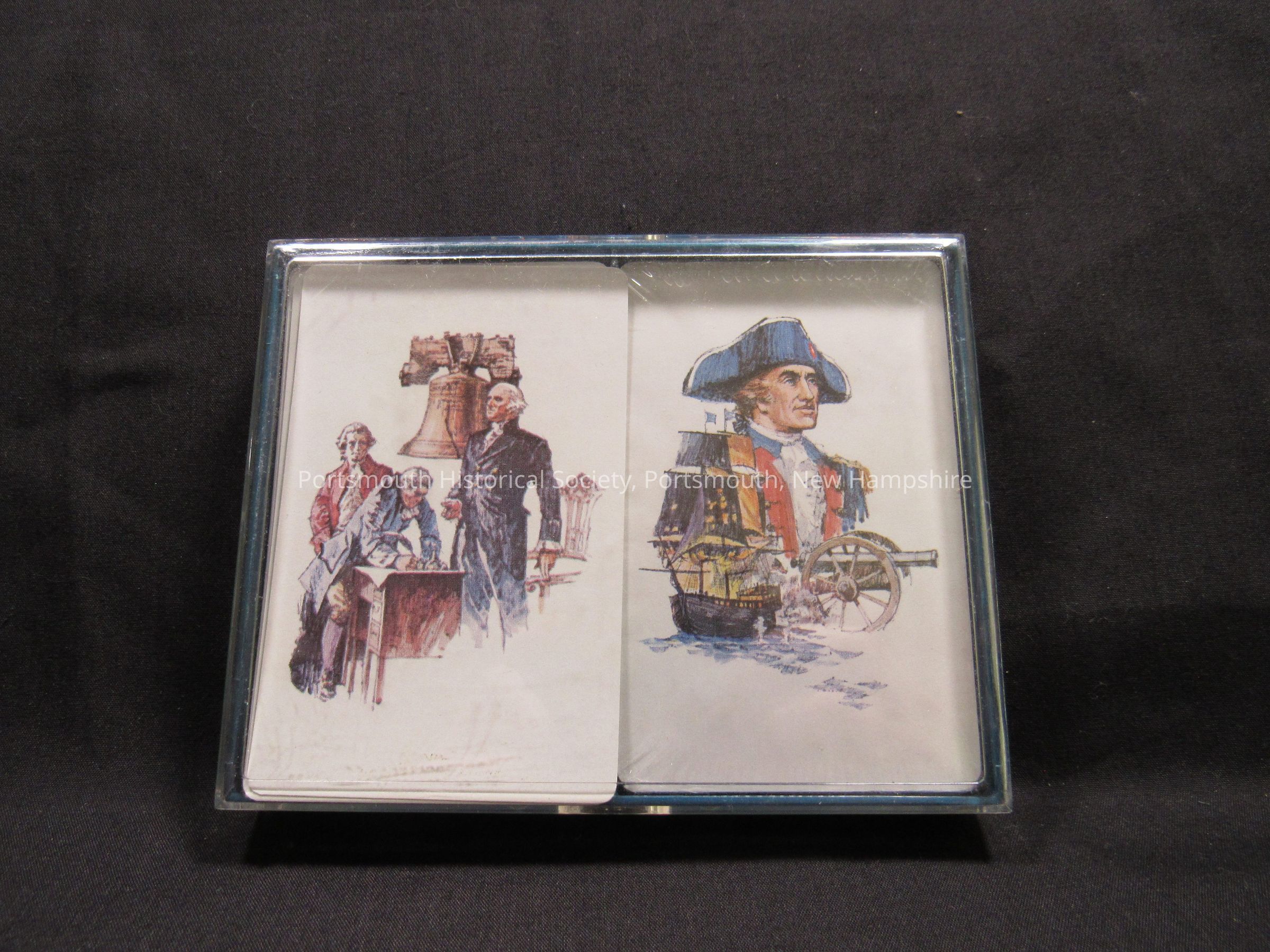 Royale plastic-coated playing cards in plastic case; two decks, one with image of Washington, the Liberty Bell, and two other figures; the other with JPJ, ship, and a cannon. Made by Heines House, Minneapolis, MN 55401, A TDC CompanyAcquisition