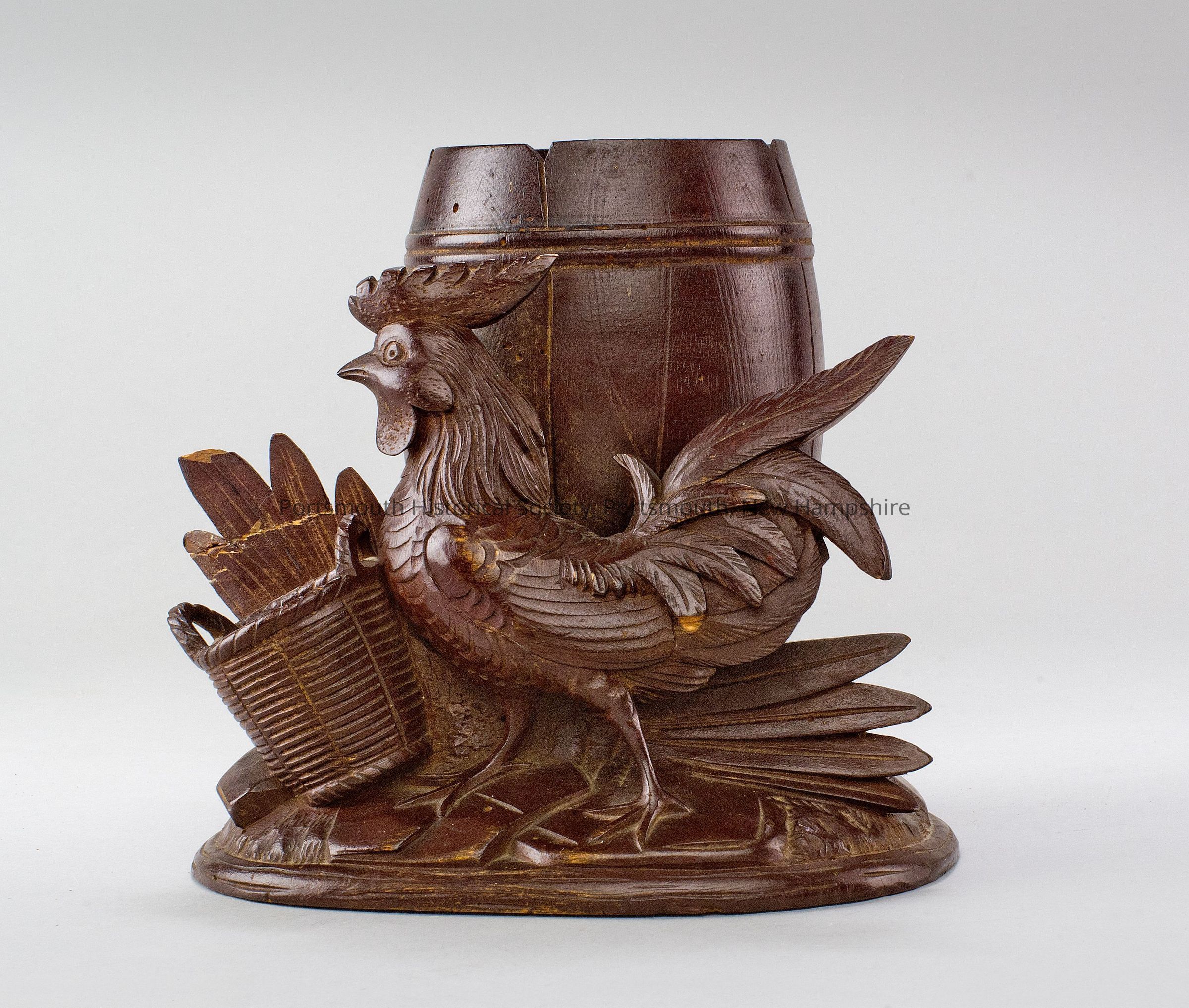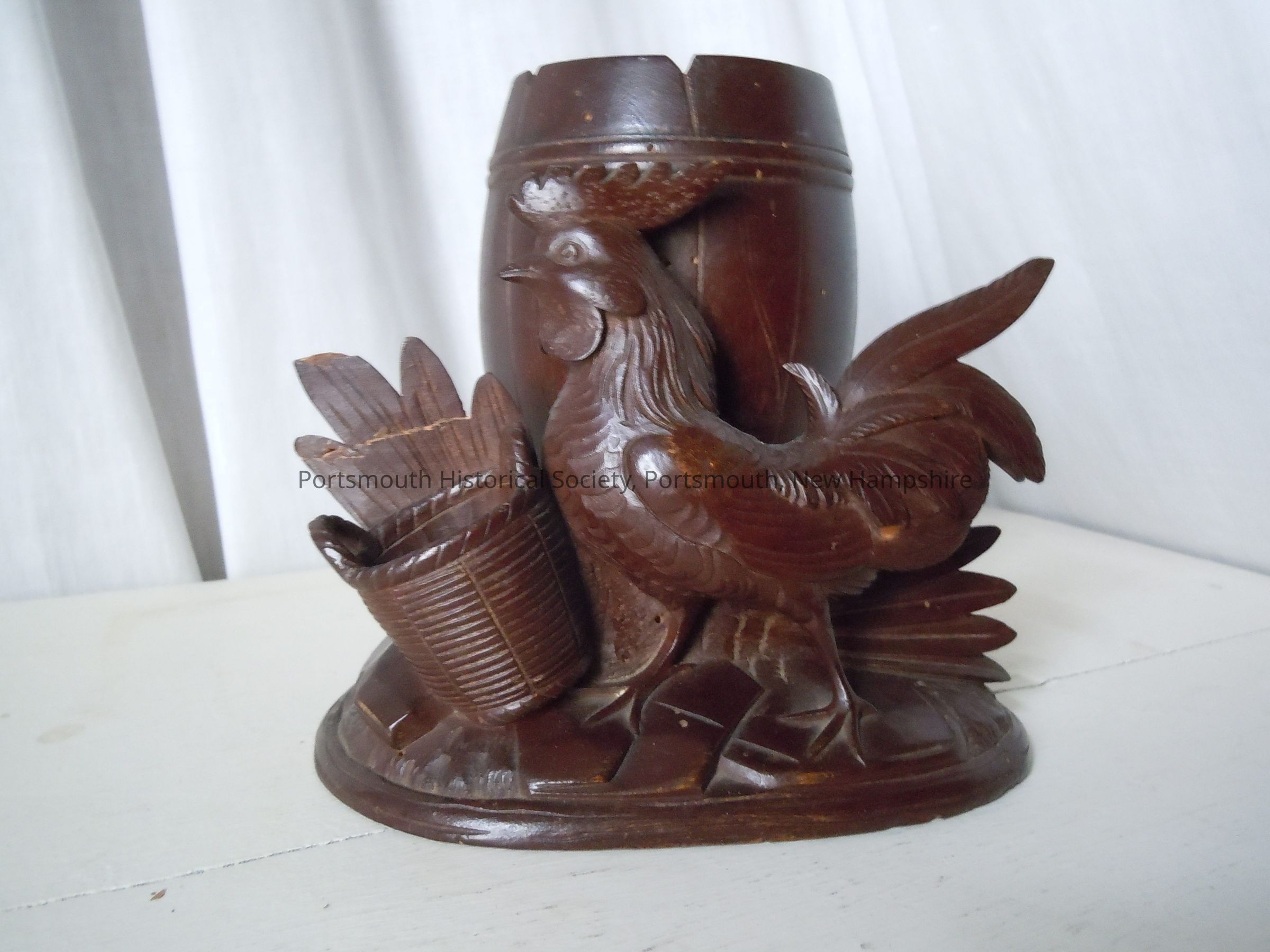 Wooden carving of a rooster with barrel and bucket by John Haley Bellamy.