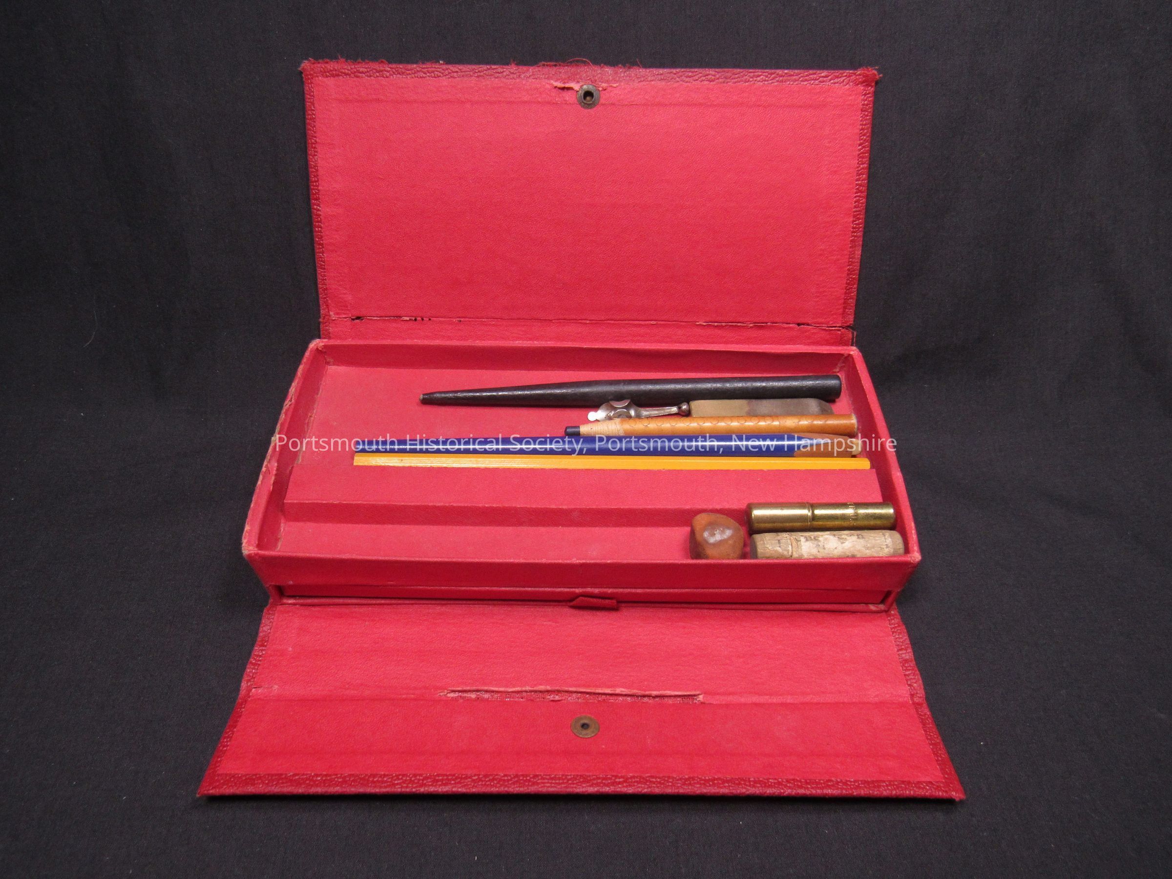 Drafting kit or pencil box featuring JPJ on lid, with pencils, eraser, and other items, made by Joseph Dixon Crucible Co., Jersey City, N.J., mid twentieth century. Cardboard; H. 1 ¼ in., W. 8 ½ in., D. 3 ¾ in.Acquisition