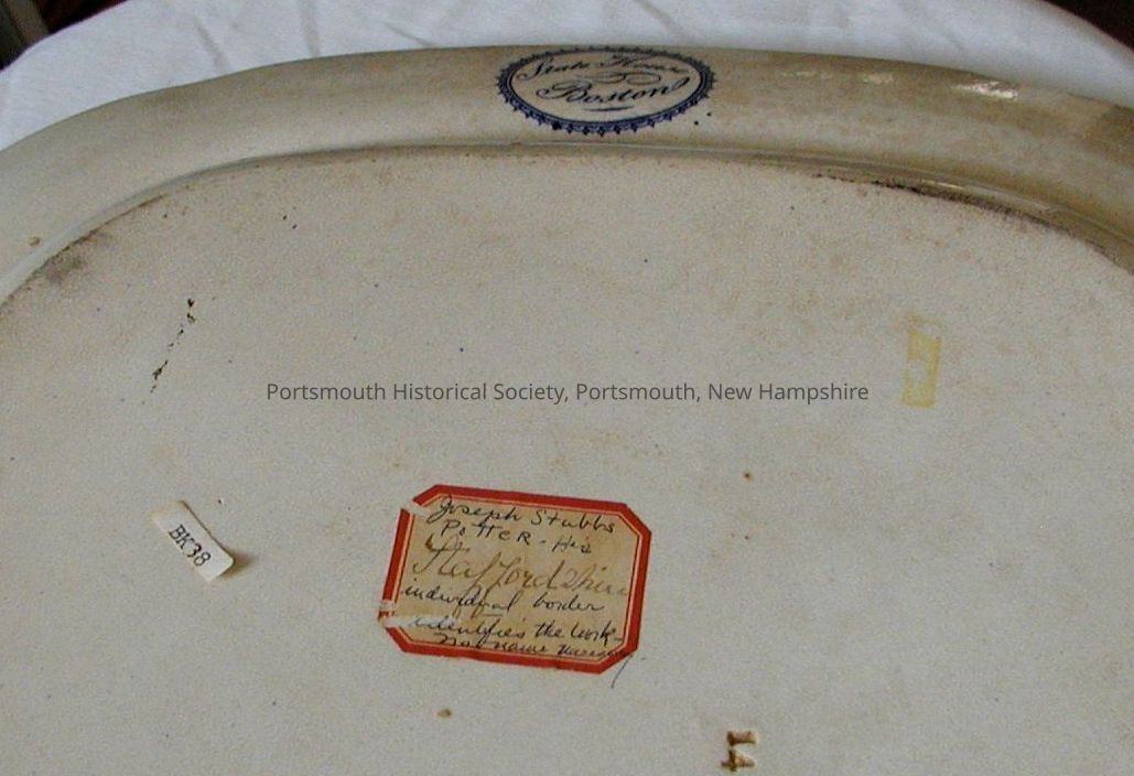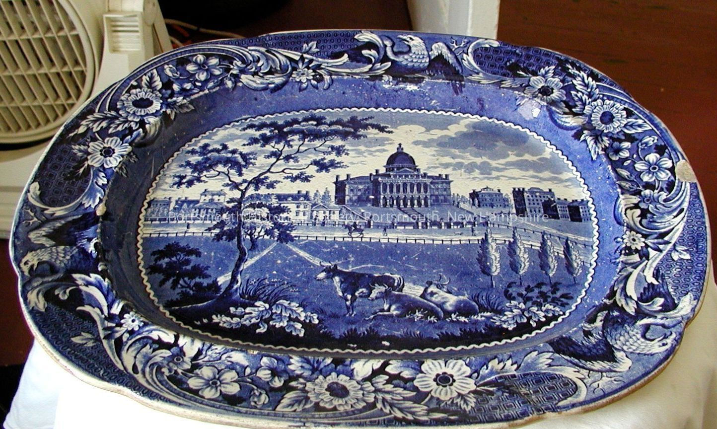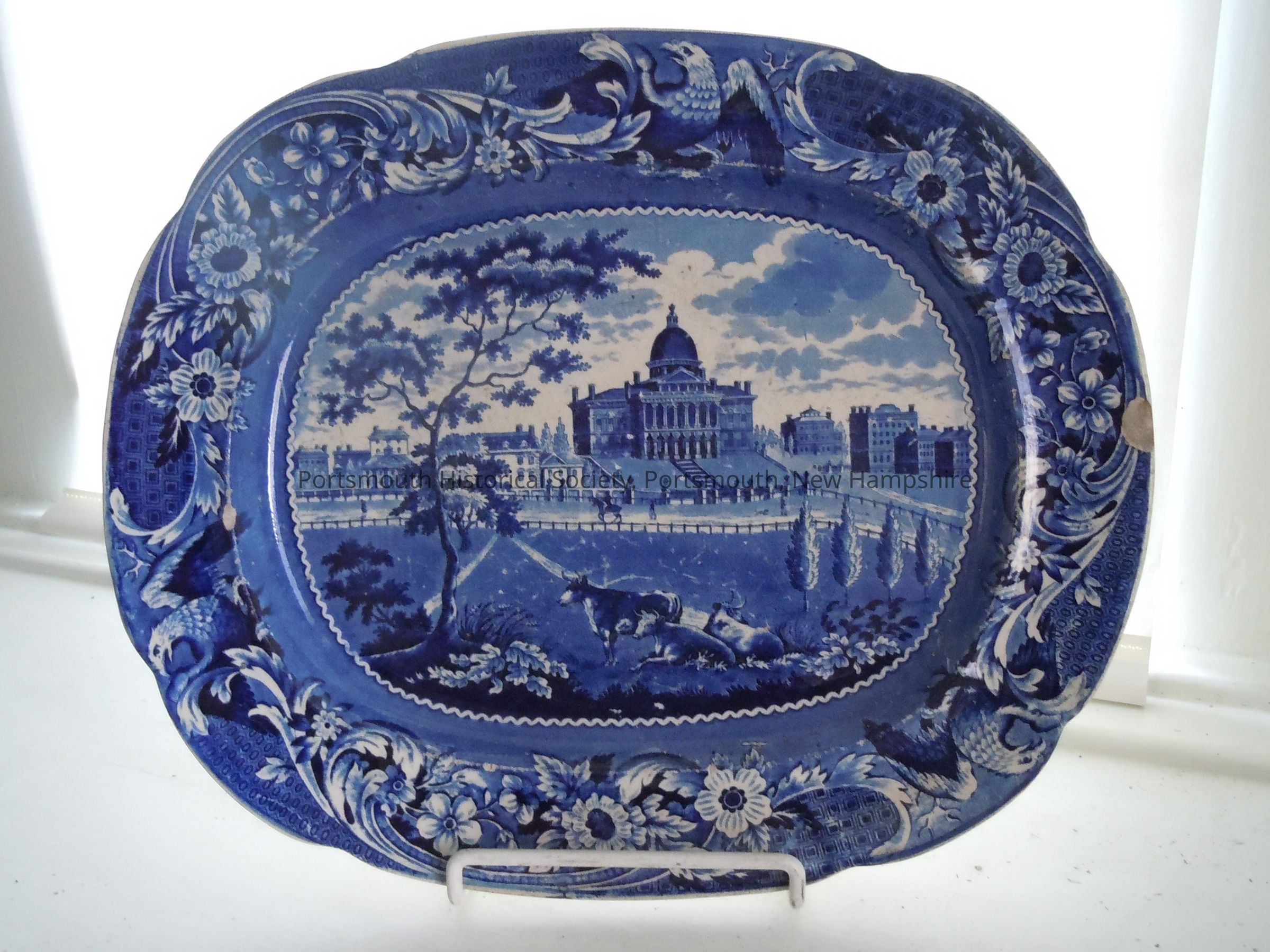 Blue and white Staffordshire platter with image of the Boston State House. Made by Joseph Stubbs, as evidenced by the eagle decoration on the border.
