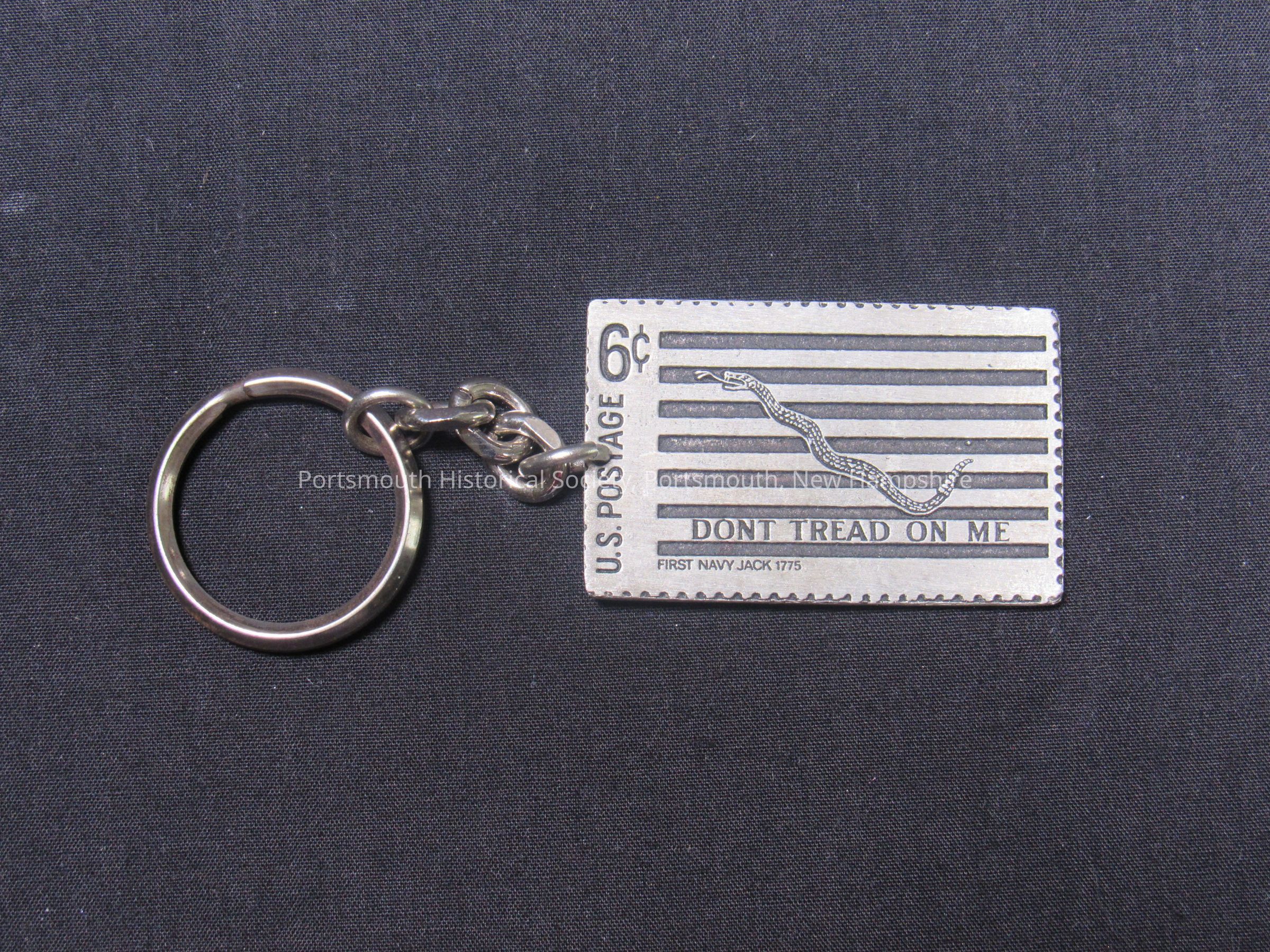 Keychain in the form of a stamp, in original cardboard box with metal liner. "U.S. POSTAGE 6 [cent sign] / "Don't Tread on Me" / FIRST NAVY JACK 1775." Back marked "DORY / 10801"Acquisition
