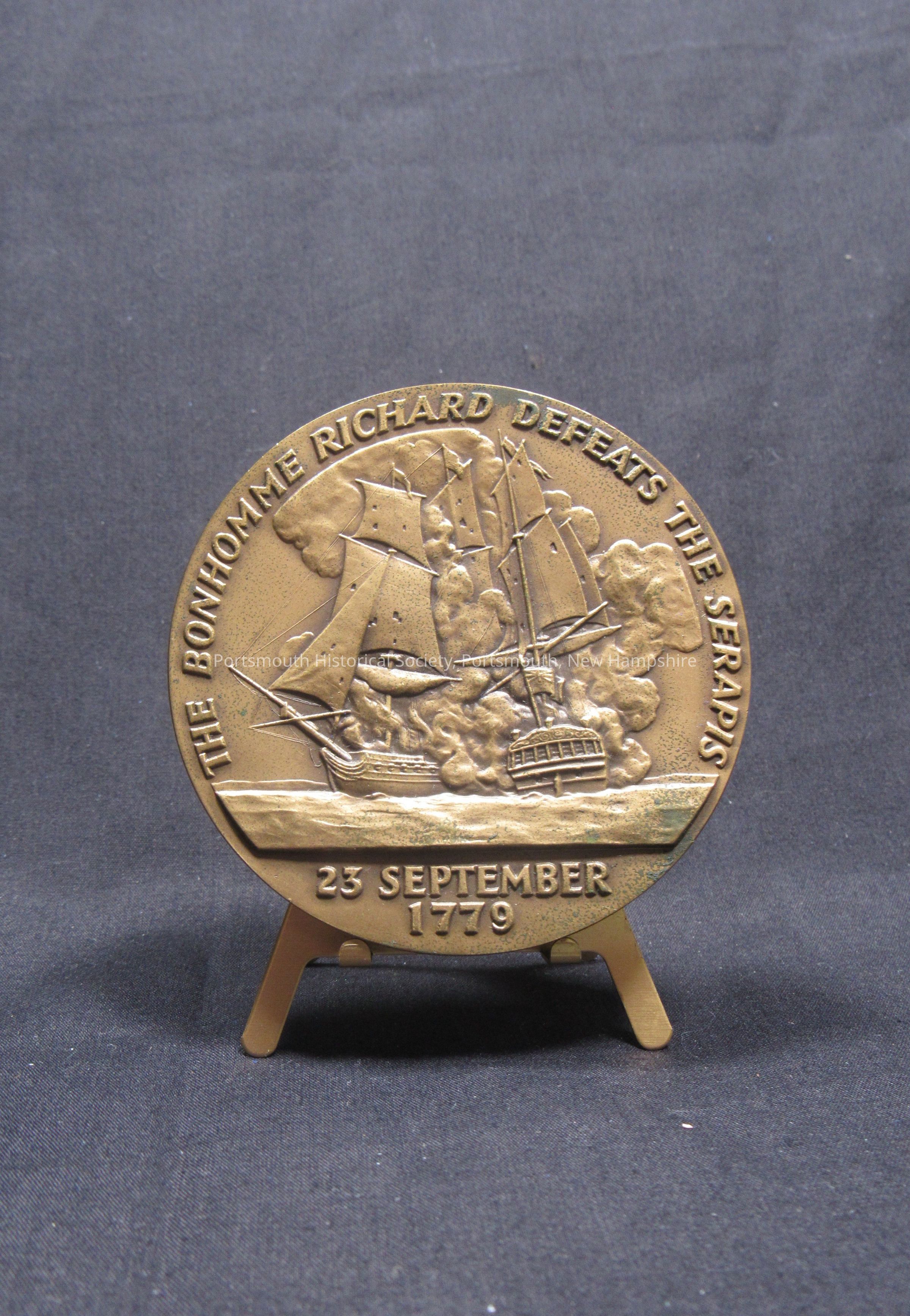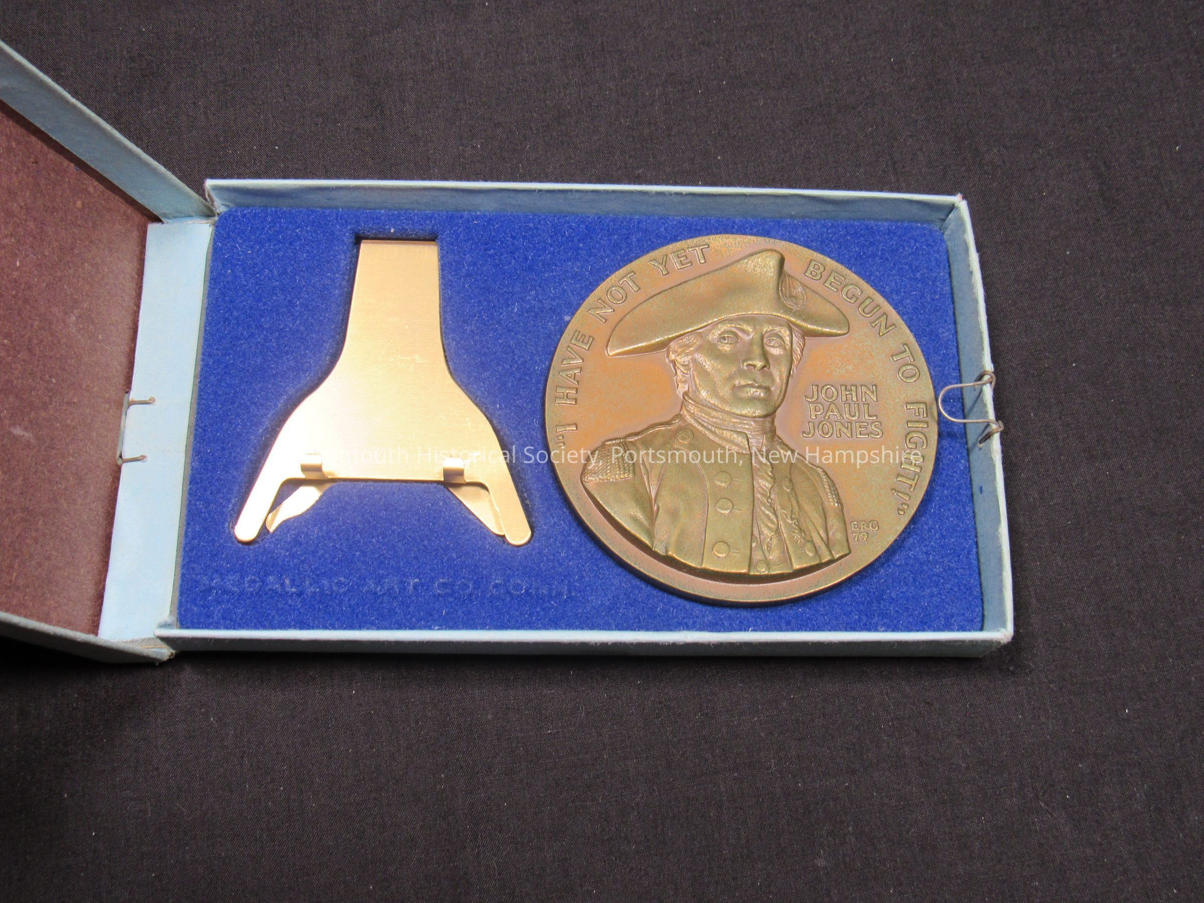 Medal, featuring JPJ and Bon Homme Richard. Bronze with stand, in light-blue original box. Medal diam. 3 in. Medal marked ERG / 79.Acquisition