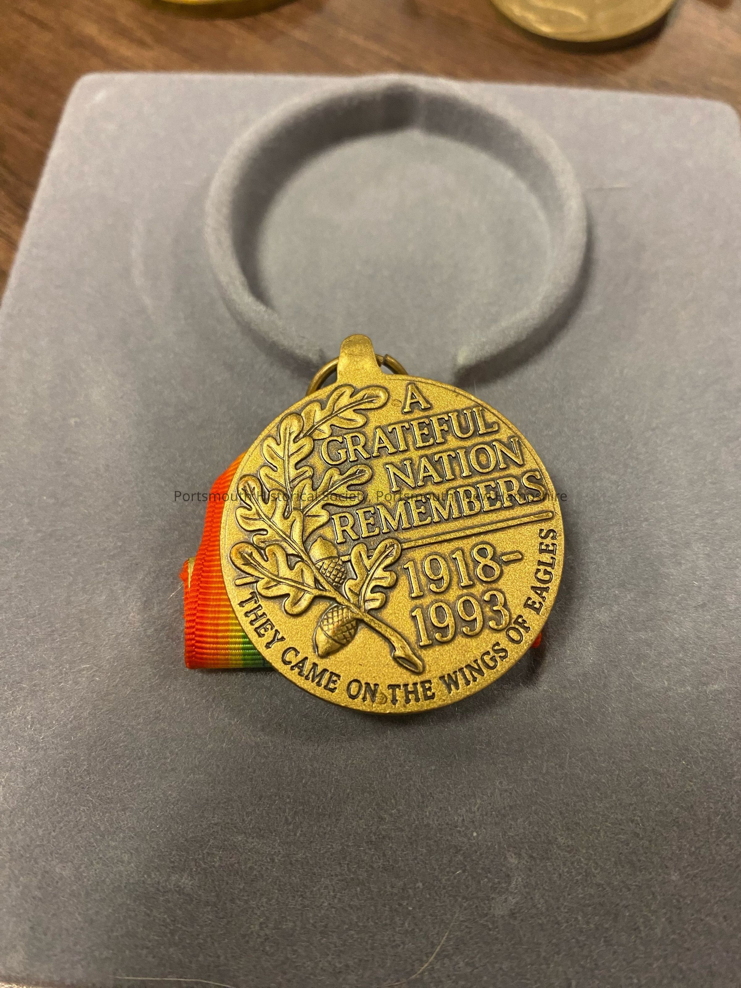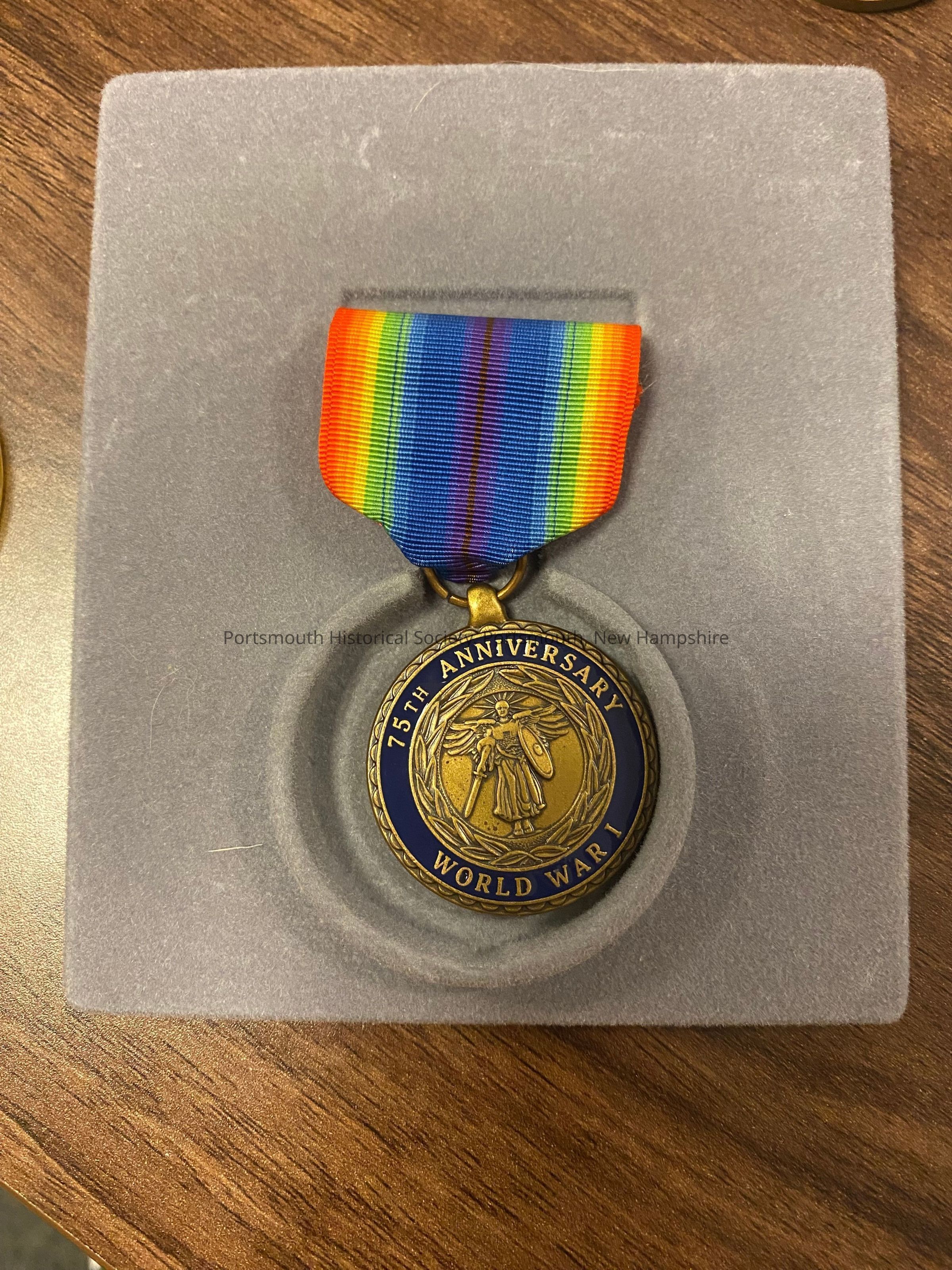 75th Anniversary WWI Commemorative Medal presented to Justin Downing Hartford. On the front is an image of a winged Victory surrounded by a laurel wreath. There is a navy blue outer circle around the image that reads, "75TH ANNIVERSARY / WORLD WAR I." On the back is an oak leaf with two acorns attached with "A / GRATEFUL / NATION / REMEMBERS . 1918 - / 1993" and under that, " THEY CAME ON THE WINGS OF EAGLES."