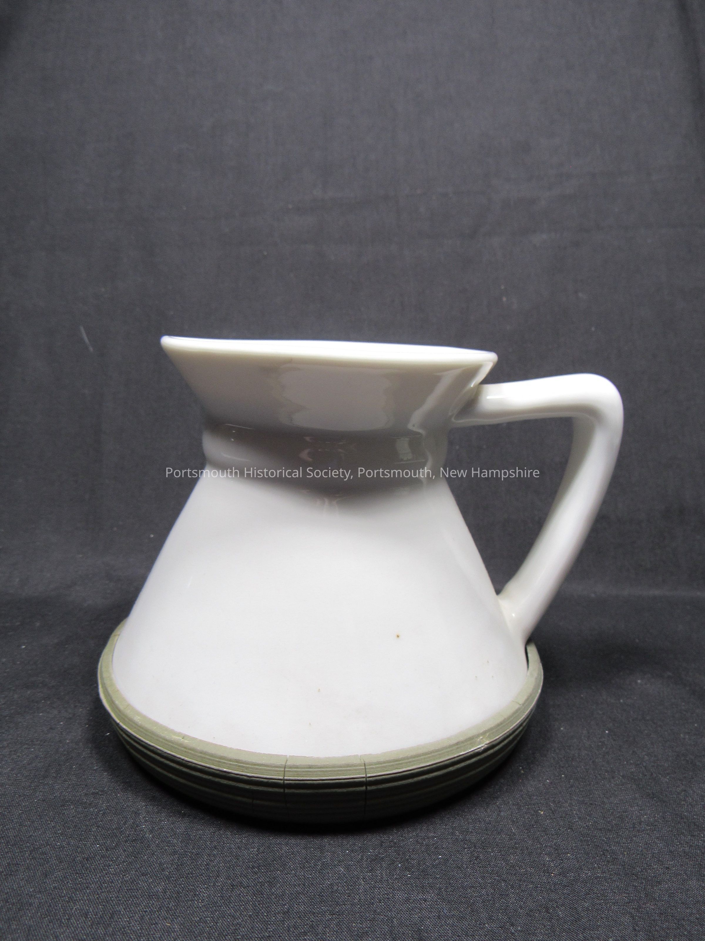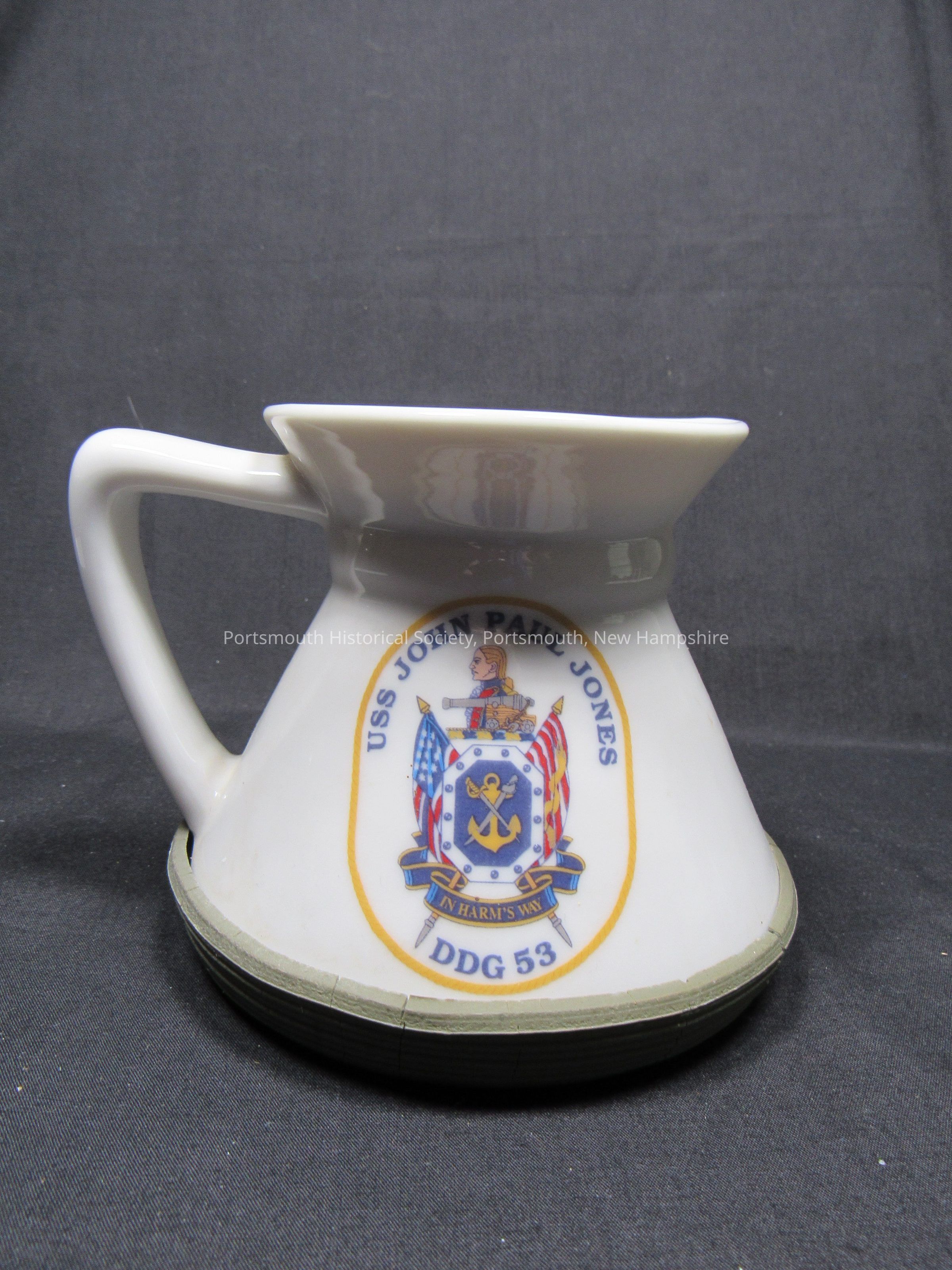 Coffee mug, USS John Paul Jones / DDG 53. White ceramic, with rubber fitting and separate rubber base, angular handle. Marked on bottom: "MILITARY / [eagle] \ COLLECTIBLES / ARMED FORCES CHINA CO. / SAN DIEGO, CA."Acquisition