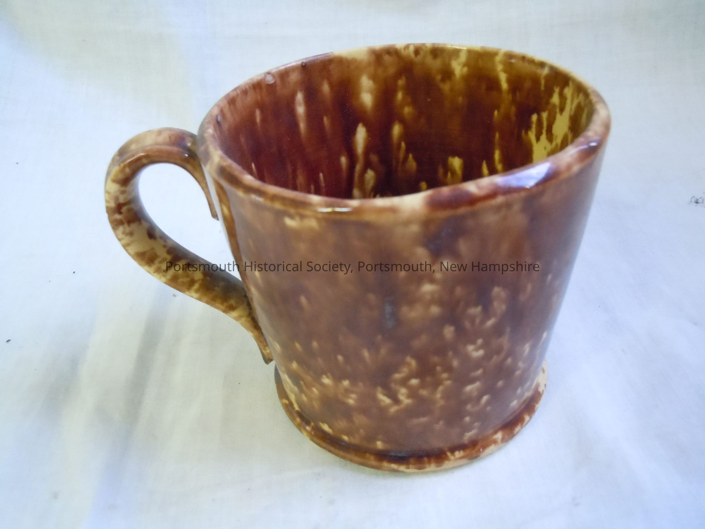 Brown and cream patterned, "Rockingham" glaze, Bennington-style mug, with loop handle.