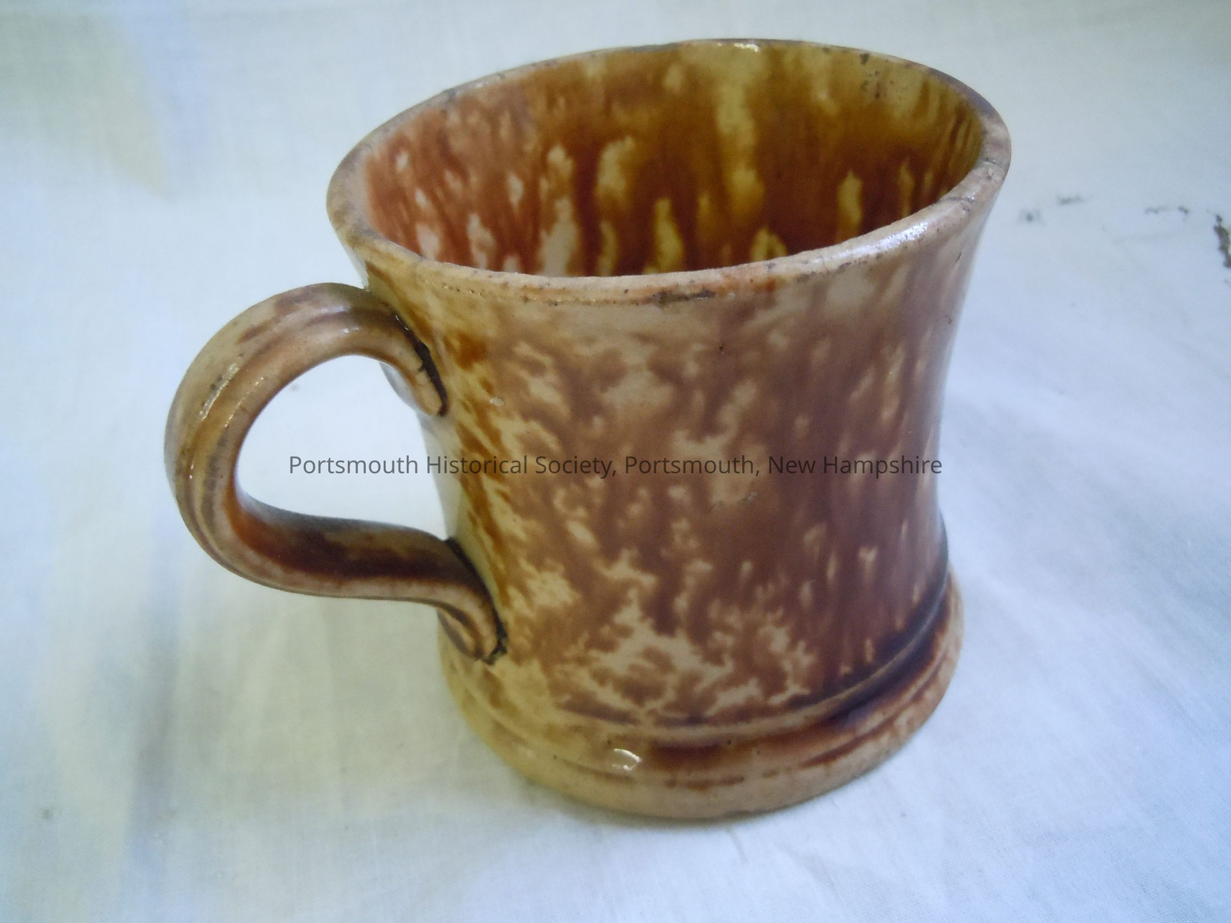 Brown and cream patterned, "Rockingham" glaze, Bennington-style mug with loop handle.
