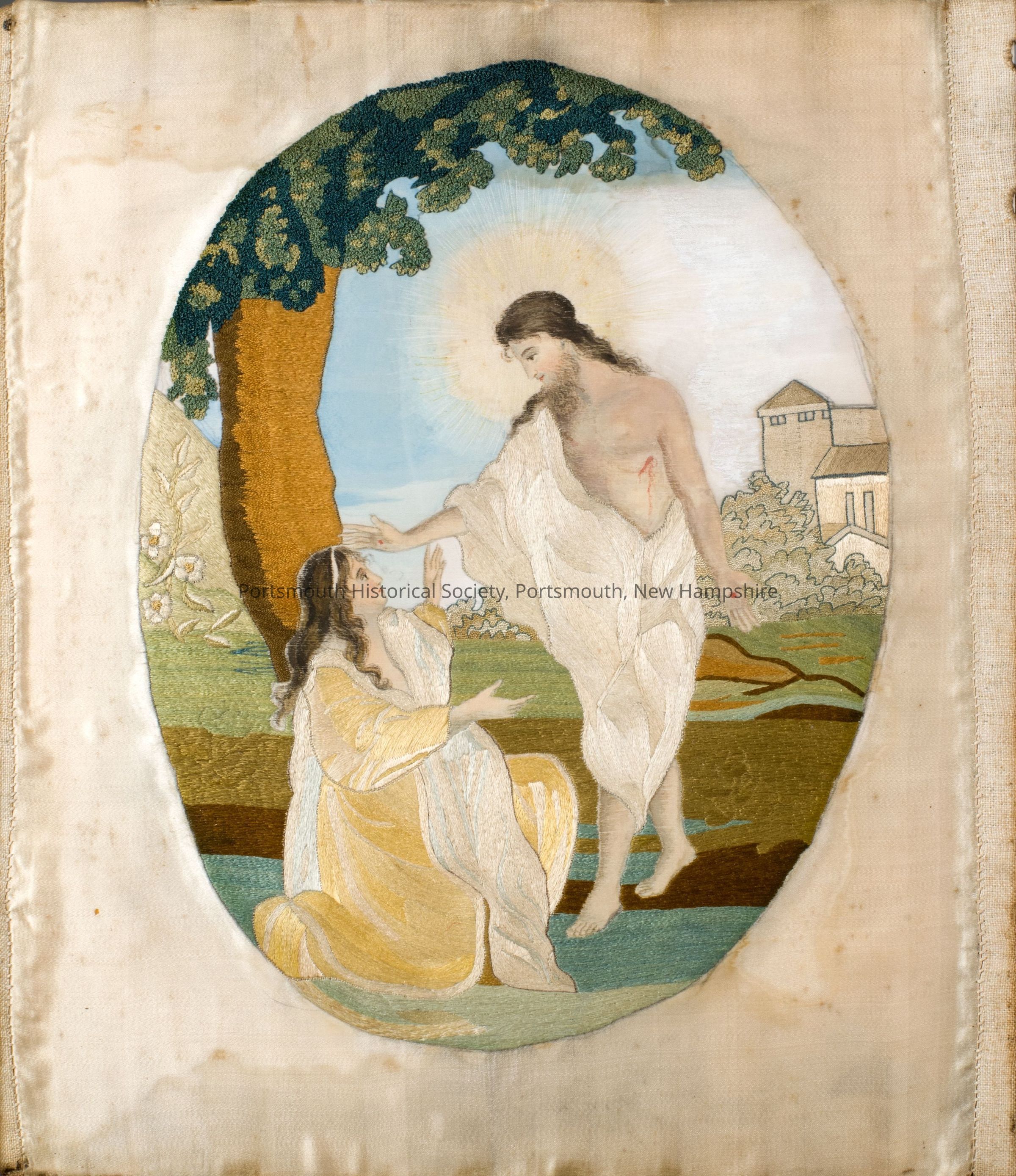 Framed picture, silk embroidery . Picture shows Jesus and Mary Magdalene.Acquisition