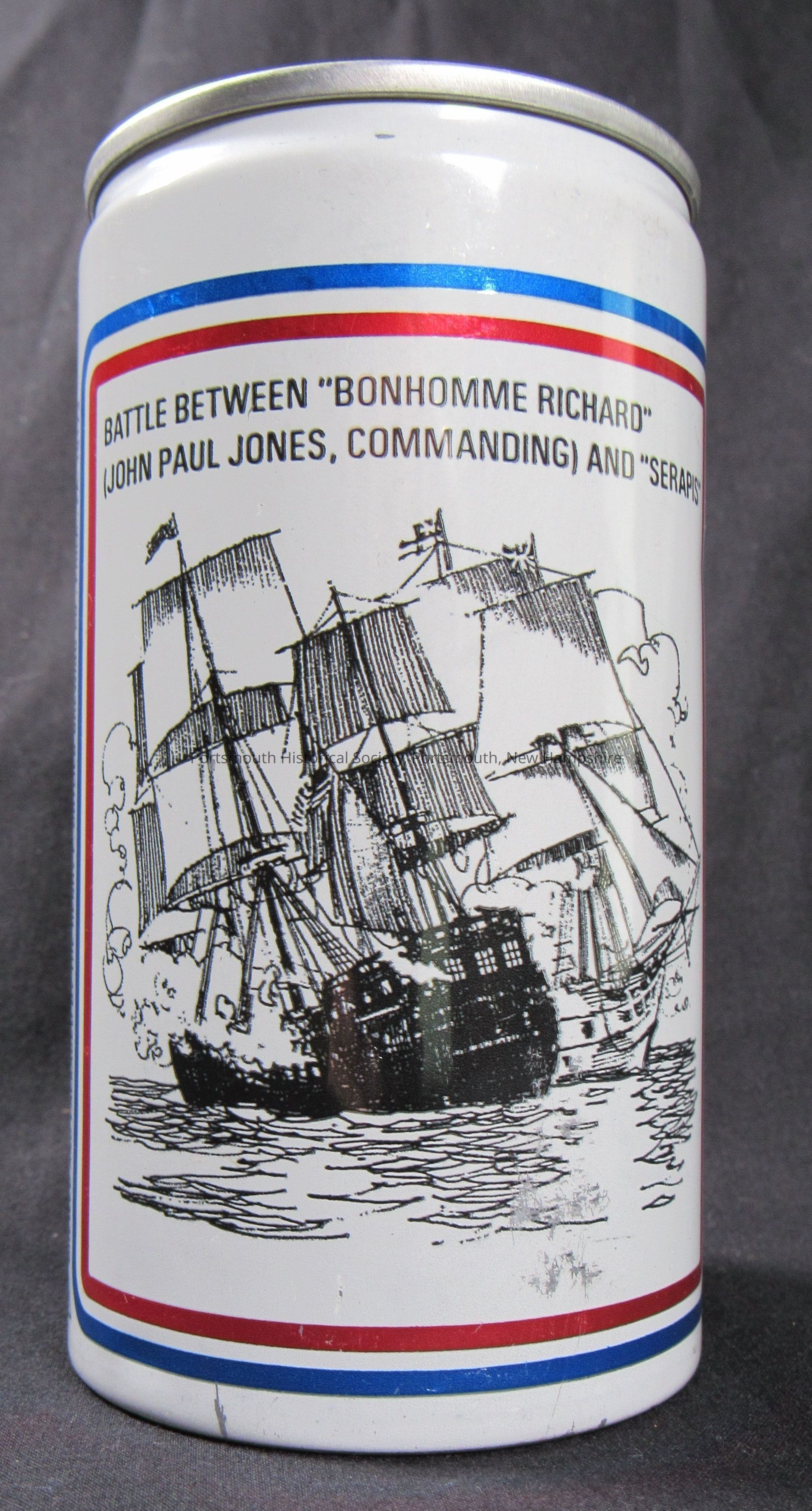 “Ortleib’s” 12 oz. beer can. Henry F. Ortleib Brewing Co., Philadelphia, ca. 1976. Aluminum; H. 4 ¾ in., diam. 2 ½ in. Opened on the bottom, no contents. Image and text relating to JPJ, Bon Homme Richard, and Serapis on side.Acquisition