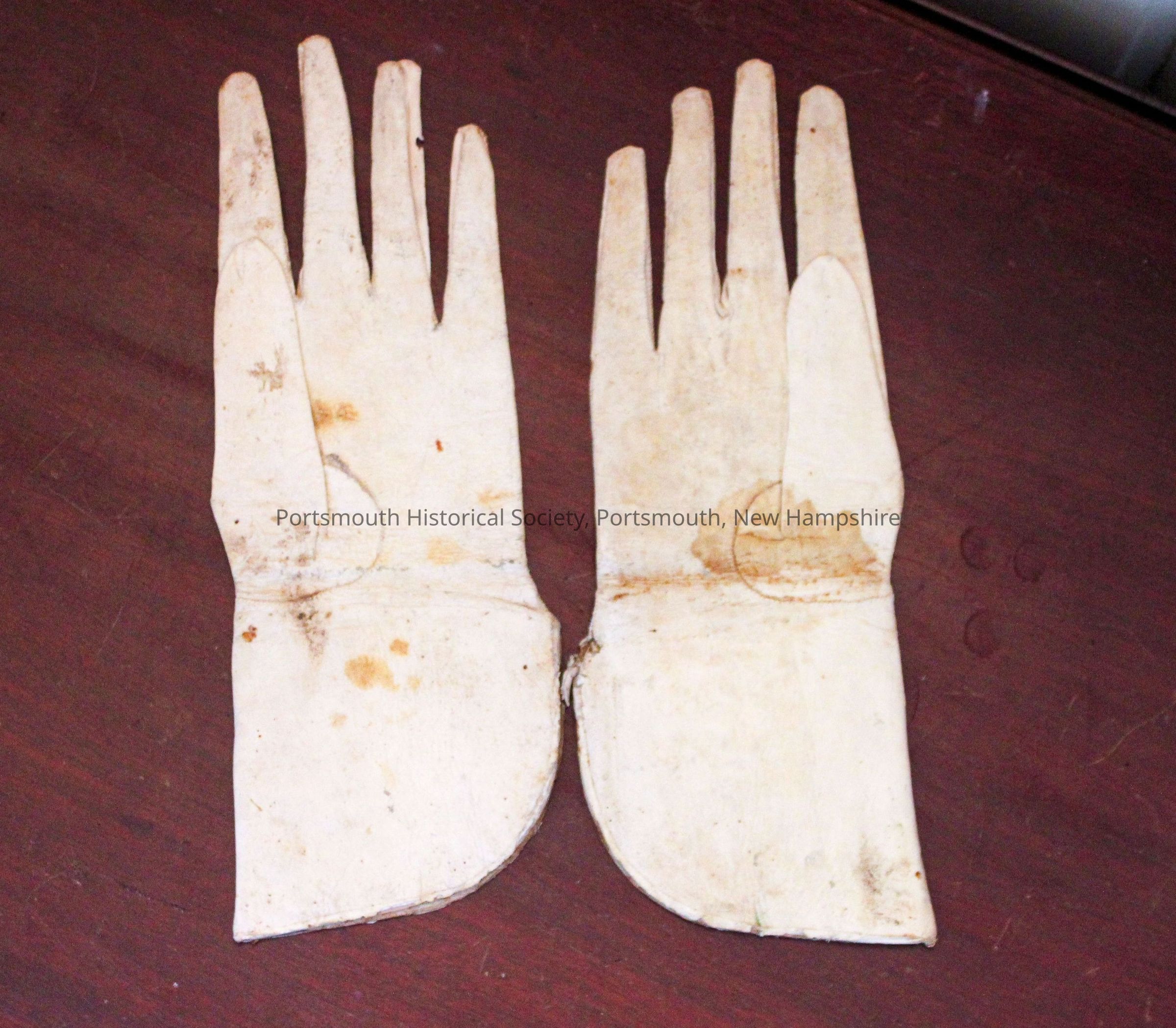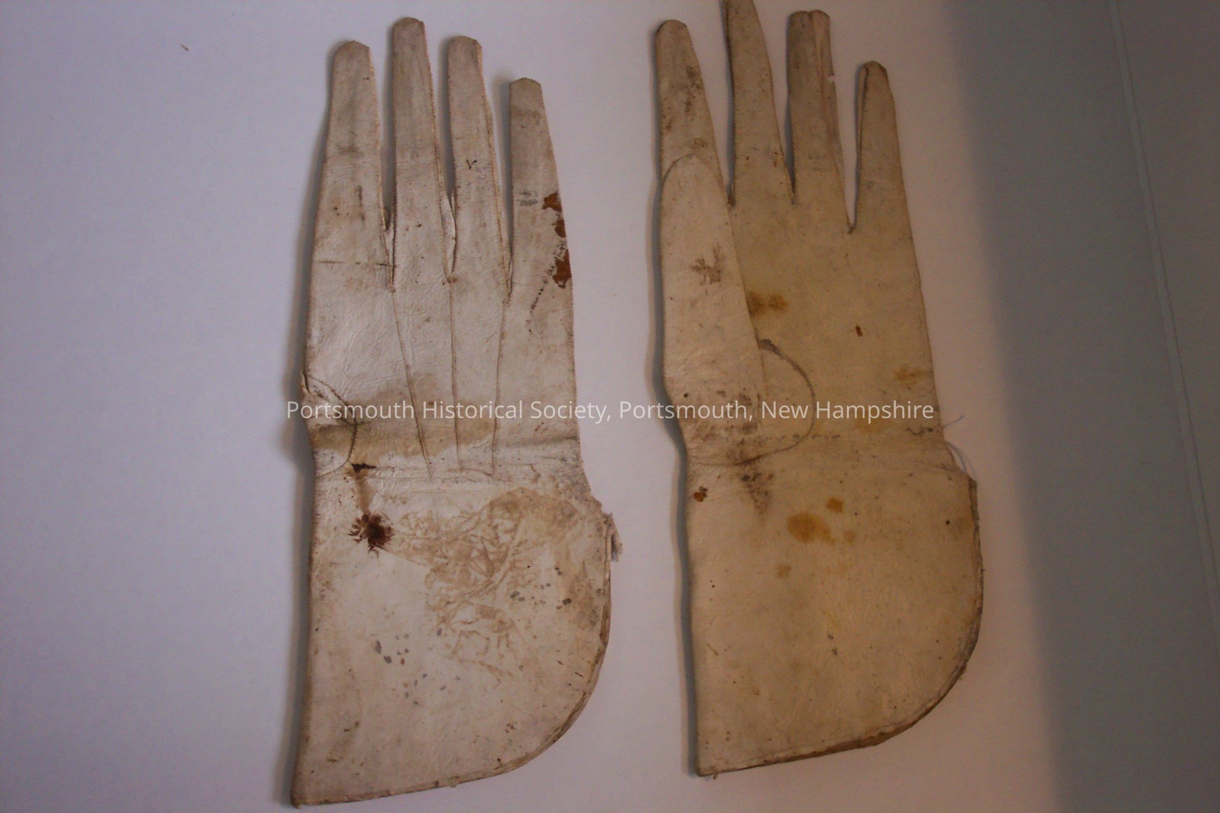 Pair of off-white leather funeral gloves. Gloves were presented to Benjamin Fernald for acting as a pall bearer. Extremely rare pair of funeral gloves. Inscription on inside of each glove (some of it is illegible). Right glove's inscription: "... by Benjamin Fernald of Kittery who died in about the year 1778." Left glove's inscription: "Presented to him ... acting as a pall bearer."