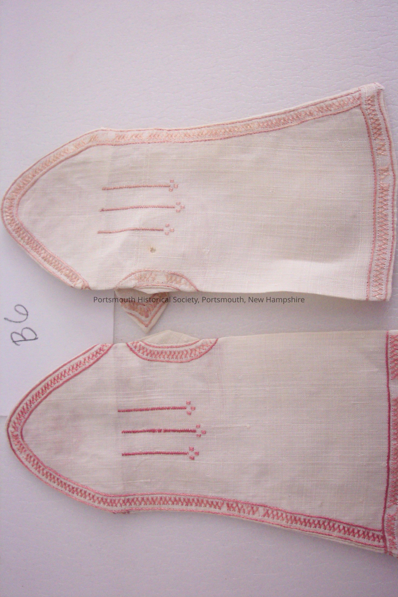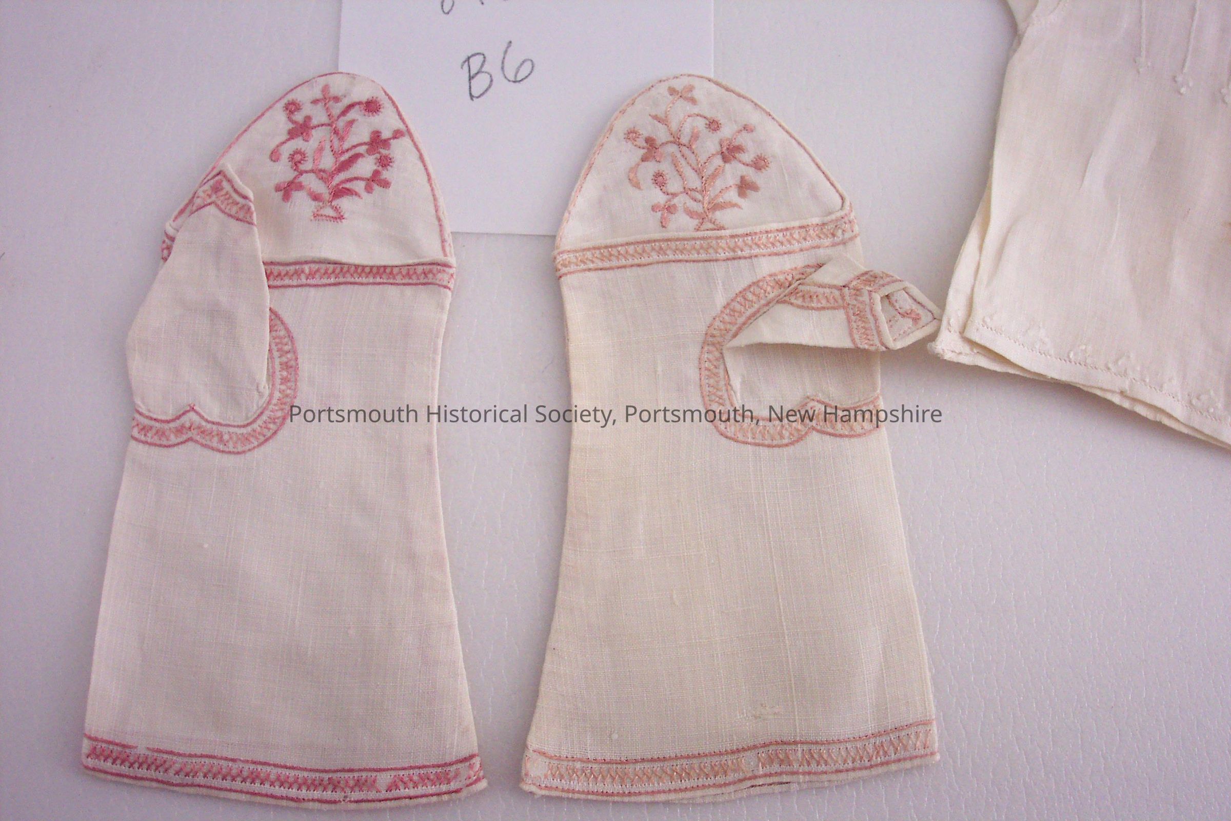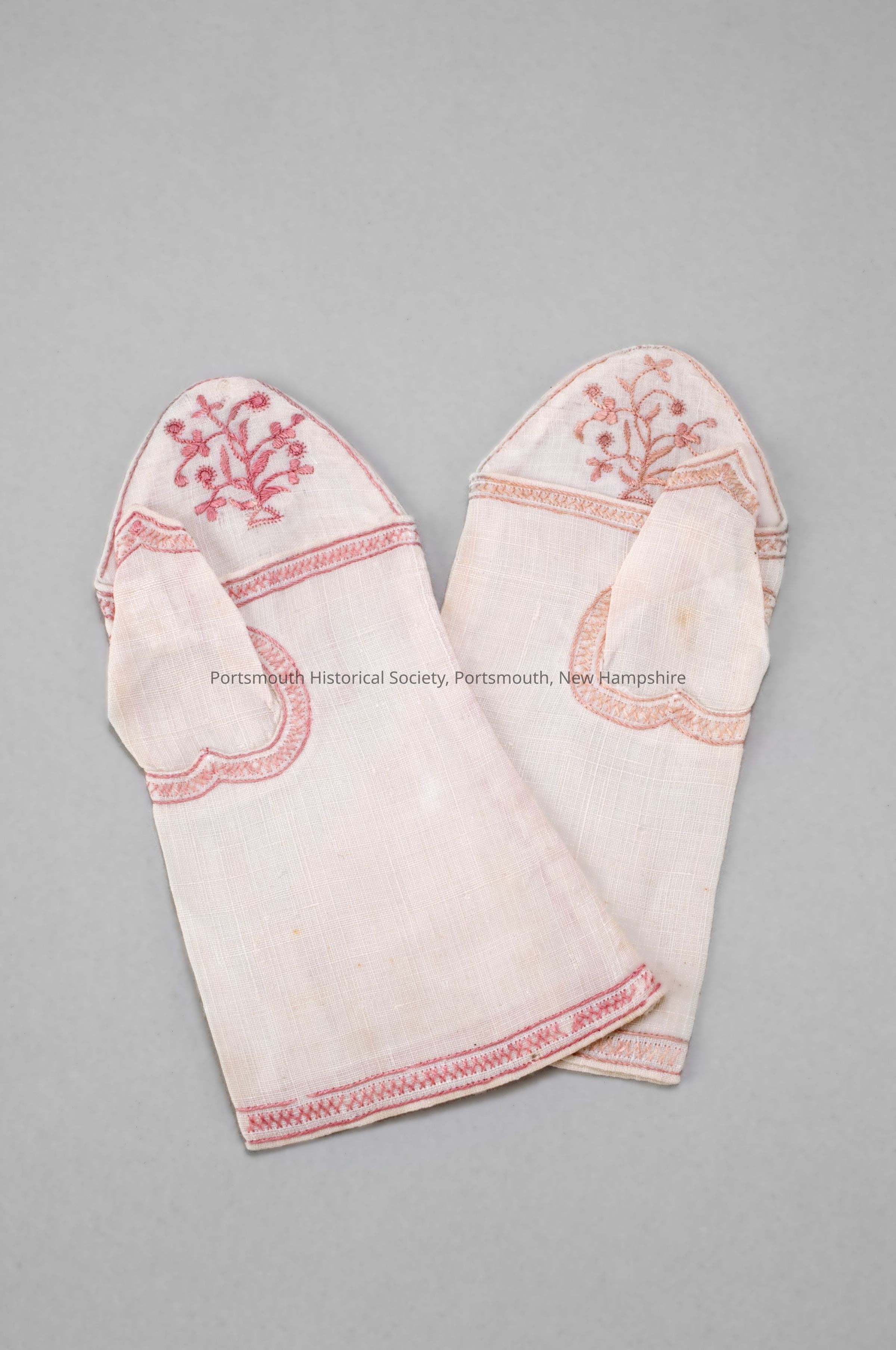 Embroidered pink on white cotton infants mittens. Mittens have open finger hole and are rounded at the finger end. Embroidered around edge.Acquisition