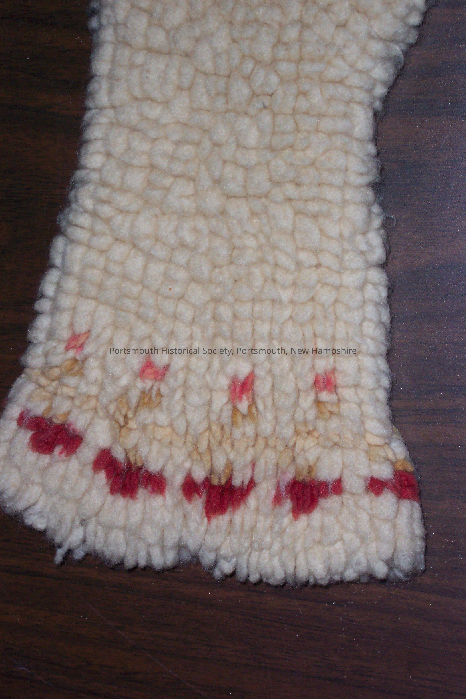 Pair of Colonial shag mittens, white with pink trim. Mittens were knit and then loops of yarn were woven in the knit to create the shag look (hand-hooked). In the diary of Ruth Henshaw Bascom it is noted that mittens of this type were made in 1801 and were “in new style.” There are several such mittens in the collection of Old Sturbridge Village, however they are quite rare.Acquisition
