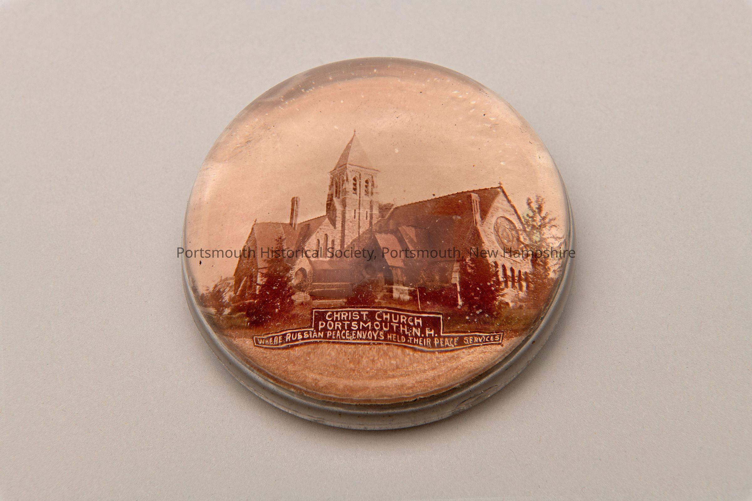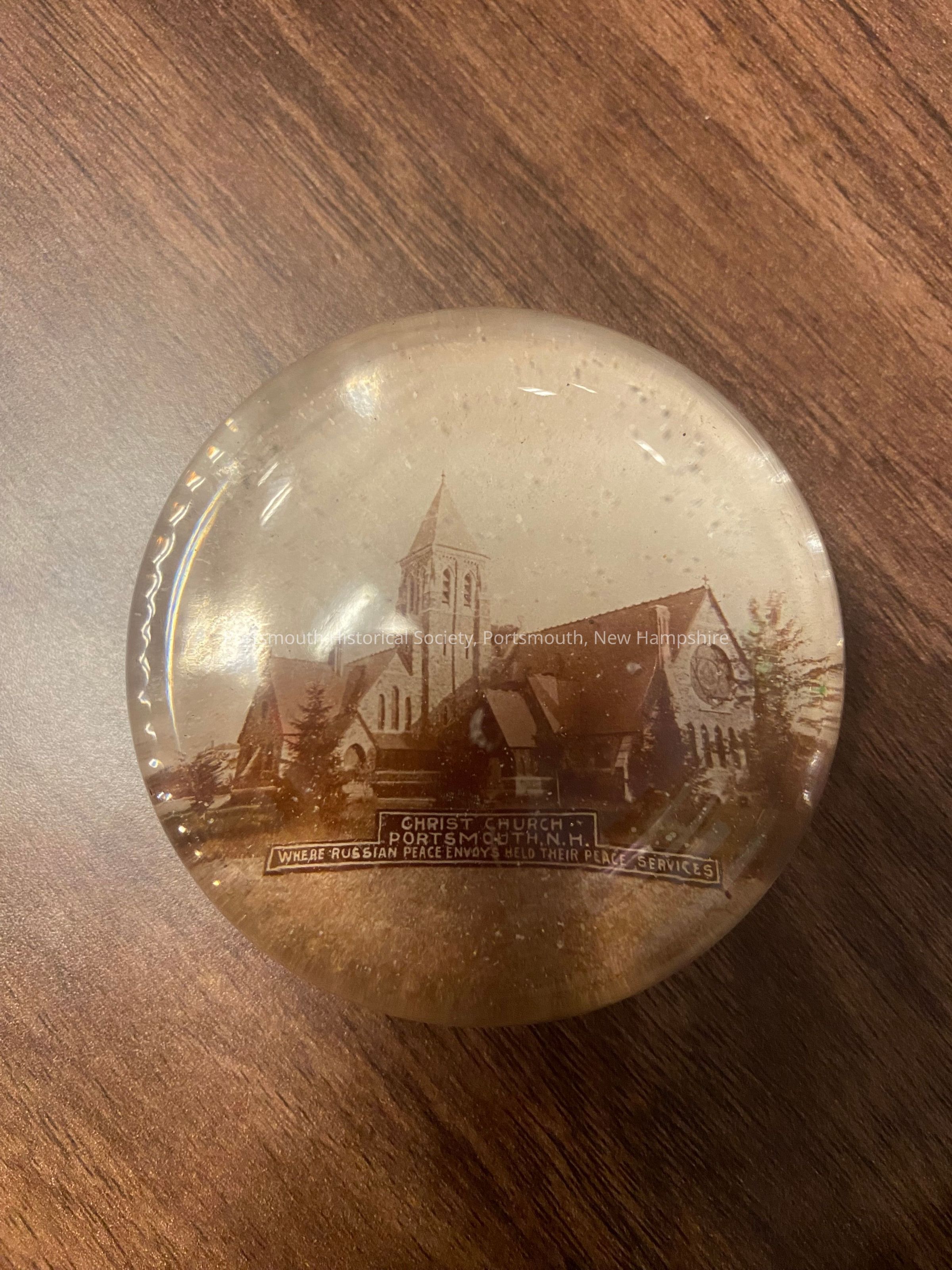 Glass paperweight with photograph of Christ Church, where the Russian delegates for the Russo-Japanese peace negotiations would attend service while in Portsmouth. The legend below the photo reads: "CHRIST CHURCH / PORTSMOUTH, N.H. / WHERE RUSSIAN PEACE ENVOYS HELD THEIR PEACE SERVICES"Collection